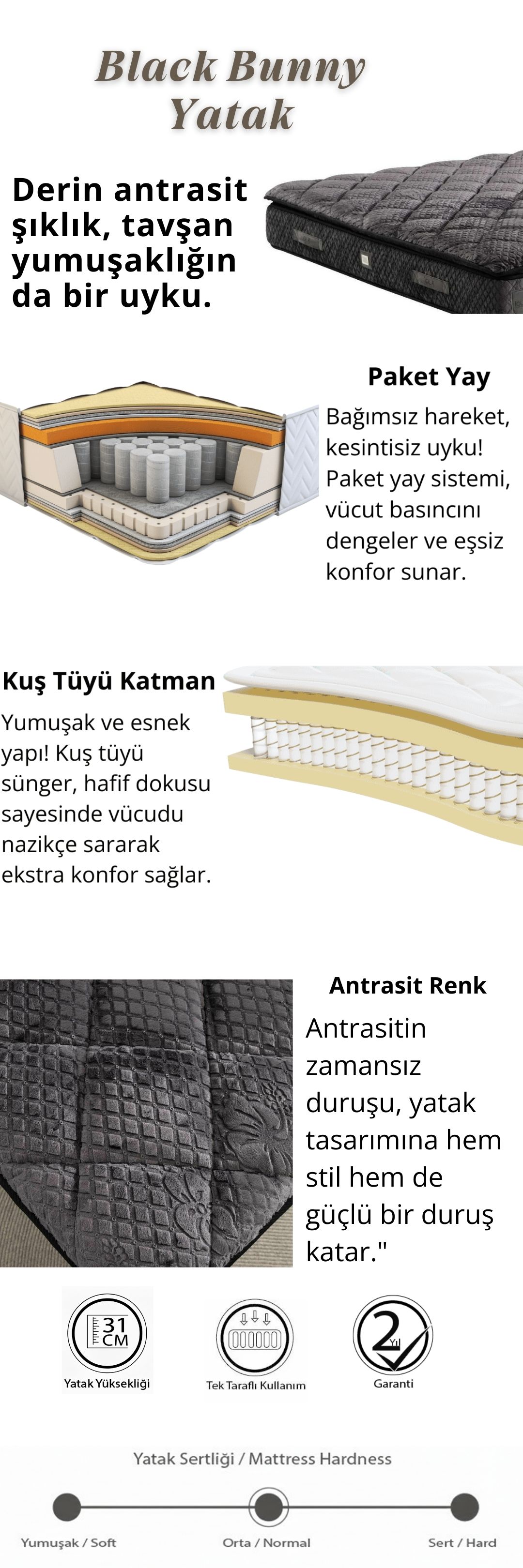 Konfor ve şıklığı bir arada sunan Black Bunny Yatak, orta sertlik yapısı ile dengeli bir uyku deneyimi sağlar. 31 cm yüksekliği ve şık antrasit rengi ile yatak odalarınıza estetik bir dokunuş katar.