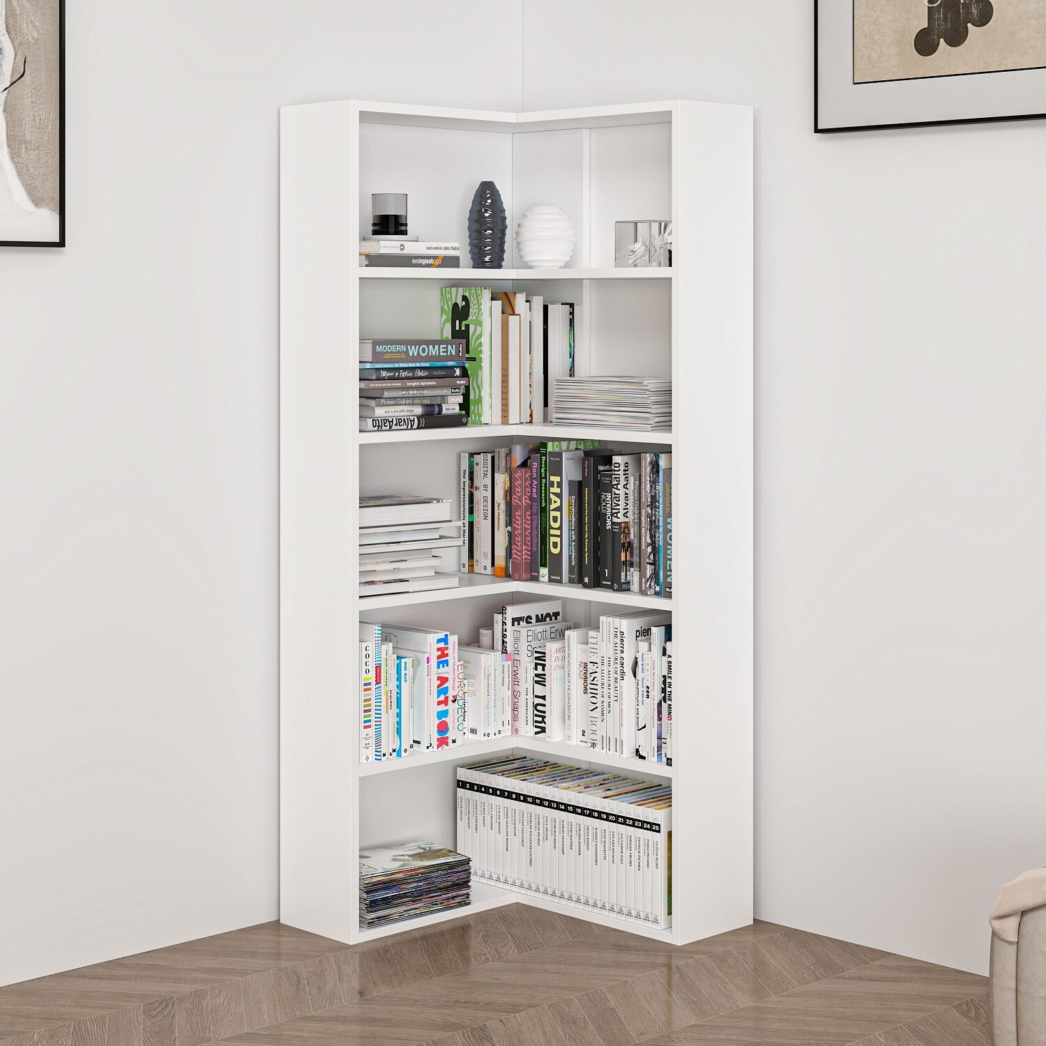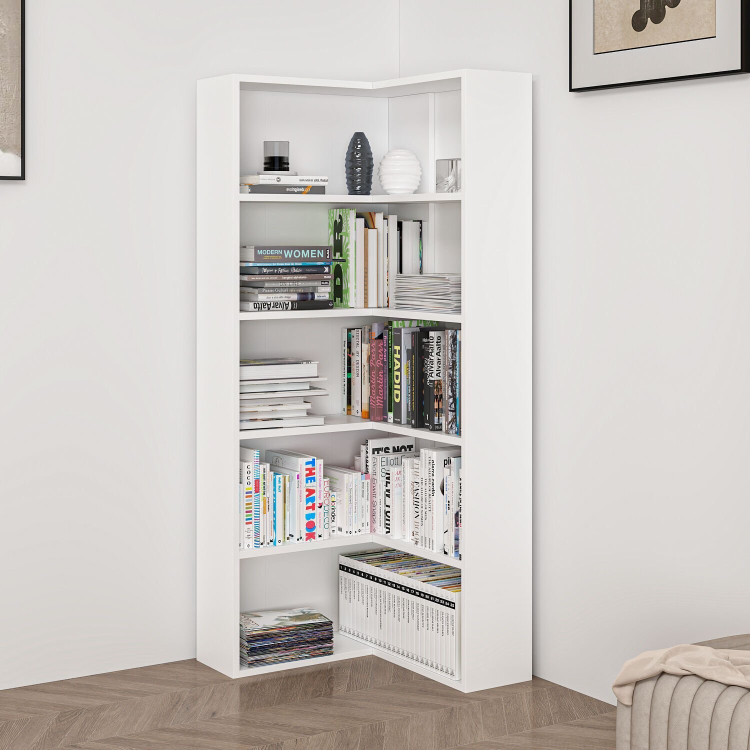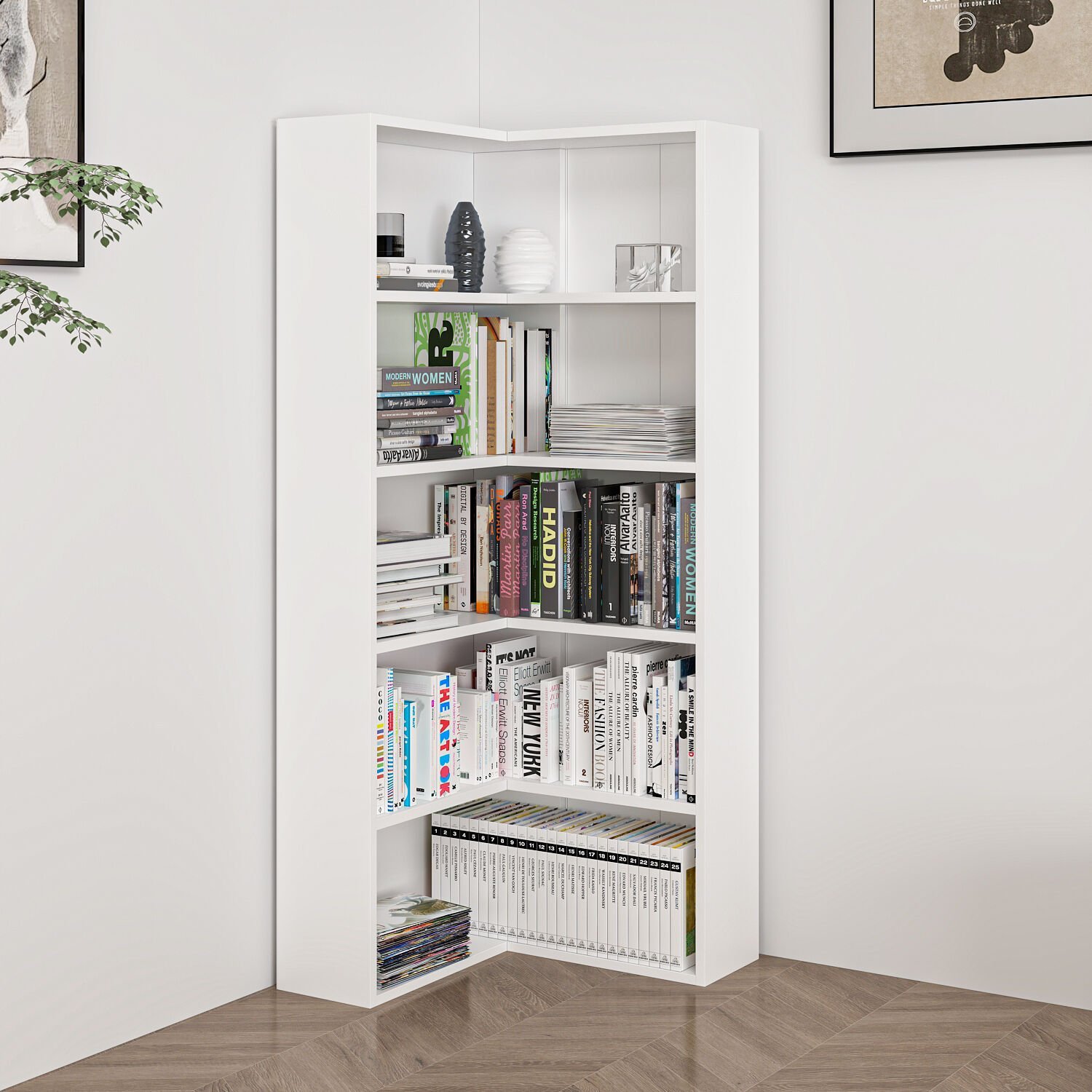 L köşe tasarımıyla odanın köşelerini verimli kullanan Adel 4 Raflı Köşe Kitaplık, şık beyaz rengiyle modern dekorasyonlara uyum sağlar.