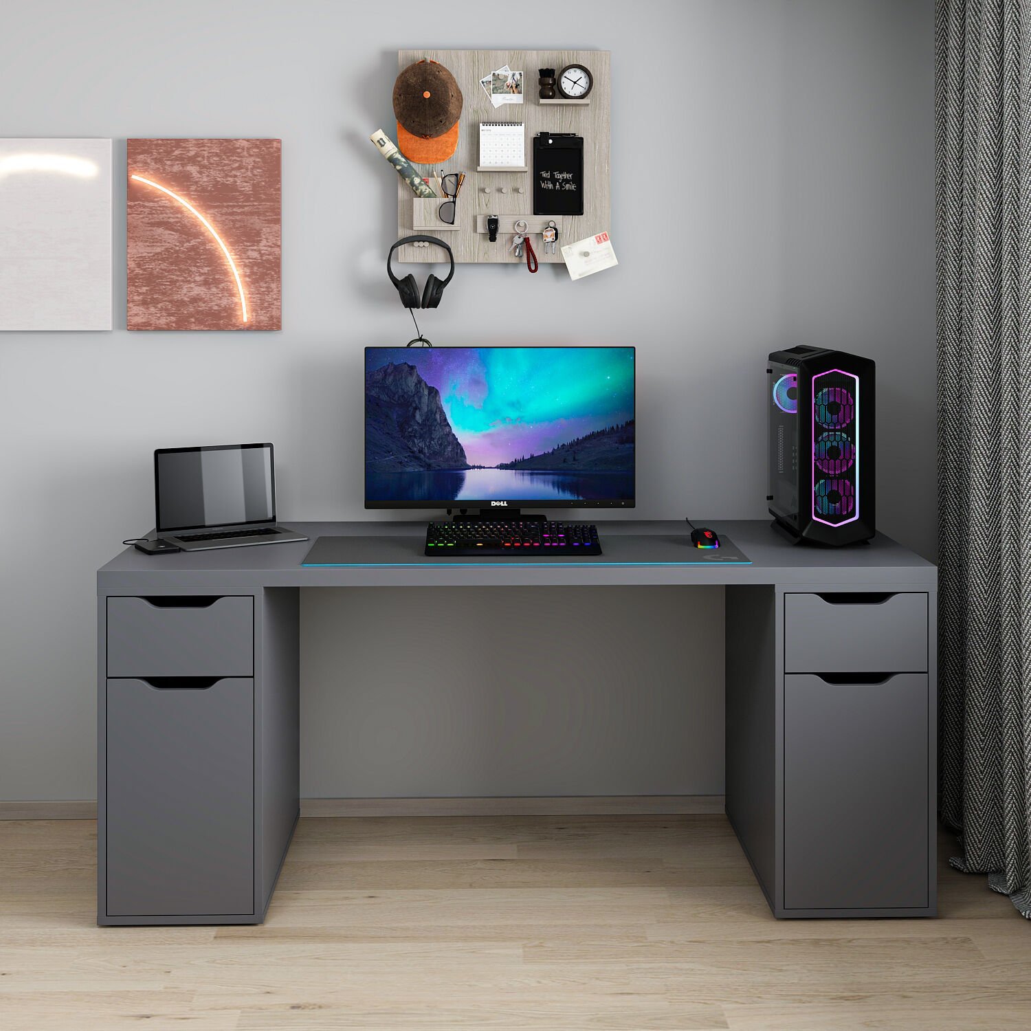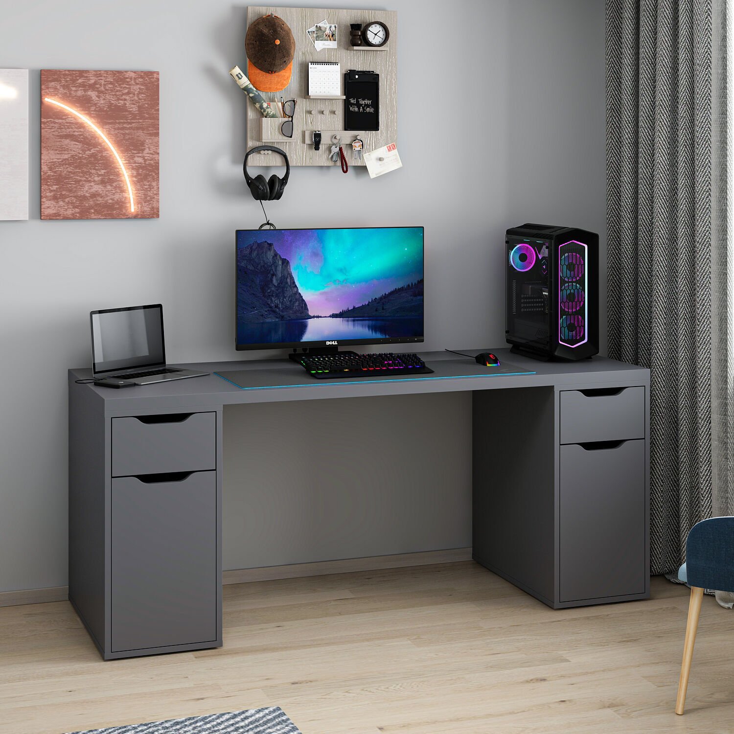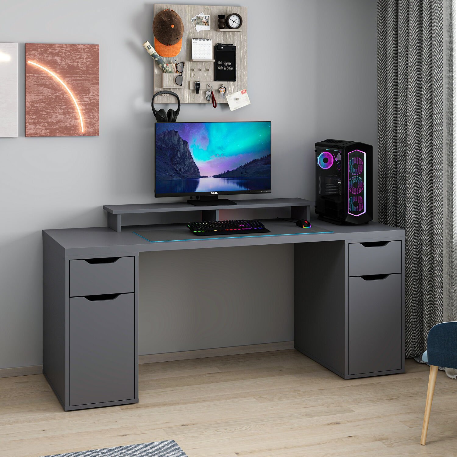 Alen Çalışma ve Oyuncu Masası, modern tasarımı ve fonksiyonel yapısıyla çalışma alanınızı düzenli ve şık tutar. 2 çekmecesi ve 2 dolabıyla eşyalarınızı kolayca saklayabilir, isteğe bağlı monitor rafıyla ekranınızı ergonomik bir şekilde konumlandırabilirsiniz. Şık antrasit rengiyle modern bir görünüm sunar.