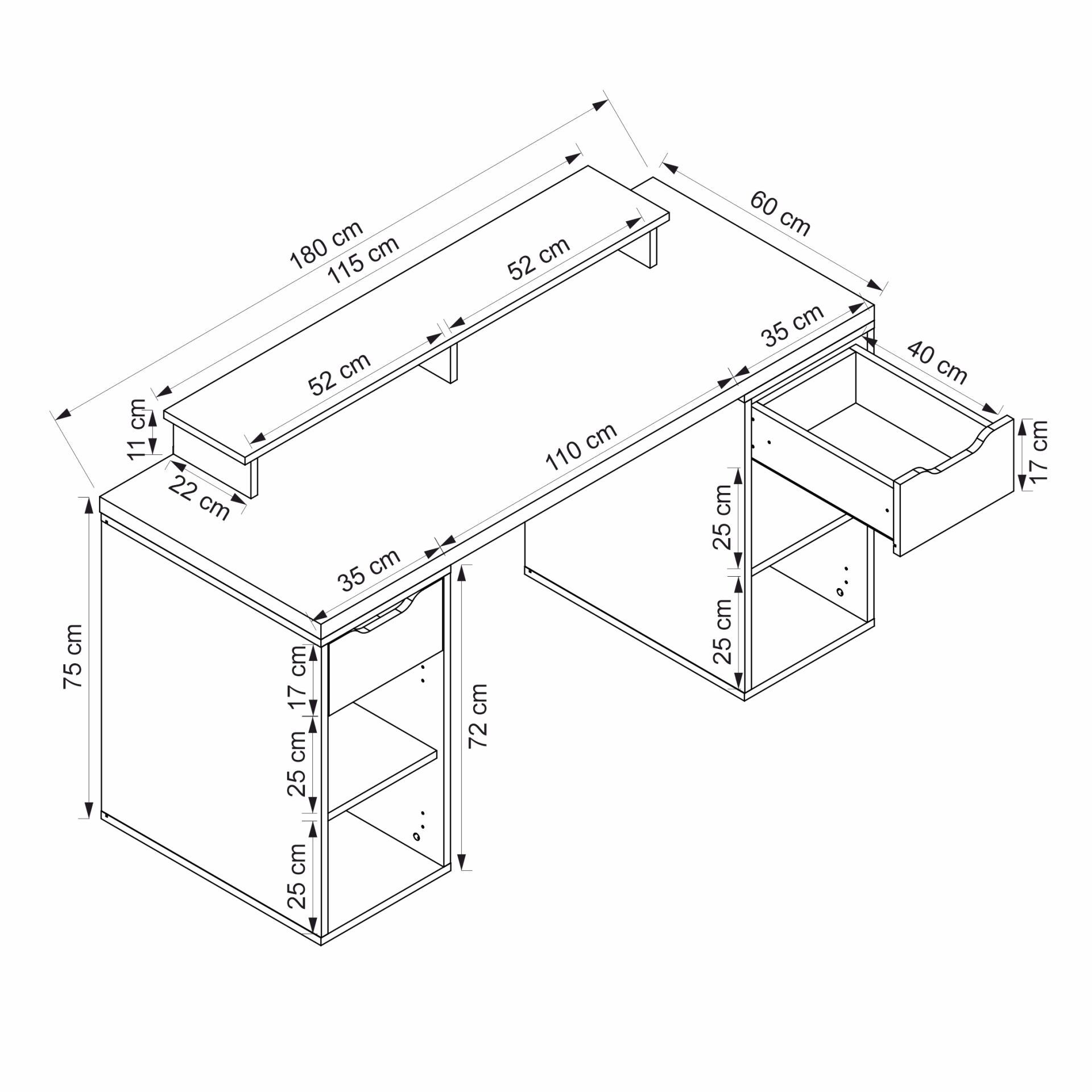 - Genişlik: 180 cm, geniş çalışma alanı
