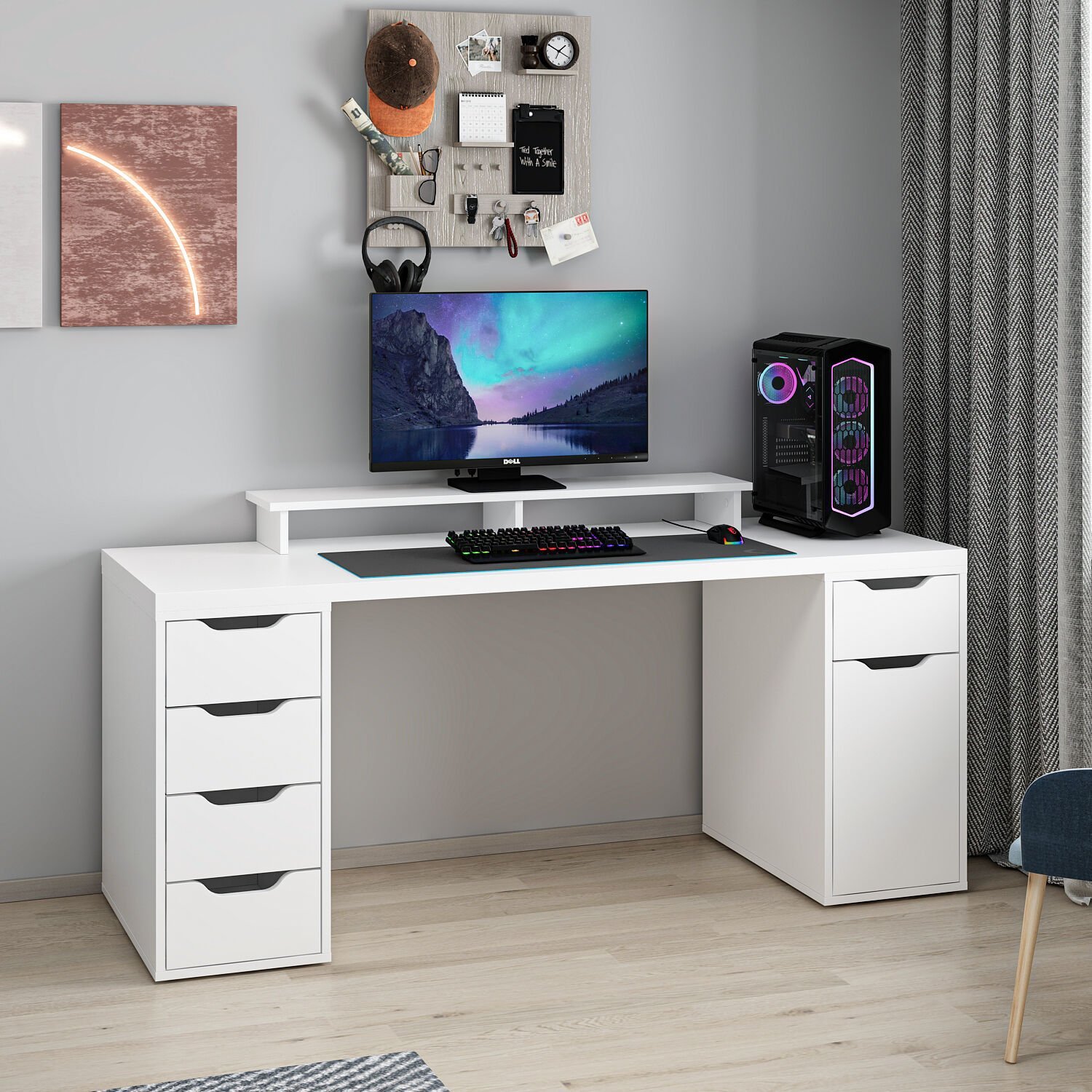 Alen Çalışma ve Oyuncu Masası, şık beyaz tasarımı ve fonksiyonel yapısıyla hem iş hem oyun için ideal bir alan sunar. 5 çekmece ve 1 dolabı sayesinde tüm eşyalarınızı düzenli tutabilir, isteğe bağlı monitor rafı ile ekranınızı ergonomik olarak yerleştirebilirsiniz. 75 cm yüksekliği ve 60 cm derinliği ile rahat bir kullanım sağlar.