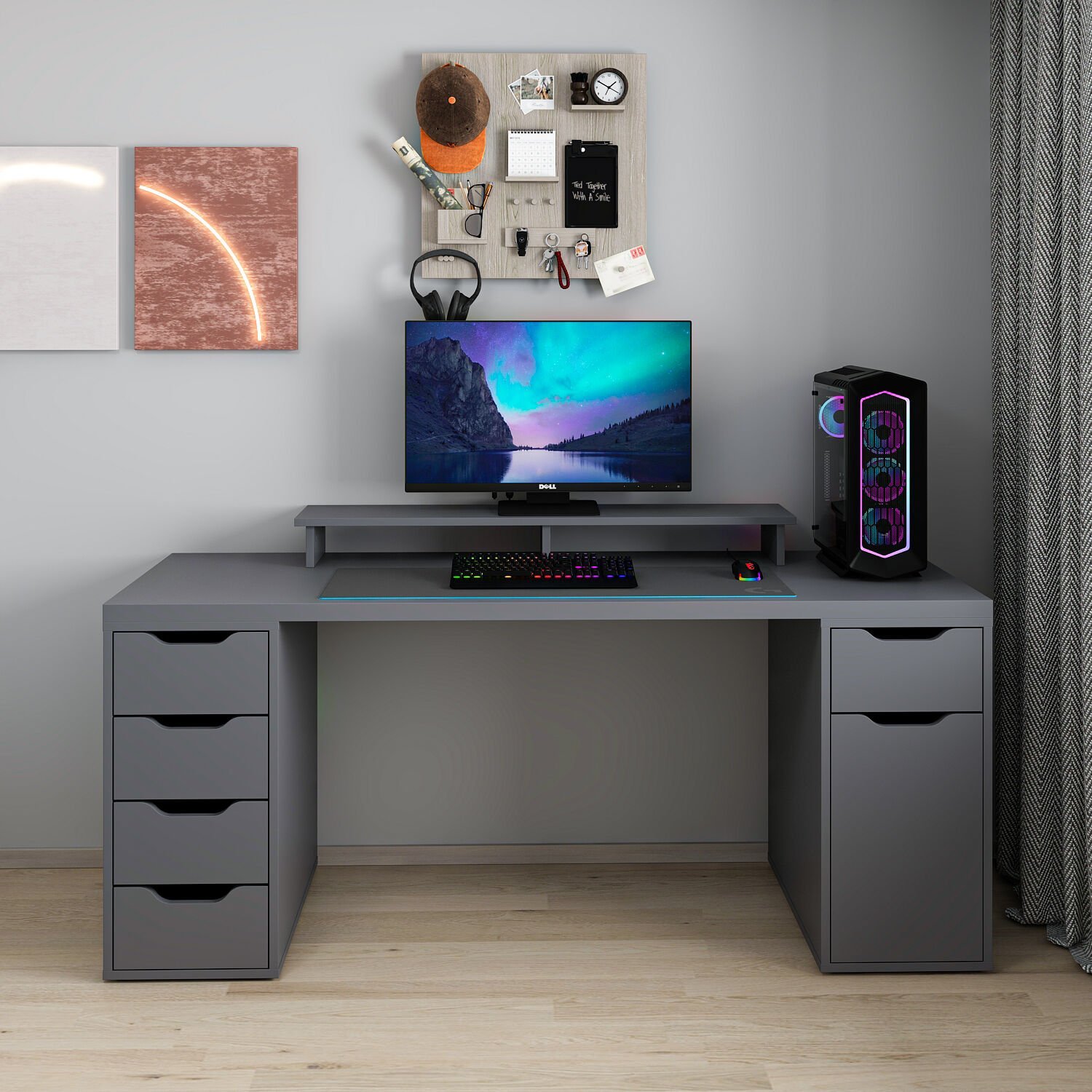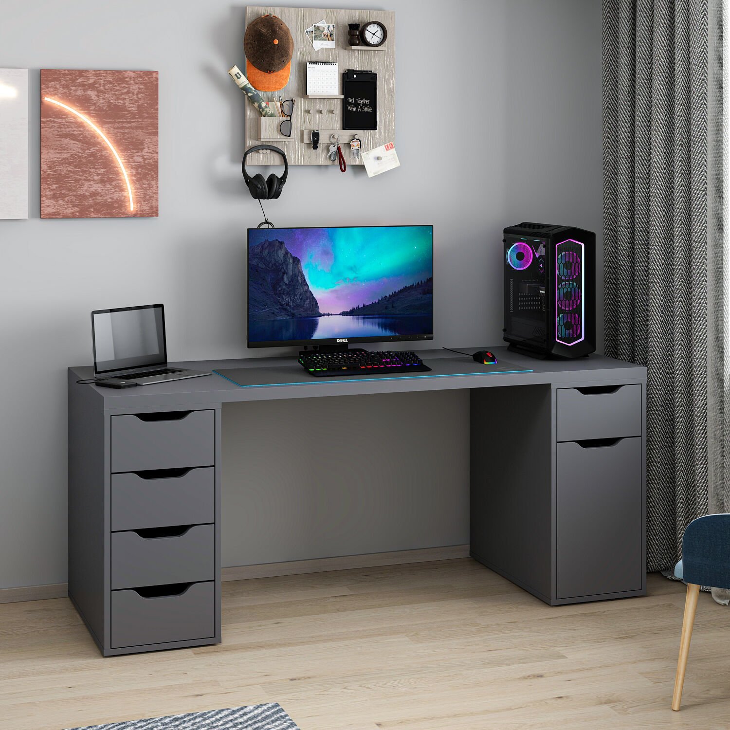 Alen Çalışma ve Oyuncu Masası, şık beyaz tasarımı ve fonksiyonel yapısıyla hem iş hem oyun için ideal bir alan sunar. 5 çekmece ve 1 dolabı sayesinde tüm eşyalarınızı düzenli tutabilir, isteğe bağlı monitor rafı ile ekranınızı ergonomik olarak yerleştirebilirsiniz. Şık antrasit rengiyle modern bir görünüm sunar.