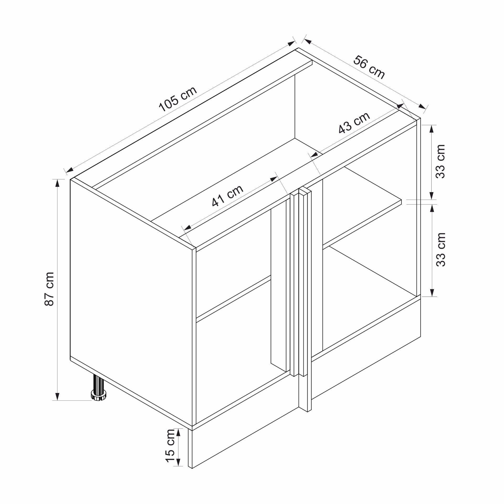 Köşe alt mutfak dolabı, mutfakta genellikle atıl kalan köşe alanlarını verimli şekilde değerlendirmek için tasarlanmıştır. Tezgâh altına uyumlu formu sayesinde köşe noktalarında maksimum depolama alanı sunar. Tencere, tava ve büyük mutfak gereçlerini düzenli biçimde saklamaya yardımcı olarak mutfakta kullanım kolaylığı sağlar.