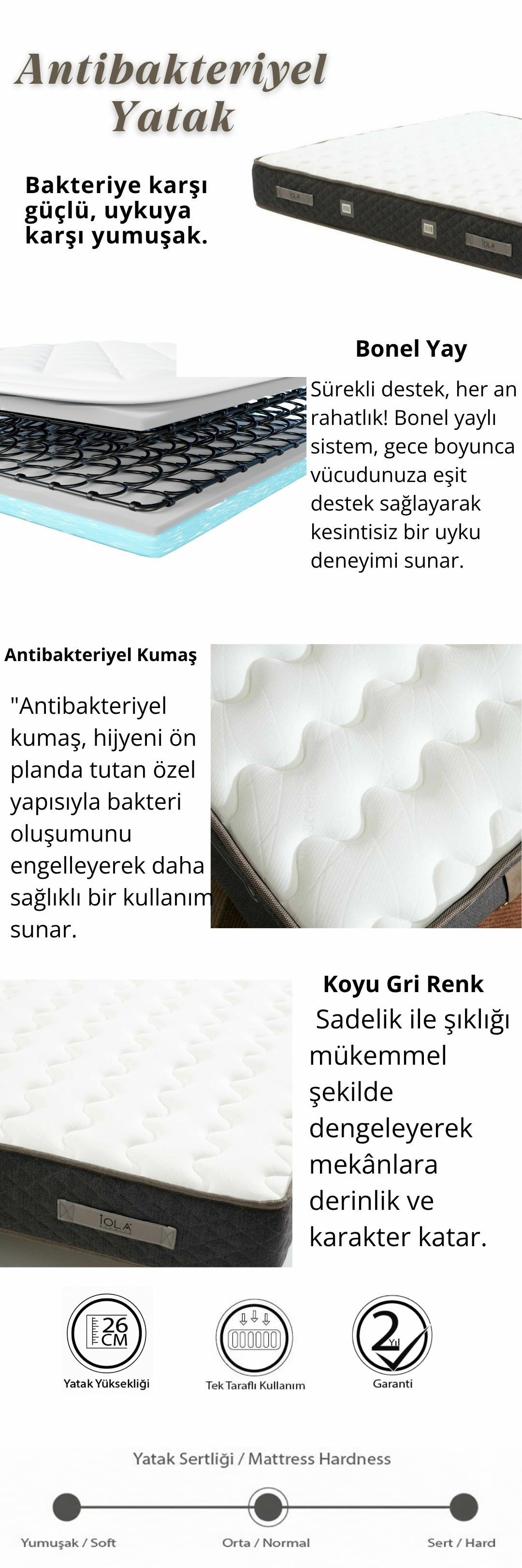 İola'nın Technology Serisi'nden Antibakteriyel kapitone kumaşı ile tasarlanmış özel bir yatak sunar. Bu yatak, hijyenik, doğal içerikli ve boyun-sırt problemleri yaşayanlar için özel olarak tasarlanmıştır.