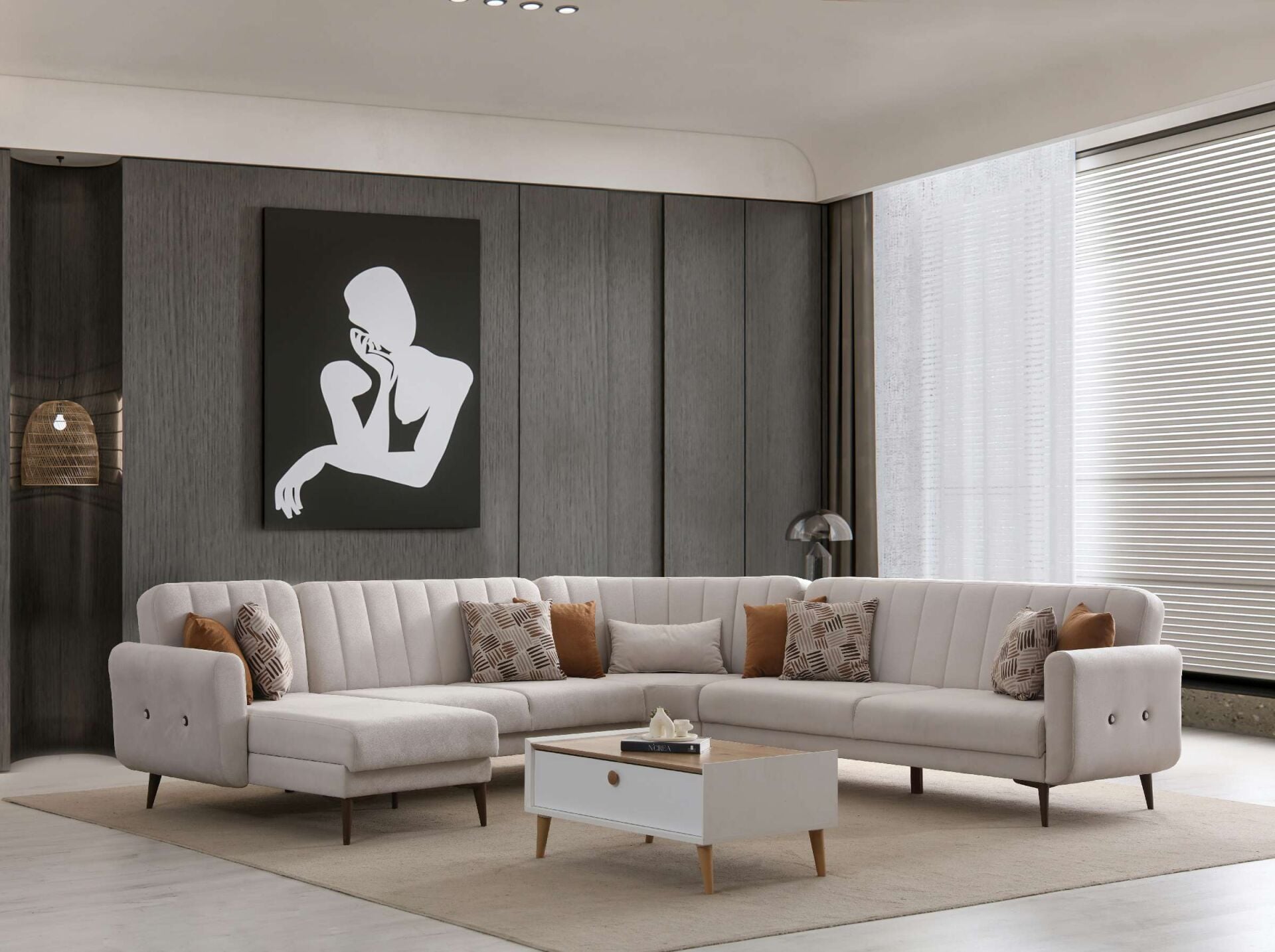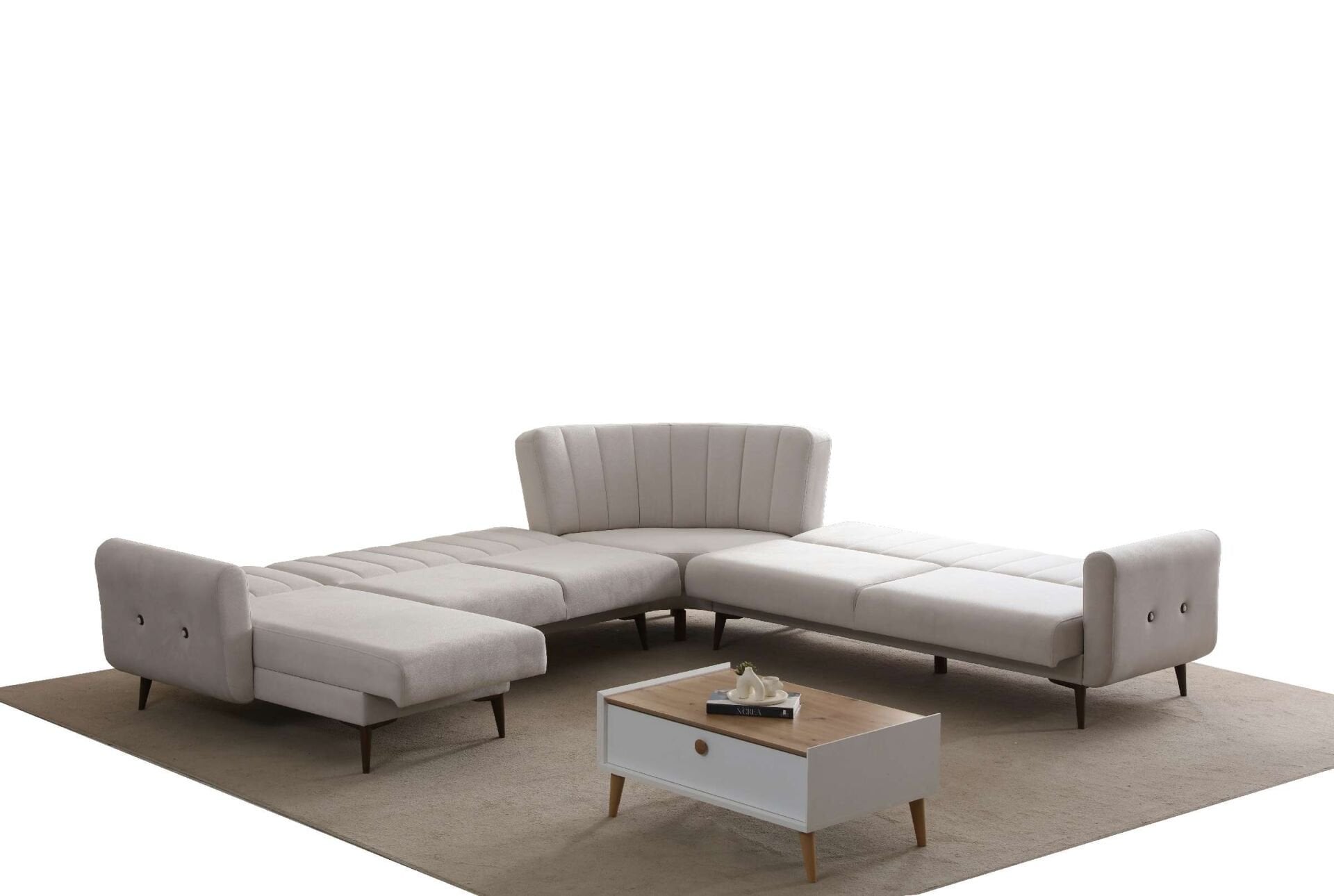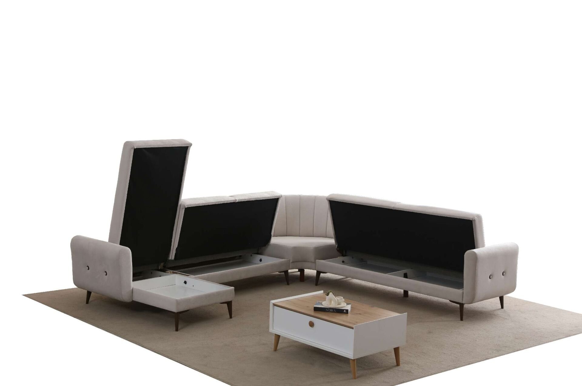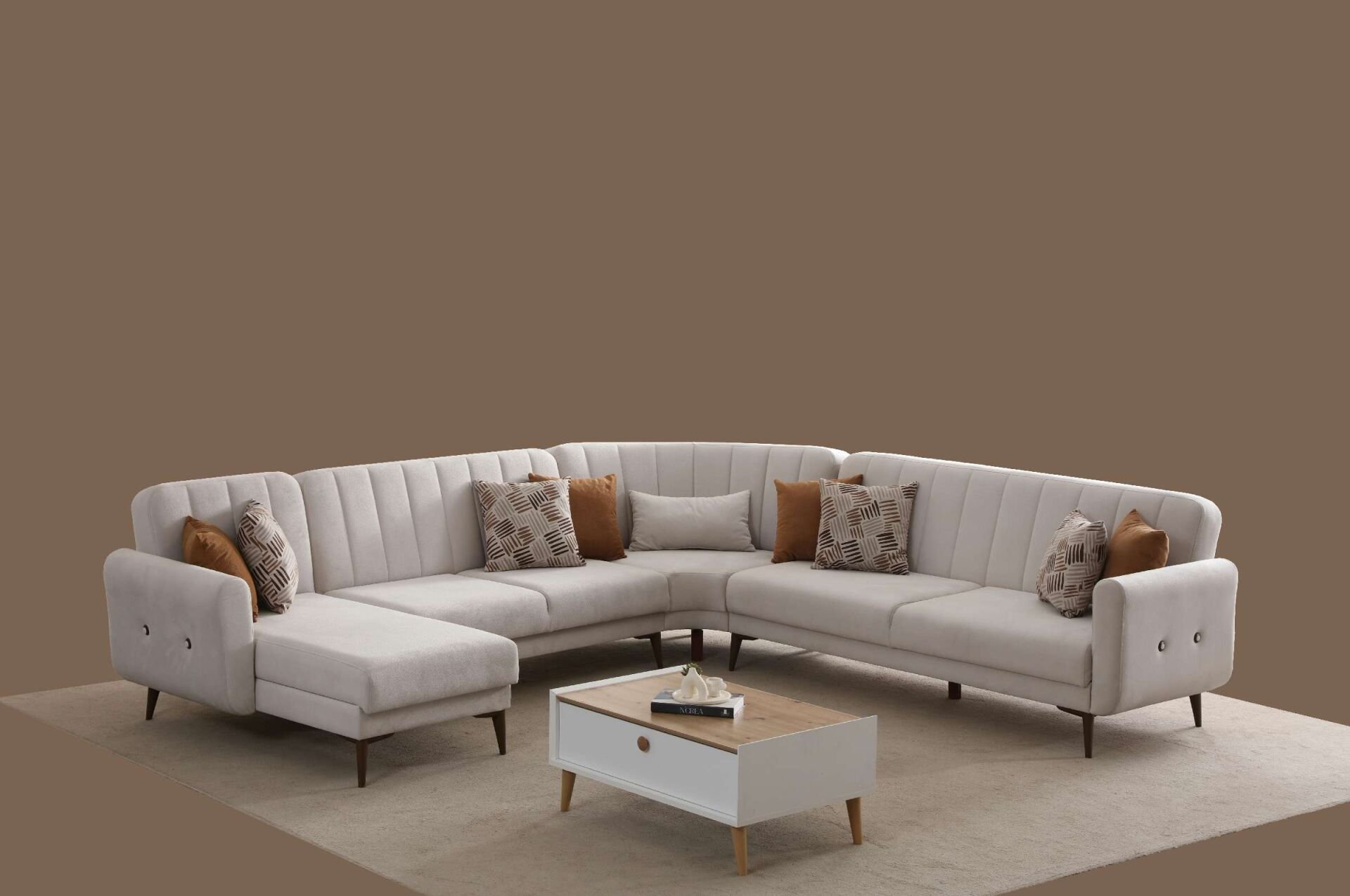 Bona Dinlenme+3+C Köşe+2 Köşe Takımı, modern tasarımı, geniş ve konforlu oturum alanı ile yaşam alanlarınıza şıklık ve rahatlık katıyor. Yatak olabilme özelliği ve sandıklı saklama alanı ile kullanım kolaylığı sunarken, bej Valebo-03 dokuma kumaşı ve ceviz renkli ayaklarıyla dekorasyonunuza zarif bir dokunuş ekliyor.
