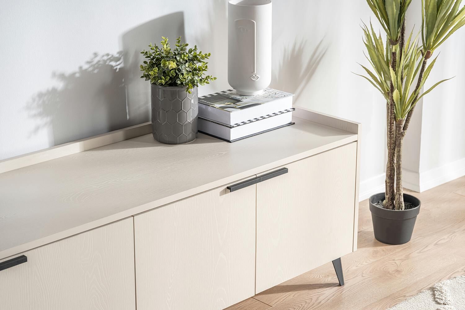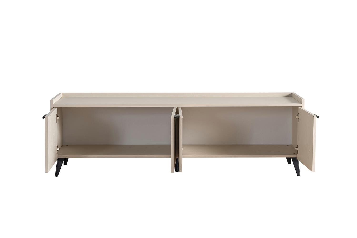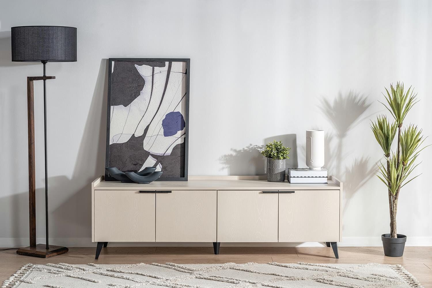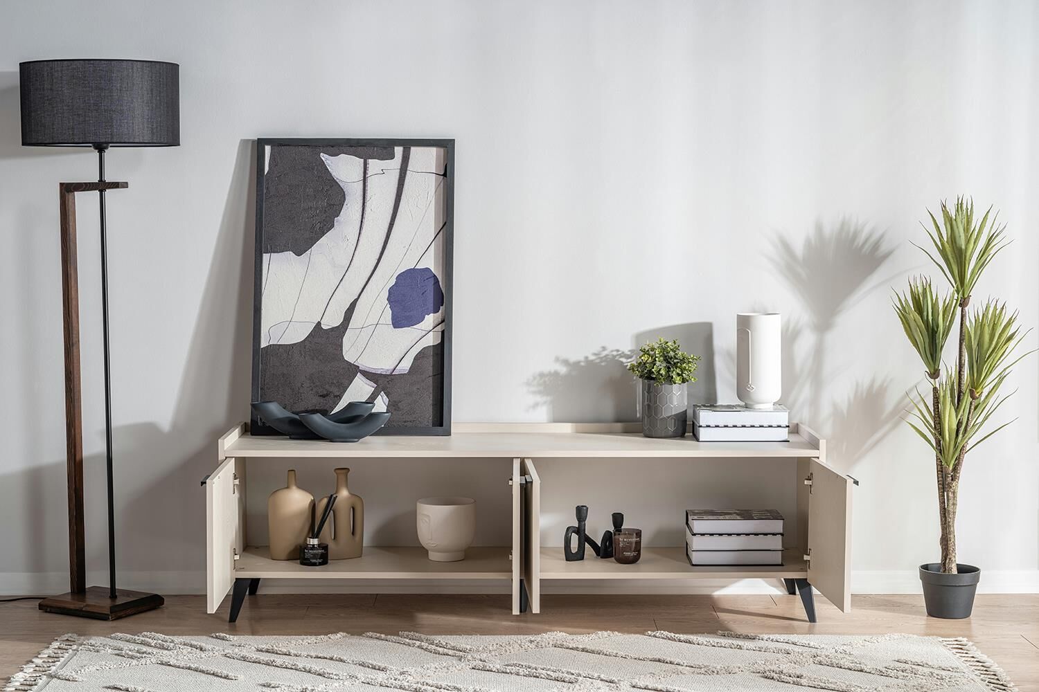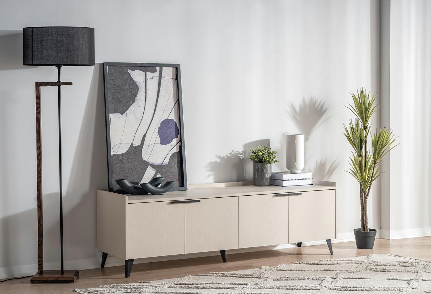 Ayaklı tasarımı, temizlik kolaylığı sağlarken robot süpürgelerin rahat geçişine imkan tanır. Kapaklı raf bölmeleri sayesinde medya ekipmanlarınızı, kitaplarınızı ve dekoratif objelerinizi düzenli bir şekilde yerleştirebilirsiniz. Vizon bej tonları ise mobilyalarla kolay uyum sağlayarak her stile adapte olur.