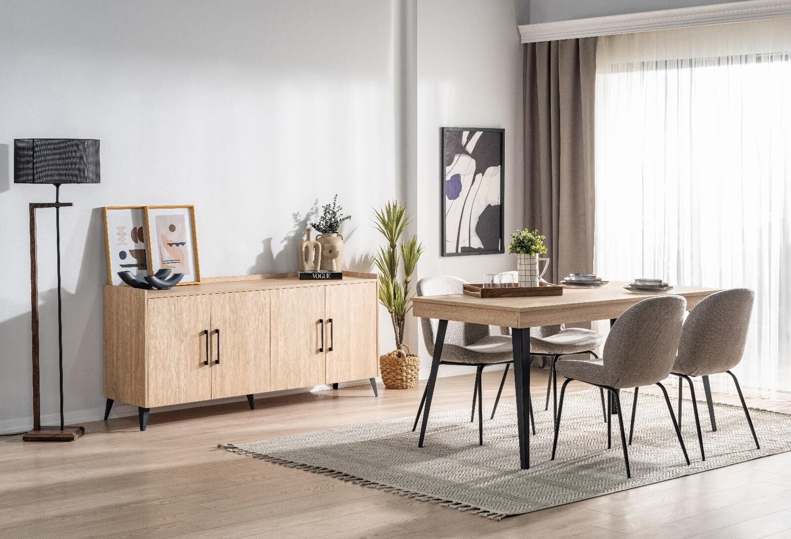 Cera Yemek Odası Ebru, odern ve şık tasarımıyla yemek alanlarınızı tamamlayan Cera Yemek Odası Takımı, Ebru rengindeki konsol ve yemek masası ile antrasit renkli sandalyelerden oluşur. Takım, estetik görünüm ve konforlu kullanım sunar.