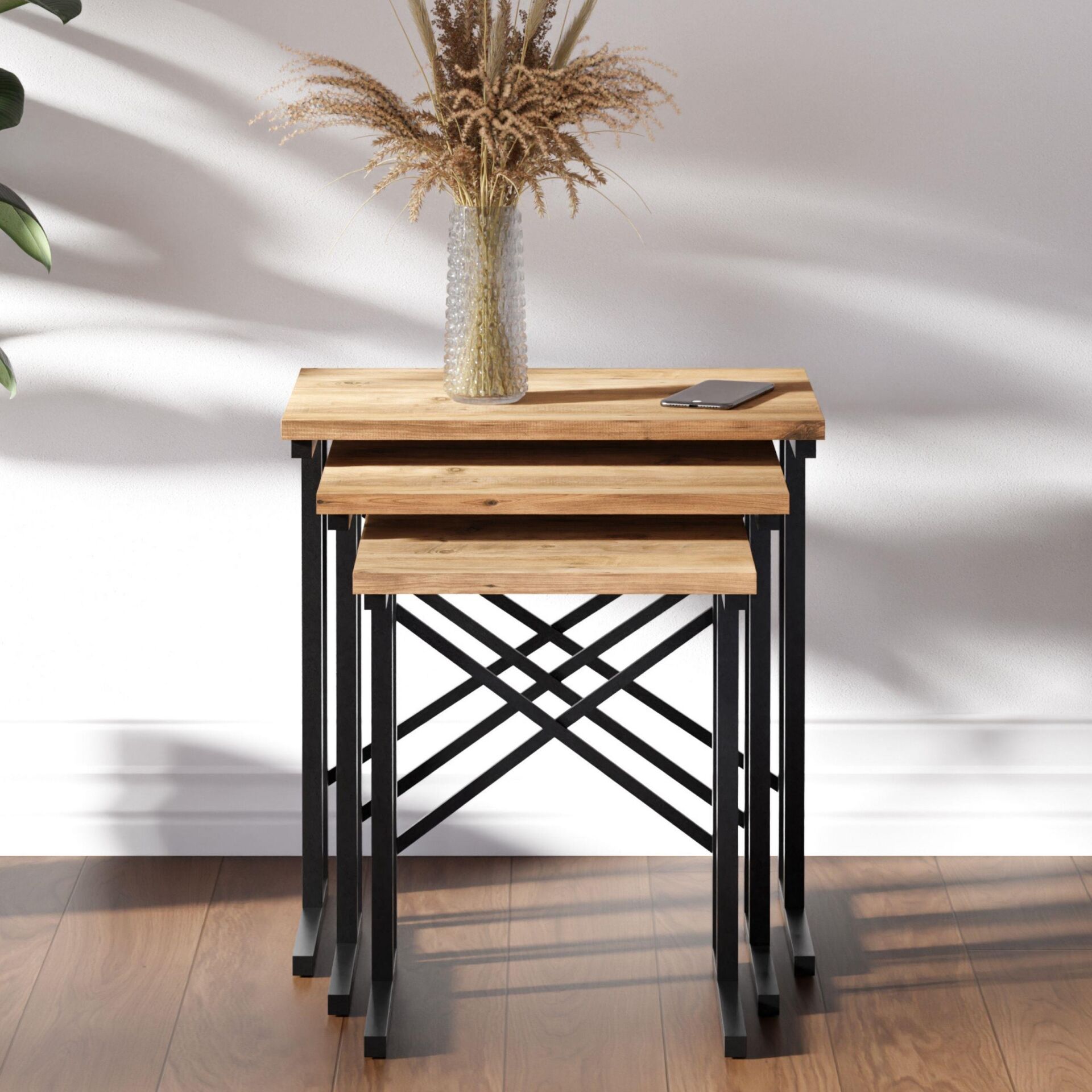 Cera ZG2 Metal Ayaklı Zigon Sehpa – Çam, sıcak Çam rengi tabla ve modern siyah metal ayaklarıyla yaşam alanlarınıza hem estetik hem de fonksiyonel bir dokunuş katar. Üçlü sehpa seti, misafir ağırlarken, çay-kahve sunumlarında veya dekoratif amaçlı kullanımda pratiklik sağlar.