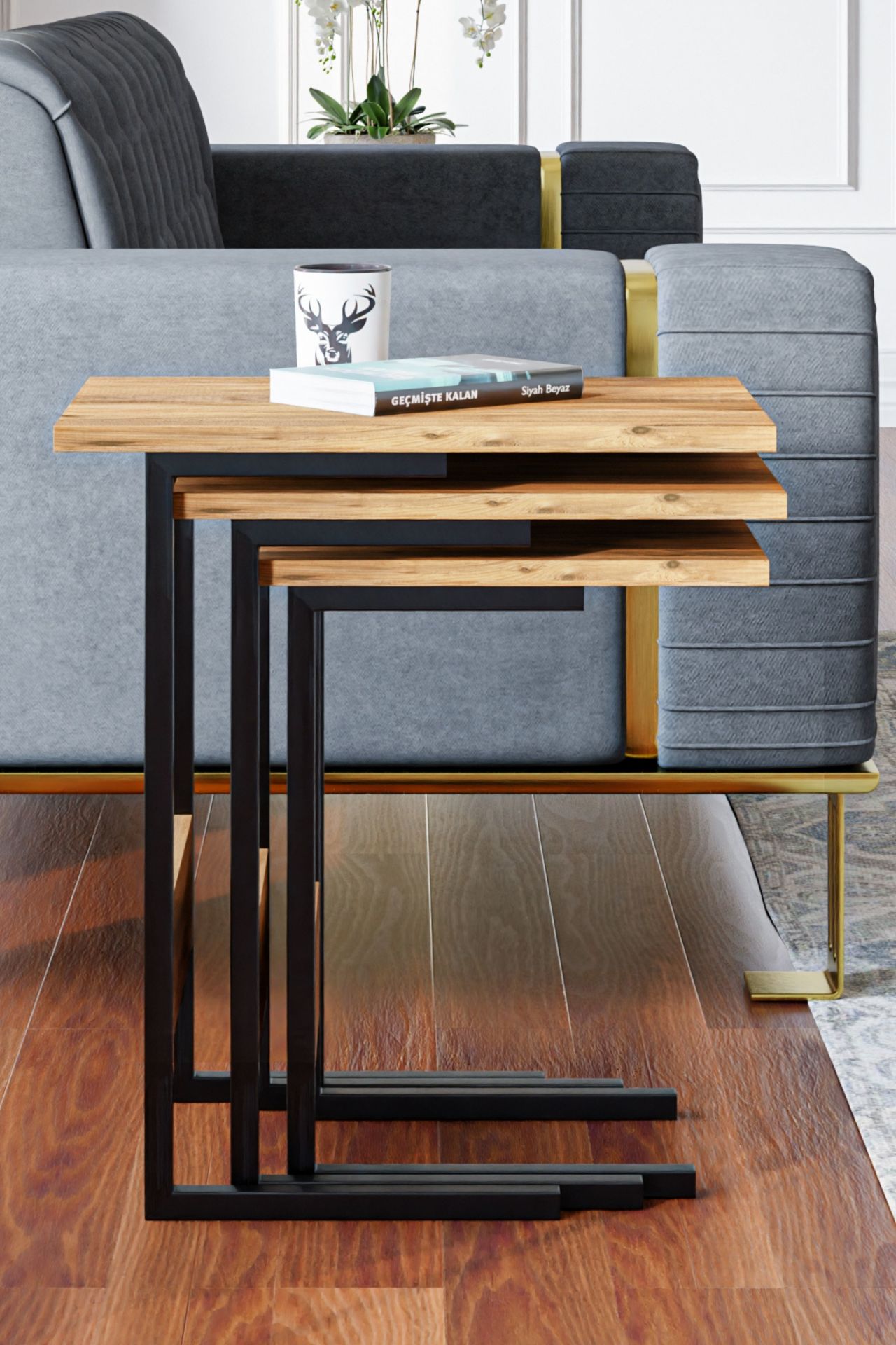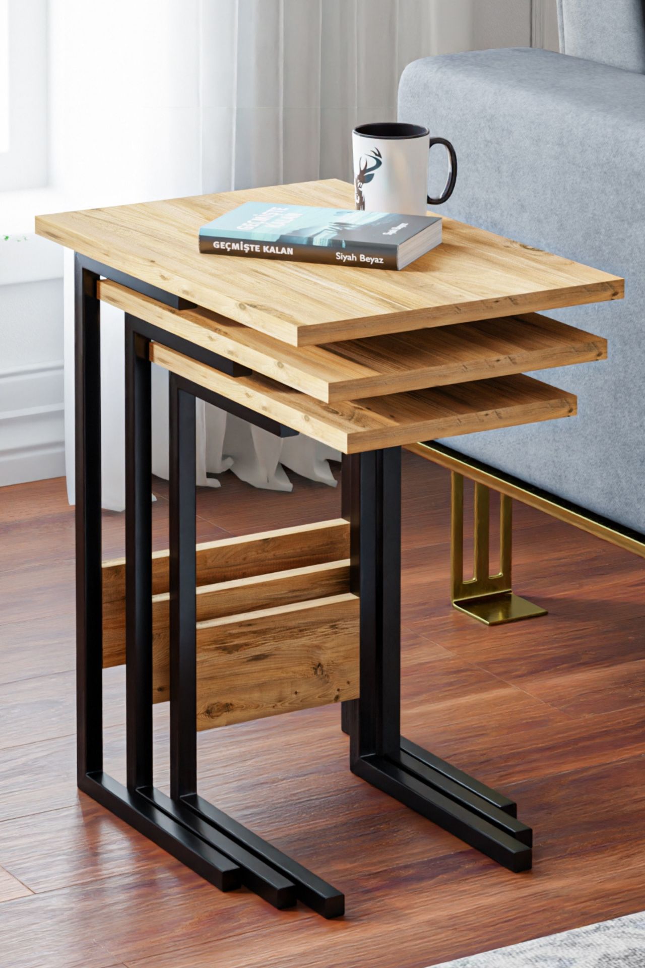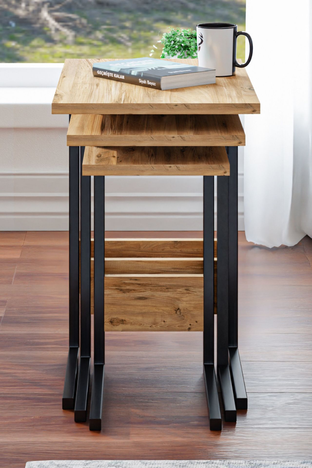 Cera ZG3 3’lü Eko Zigon Sehpa – Atlantik Çam, sıcak Atlantik Çam rengi tabla ve modern siyah metal ayaklarıyla yaşam alanlarınıza hem estetik hem de fonksiyonel bir dokunuş katar. Üçlü sehpa seti, misafir ağırlarken, çay-kahve sunumlarında veya dekoratif amaçlı kullanımda pratiklik sağlar.