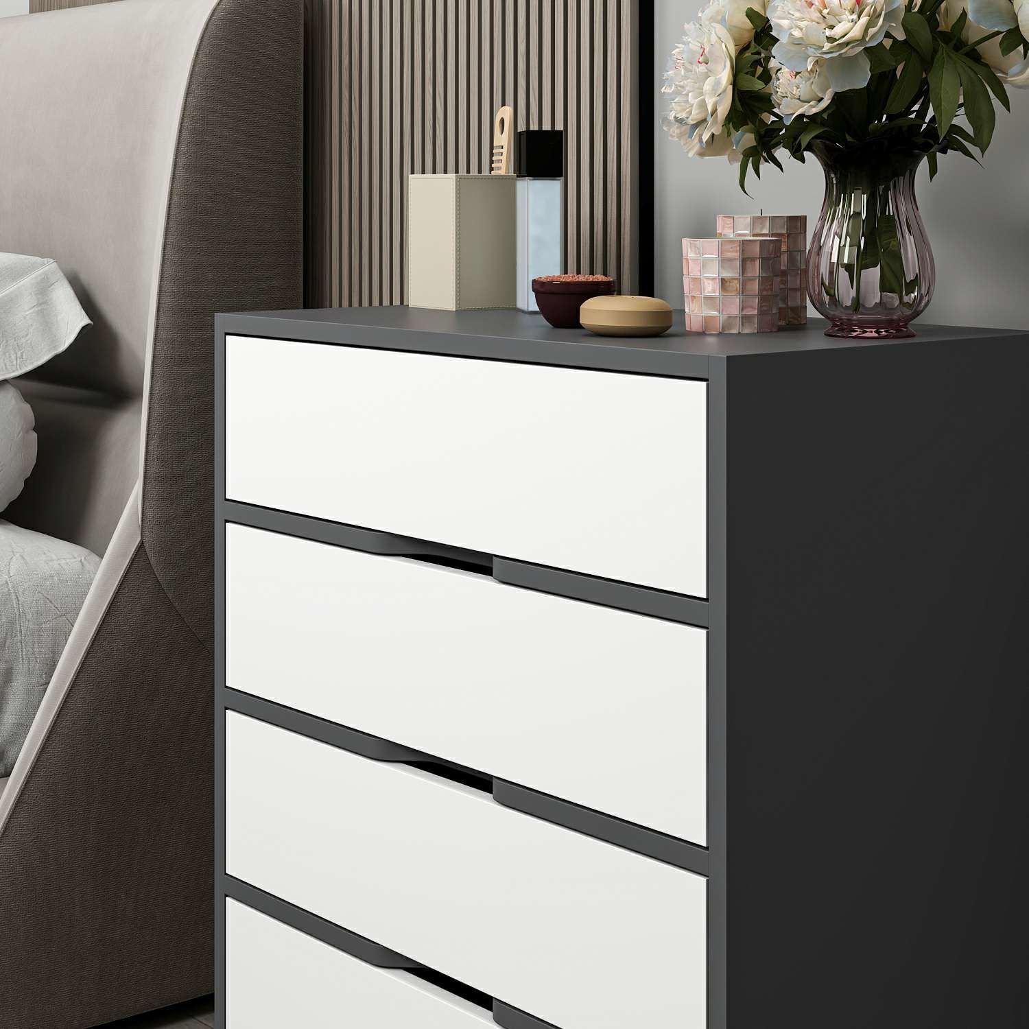 Elina Ayaklı 4 Çekmeceli Şifonyer - Antrasit/Beyaz, modern tasarımıyla hem fonksiyonel hem de estetik bir saklama çözümü sunar. Antrasitin güçlü ve sofistike duruşu ile beyazın ferah görünümü bir araya gelerek odanıza şık bir kontrast kazandırır.