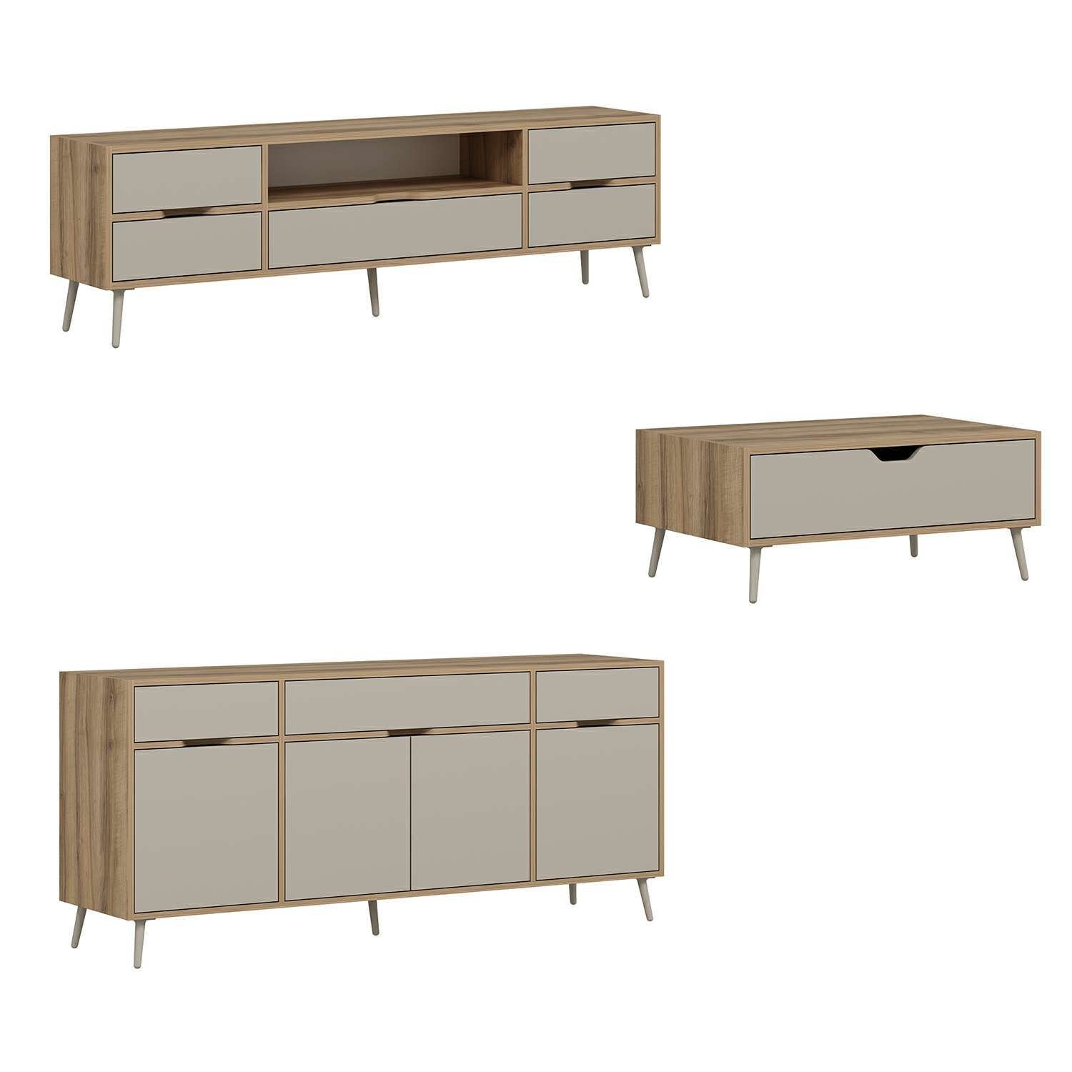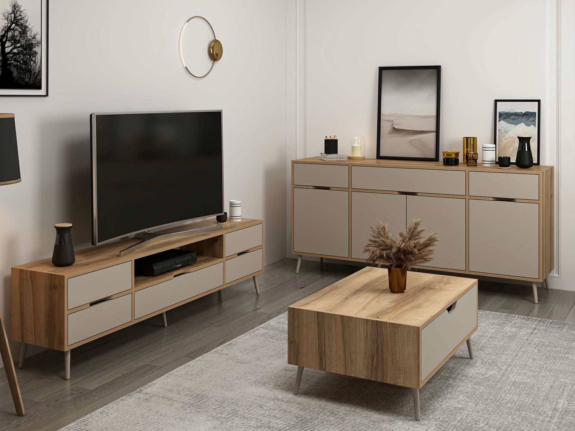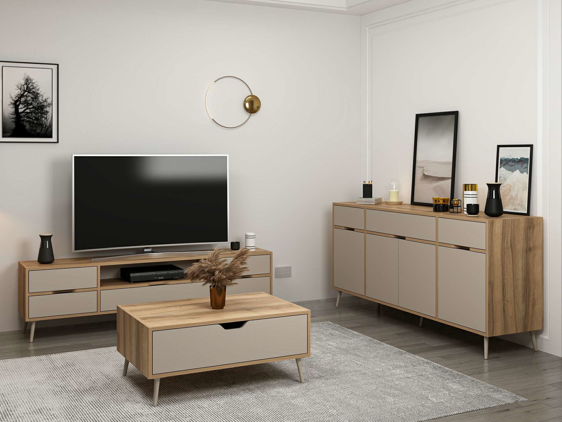 Elina Ayaklı Oturma Odası Set1 - Dore/Kumtaşı yüksek kalite melamin yüzeye sahip 18 mm yonga levhadan üretilmektedir.