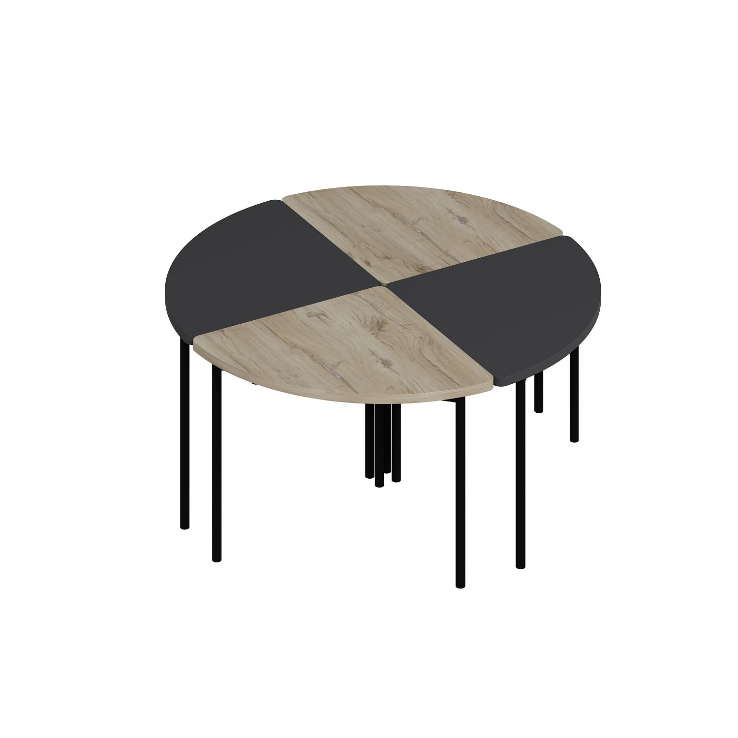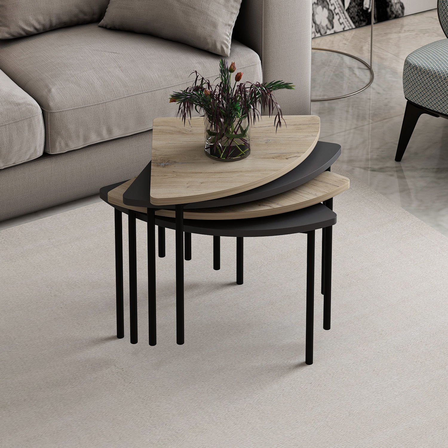 Emma Zigonlu Orta Sehpa- Senza/Antrasit Dört çeyrek parçadan oluşan ve birleştirildiğinde şık bir daire formu yaratan bu modüler orta sehpa seti, kullanım kolaylığı ve estetiği bir arada sunar. Parçalar ayrı ayrı yerleştirildiğinde alan tasarrufu sağlar ve farklı oturma düzenlerine uyum gösterir.