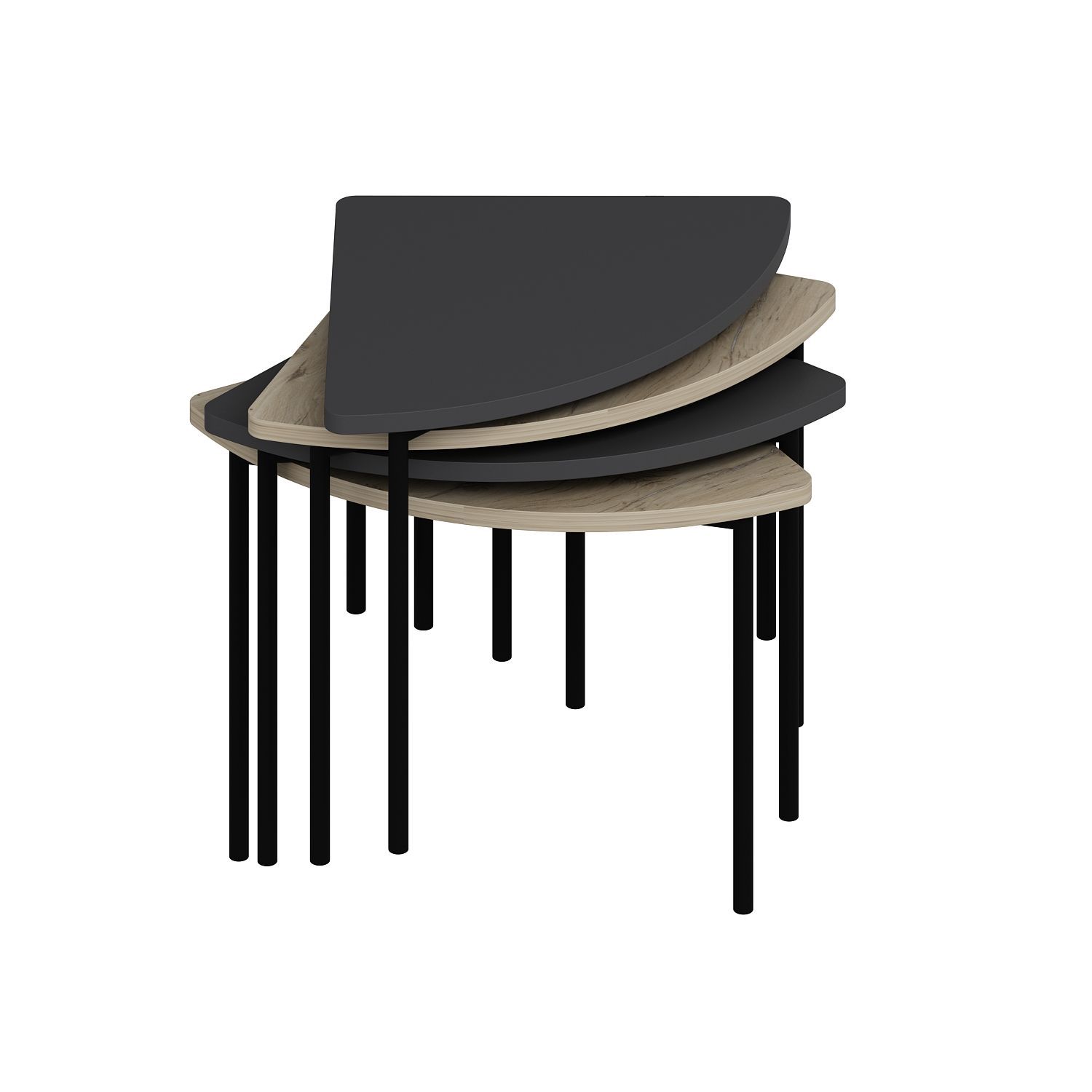 Sağlam metal bacaklarıyla modern bir duruş sergileyen bu sehpa seti, dört kişinin konforlu kullanımına olanak tanır. Hem işlevsel hem de şık olan bu tasarım, evinizin her köşesine uyum sağlayacak pratik bir çözümdür.