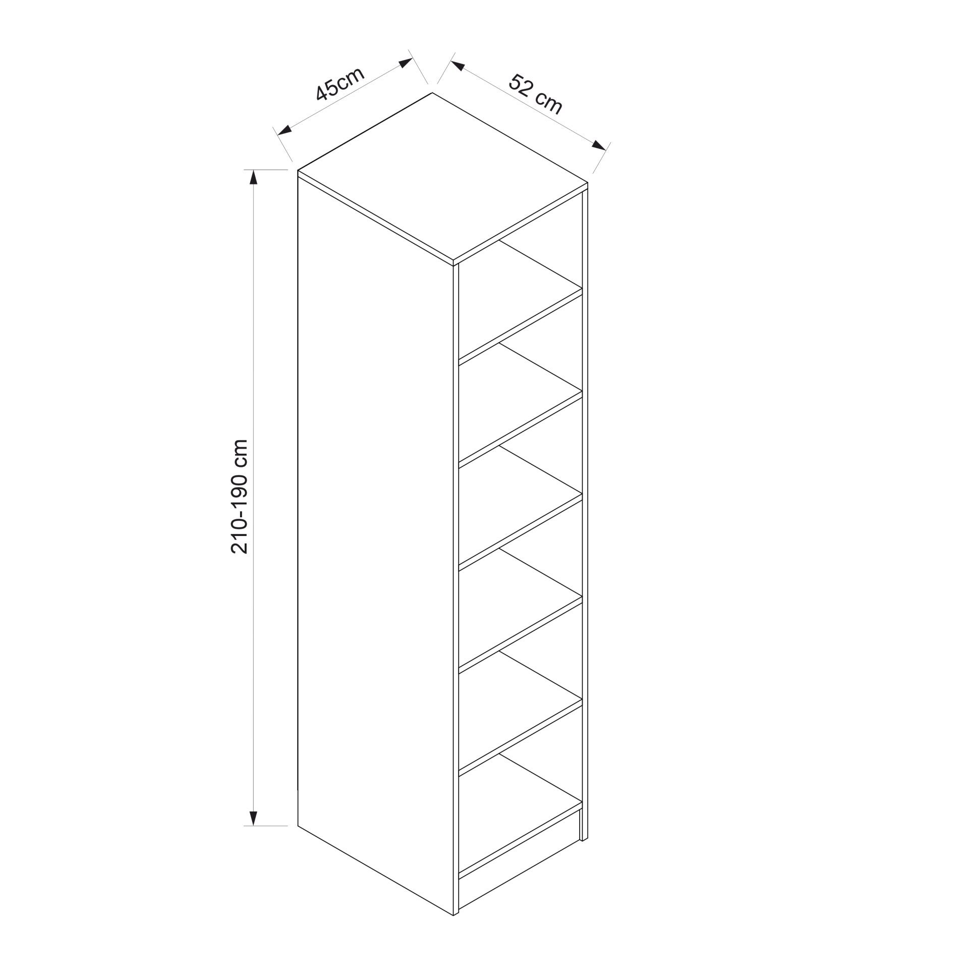 45 cm genişlik, 52 cm derinlik ve 190–210 cm yükseklik ölçüleriyle, kompakt alanlarda etkili depolama çözümü sunar.