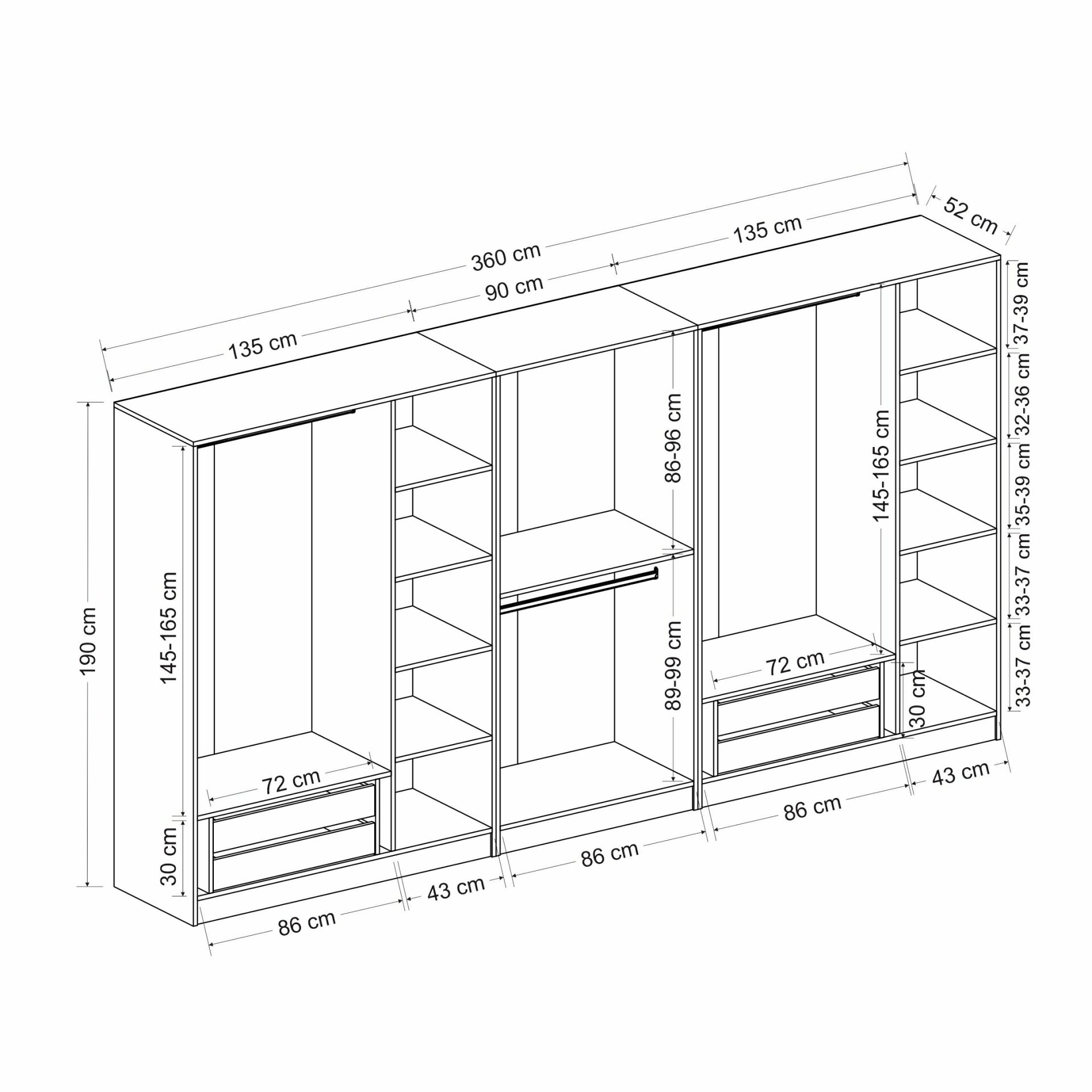 360 cm genişlik, 52 cm derinlik ve 190–210 cm yükseklik ölçüleriyle büyük hacimli depolama ihtiyacını karşılayacak şekilde tasarlanmıştır.