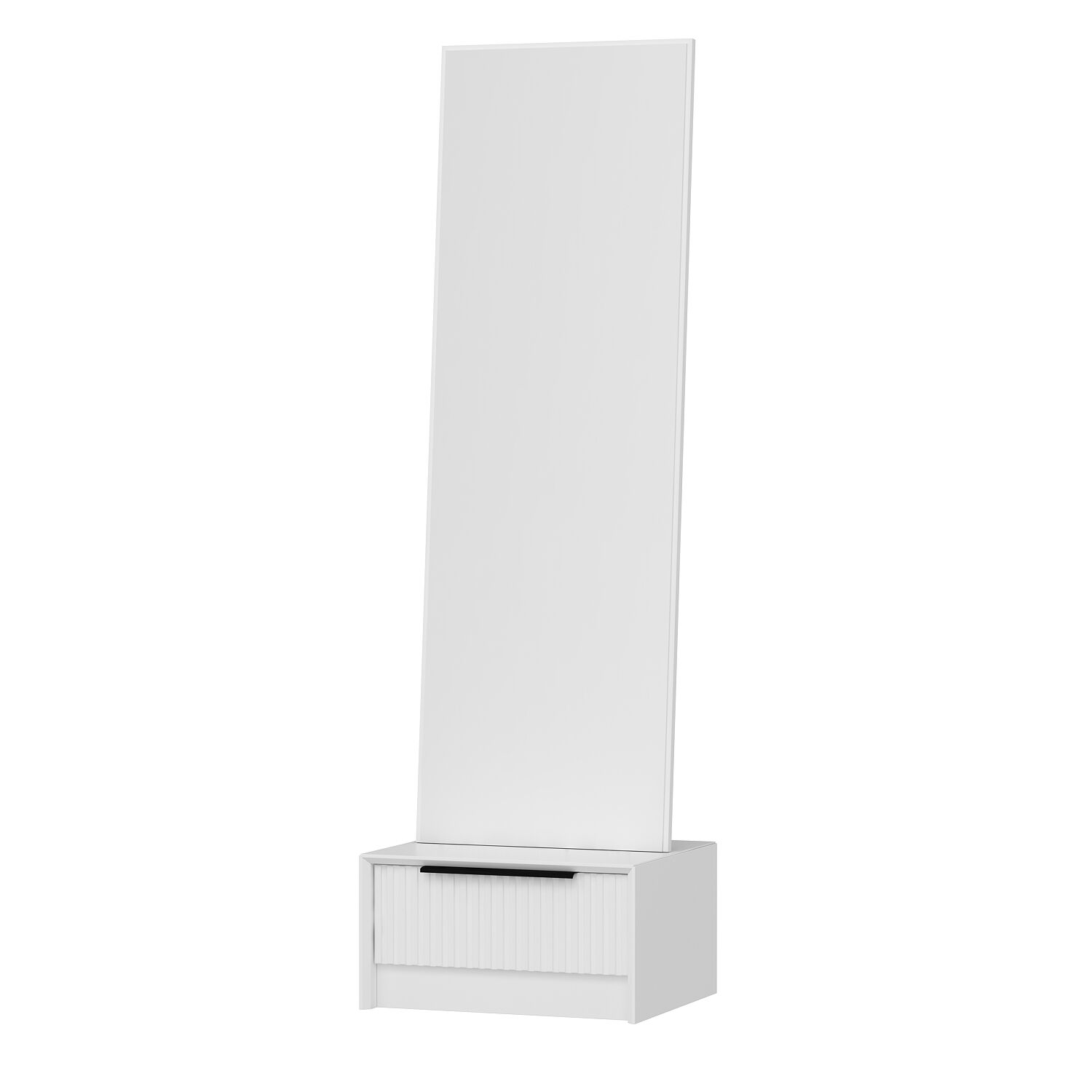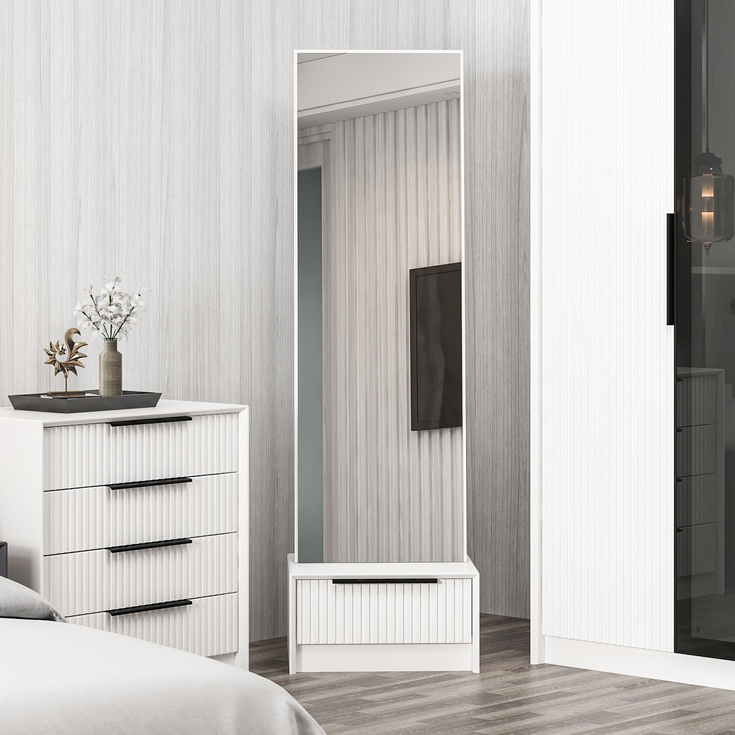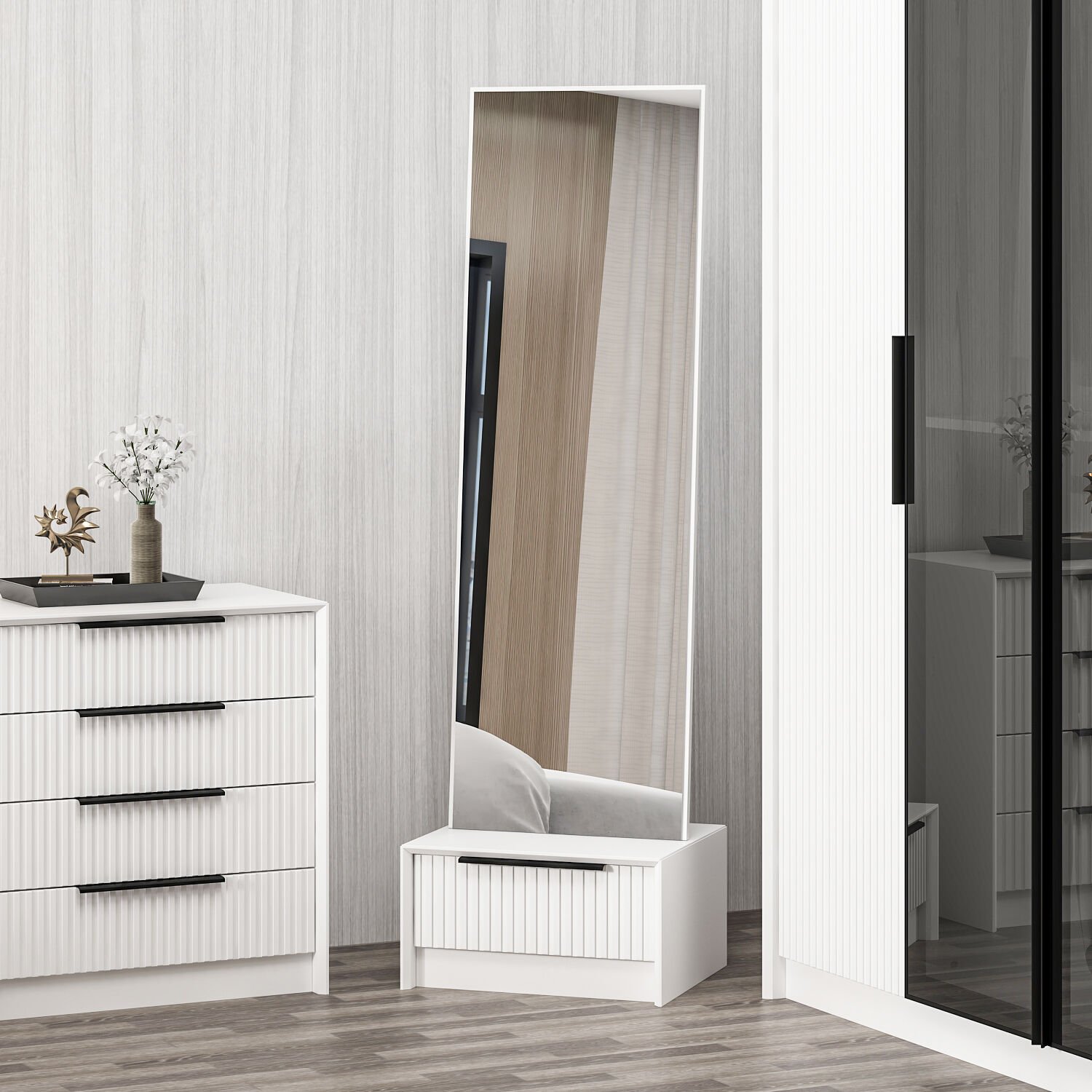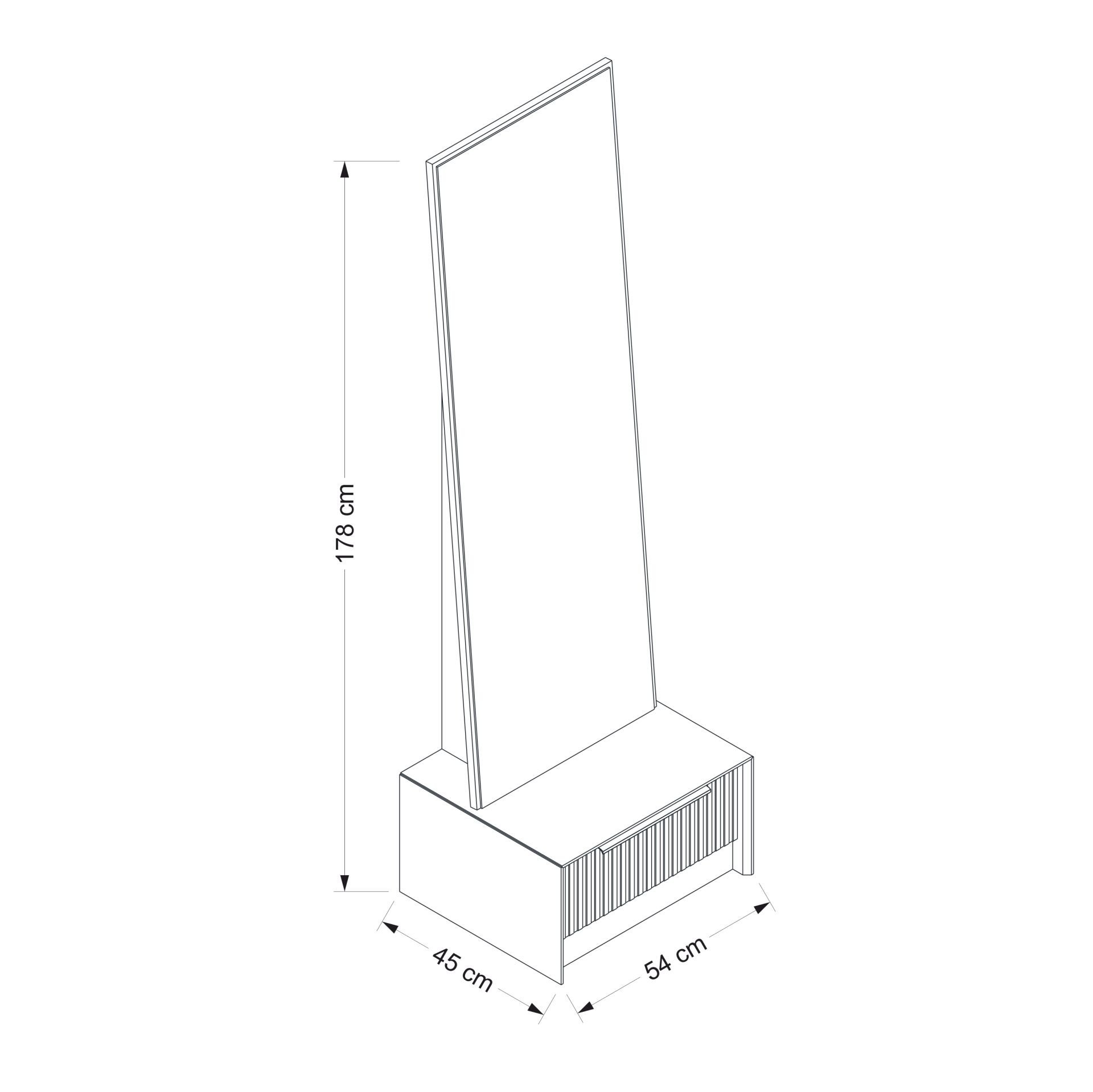 Derinliği 45 cm olan bu boy aynası, kullanım sırasında sağlam ve dengeli durmasını sağlar. Alt kısmında bulunan ekstra çekmecesi ile küçük aksesuarlarınızı, takılarınızı veya günlük bakım malzemelerinizi düzenli bir şekilde saklayabilirsiniz. Bu fonksiyonel detay, aynayı sadece dekoratif bir ürün olmaktan çıkarıp aynı zamanda pratik bir depolama çözümü haline getirir.