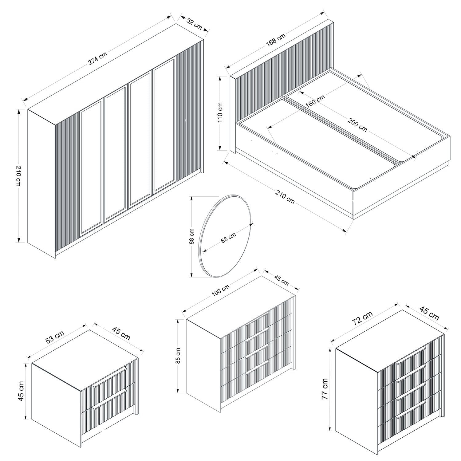 Kale Luxe Yatak Odası Takımı - Antrasit, modern ve lüks tasarımıyla yatak odalarına şıklık ve fonksiyonellik katar. Takım; 6 kapaklı geniş gardrop, 160x200 ölçülerinde baza ve başlık seti, aynalı 4 çekmeceli şifonyer, standart 4 çekmeceli şifonyer ve 2 adet 2 çekmeceli komodinden oluşur. Antrasit rengin zarif tonları, odanıza modern bir atmosfer kazandırır. Geniş depolama alanı sunan gardrop ve çekmeceler, eşyalarınızı düzenli ve kolay erişilebilir şekilde saklamanıza yardımcı olur. Dayanıklı malzemesi sayesinde uzun yıllar güvenle kullanılabilir. Kale Luxe Yatak Odası Takımı, estetik ve işlevselliği bir arada sunarak yaşam alanınızı mükemmel şekilde tamamlar.| Yatak Odası Takımı Renk | : | Antrasit |