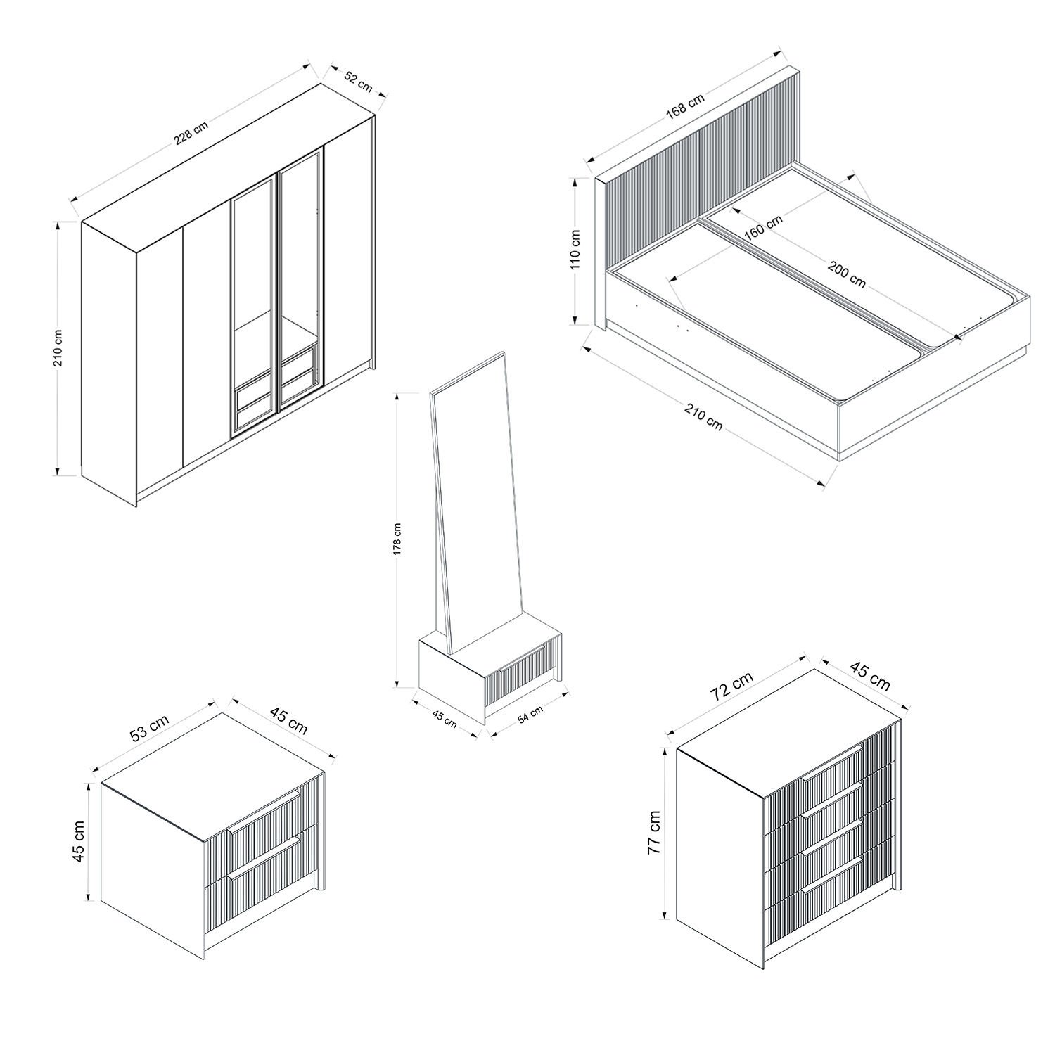 Kale Luxe Yatak Odası Takımı - Antrasit, modern ve şık tasarımıyla yatak odalarına zarafet katar. Takım; 5 kapaklı geniş gardrop, 160x200 ölçülerinde baza ve başlık seti, 4 çekmeceli şifonyer, 2 adet 2 çekmeceli komodin ve boy aynasından oluşur. Antrasit rengin görünümü odanıza modern ve göz alıcı bir atmosfer kazandırır. Geniş depolama alanı sunan gardrop ve çekmeceler, eşyalarınızı düzenli ve kolayca ulaşılabilir şekilde saklamanıza yardımcı olur. Dayanıklı malzeme yapısı ile uzun yıllar güvenle kullanılabilir. Kale Luxe Yatak Odası Takımı, fonksiyonelliği ve estetiği bir araya getirerek yaşam alanınızı mükemmel bir şekilde tamamlar.| Yatak Odası Takımı Renk | : | Antrasit |