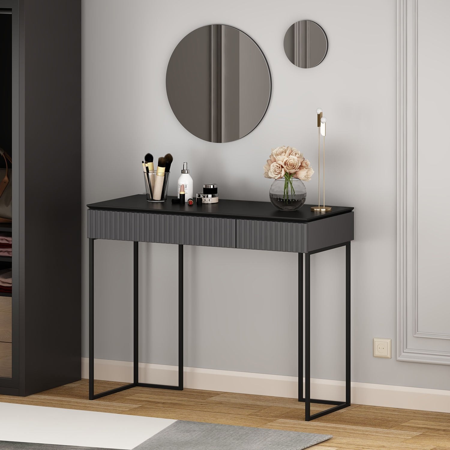 Kale Plus Makyaj Masası - Antrasit, modern ve şık antrasit rengi ile yaşam alanlarınıza estetik bir dokunuş katarken, fonksiyonel tasarımıyla makyaj ve kişisel bakım rutinlerinizi kolaylaştırıyor. Geniş ve yüksek kaliteli aynası sayesinde makyaj yaparken tüm detayları net bir şekilde görmenizi sağlar. Ayrıca, küçük ek aynası ile ayrıntılı makyaj ve saç düzenlemelerinde ekstra konfor sunar.
