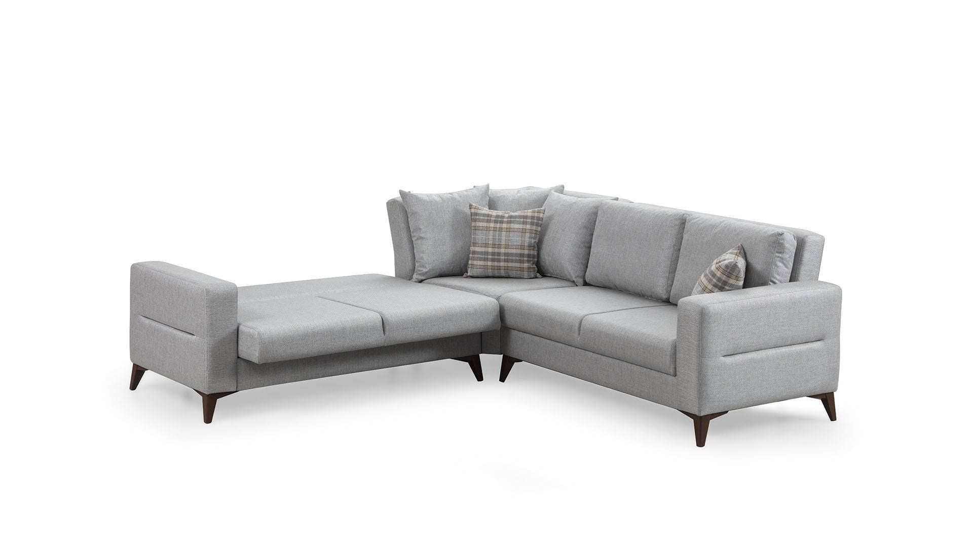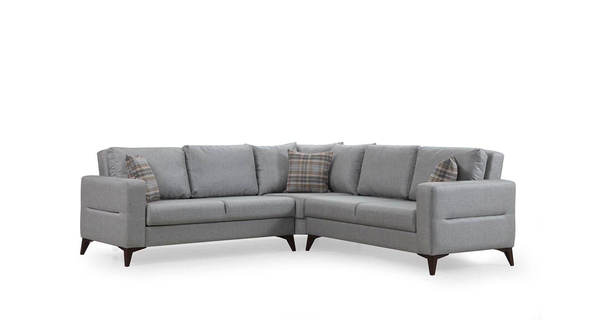 14 cm yüksekliğindeki ceviz renkli plastik ayaklar, modern tasarımı tamamlamasının yanı sıra robot süpürge uyumluluğu ve kolay temizlik avantajı sağlar. Fonksiyonel özellikleriyle öne çıkan Kristal (2+K+2) L Köşe Koltuk Takımı, dekorasyonunuza uyum sağlayacak koyu gri, açık gri, bej ve lacivert olmak üzere dört farklı renk seçeneğiyle sunulmaktadır.