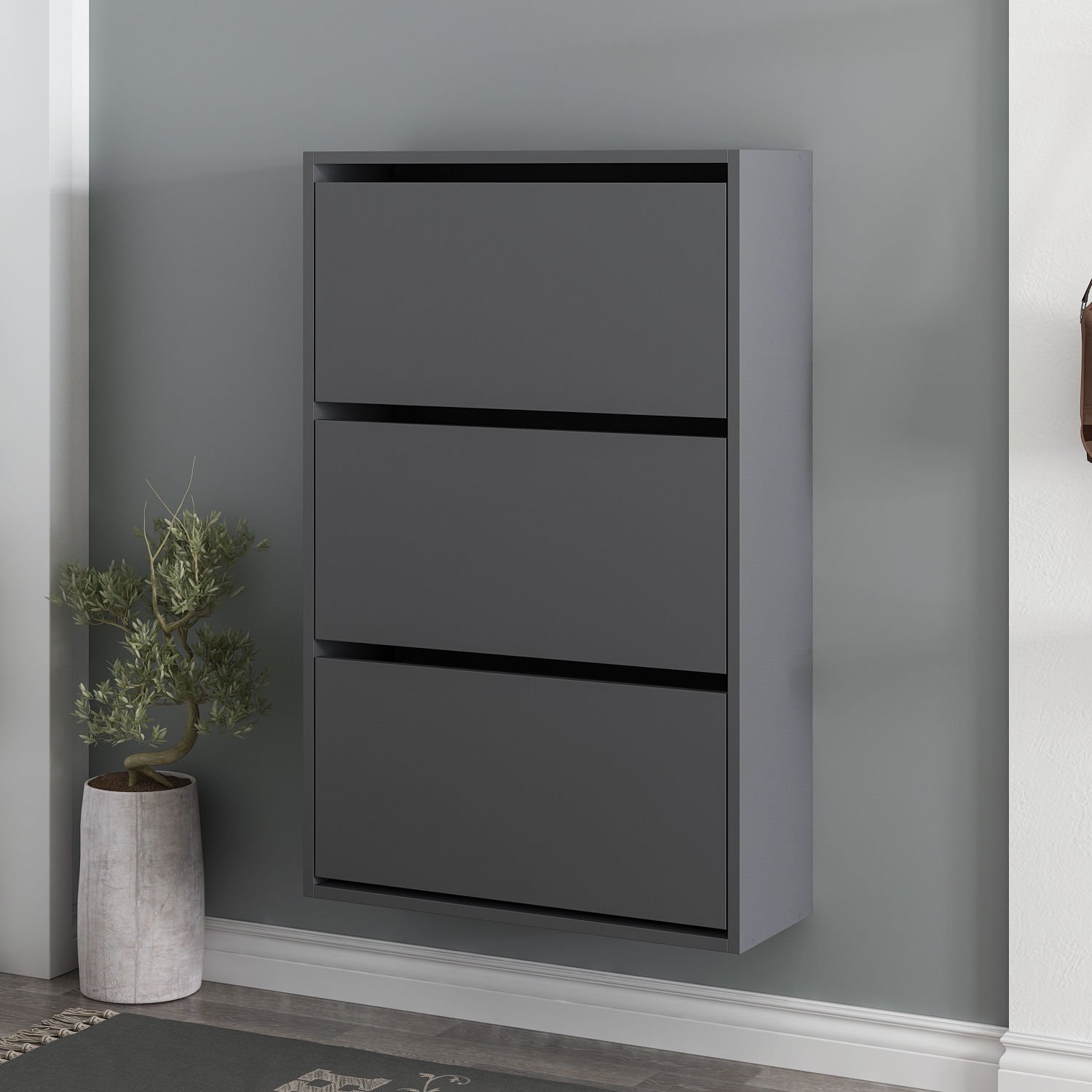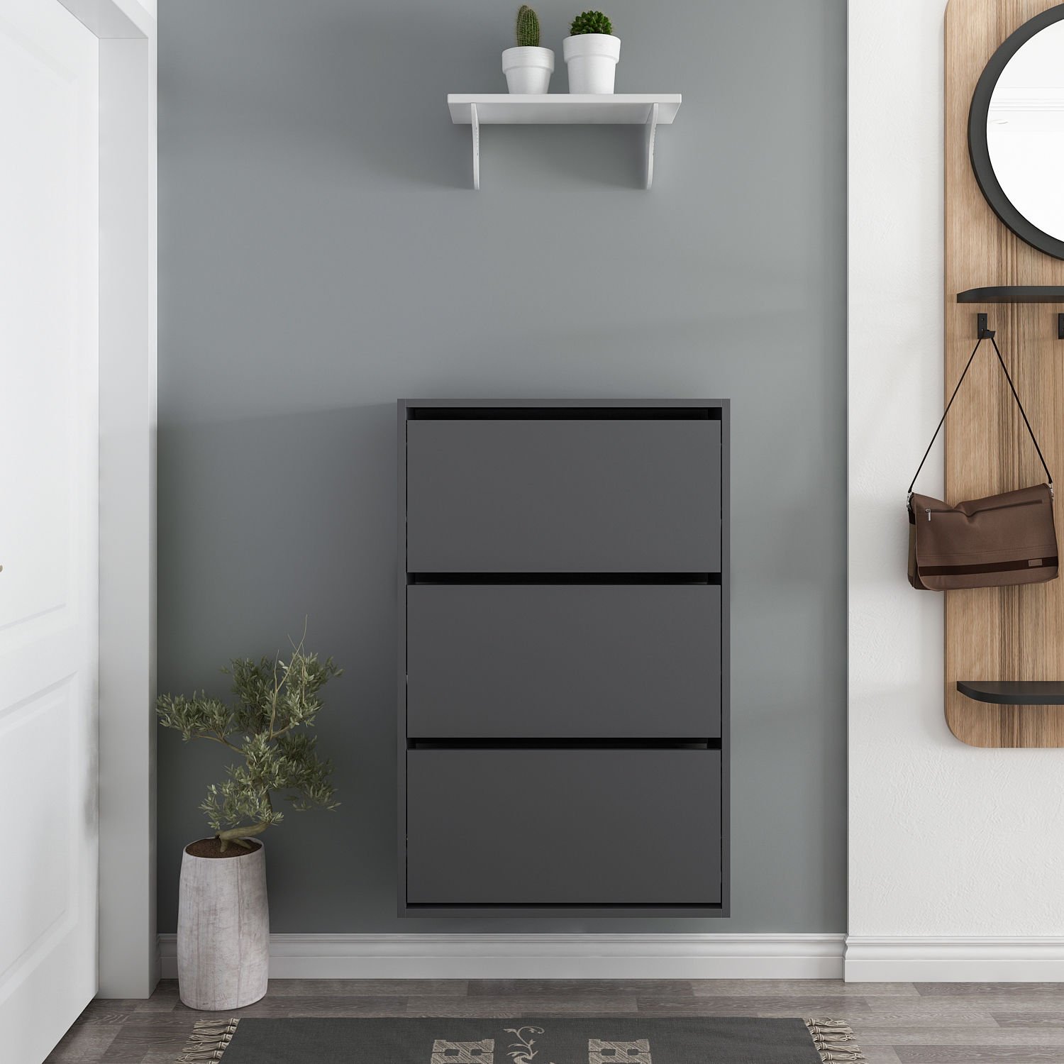 Antrasit gövde ve kapaklar, mekâna modern ve şık bir görünüm kazandırırken, 3 bölmeli düşer kapak sistemi sayesinde ayakkabılarınızı düzenli ve kolay erişilebilir bir şekilde saklayabilirsiniz. 70 cm genişlik, 25 cm derinlik ve 109 cm yükseklik ölçüleriyle dar alanlarda bile pratik kullanım sağlar.