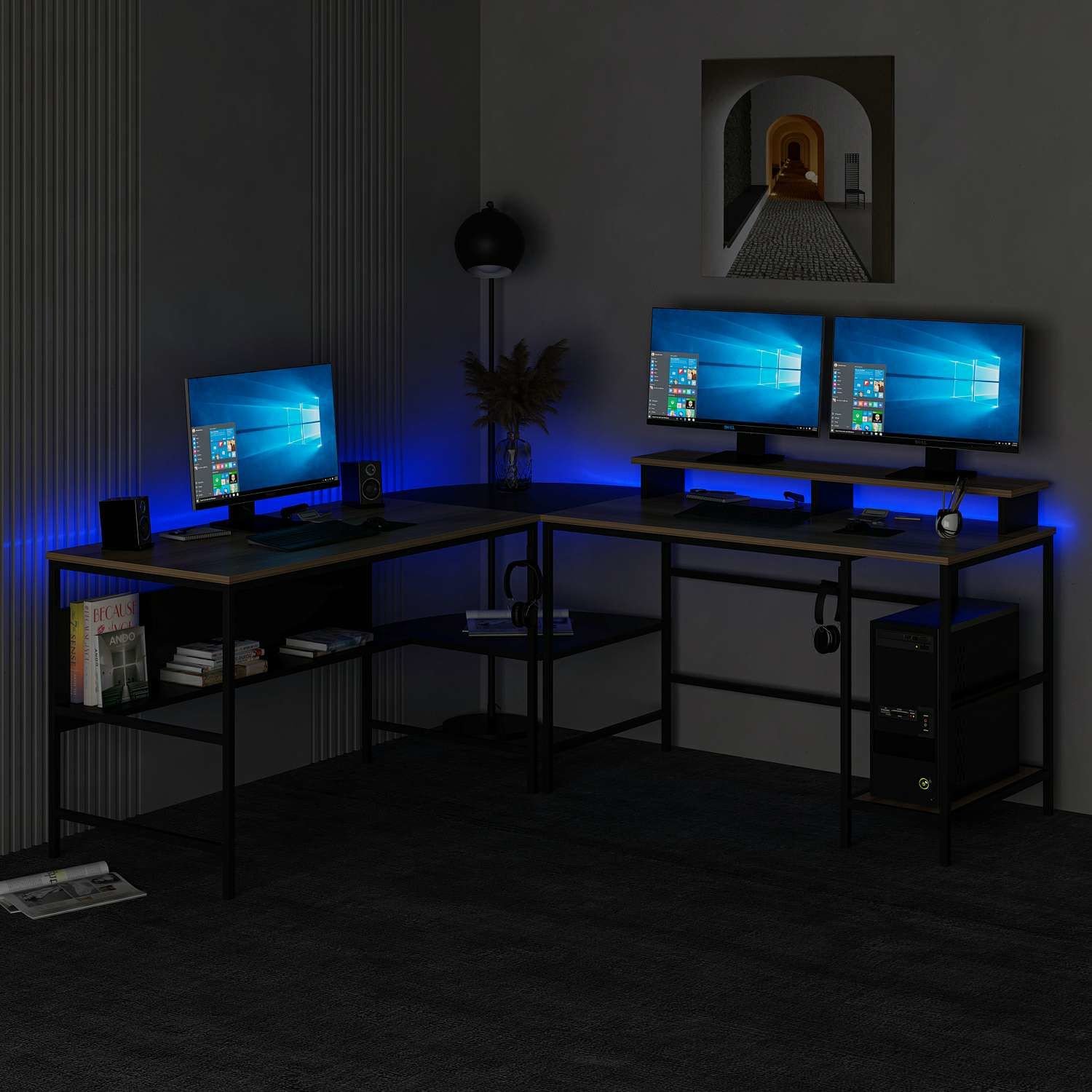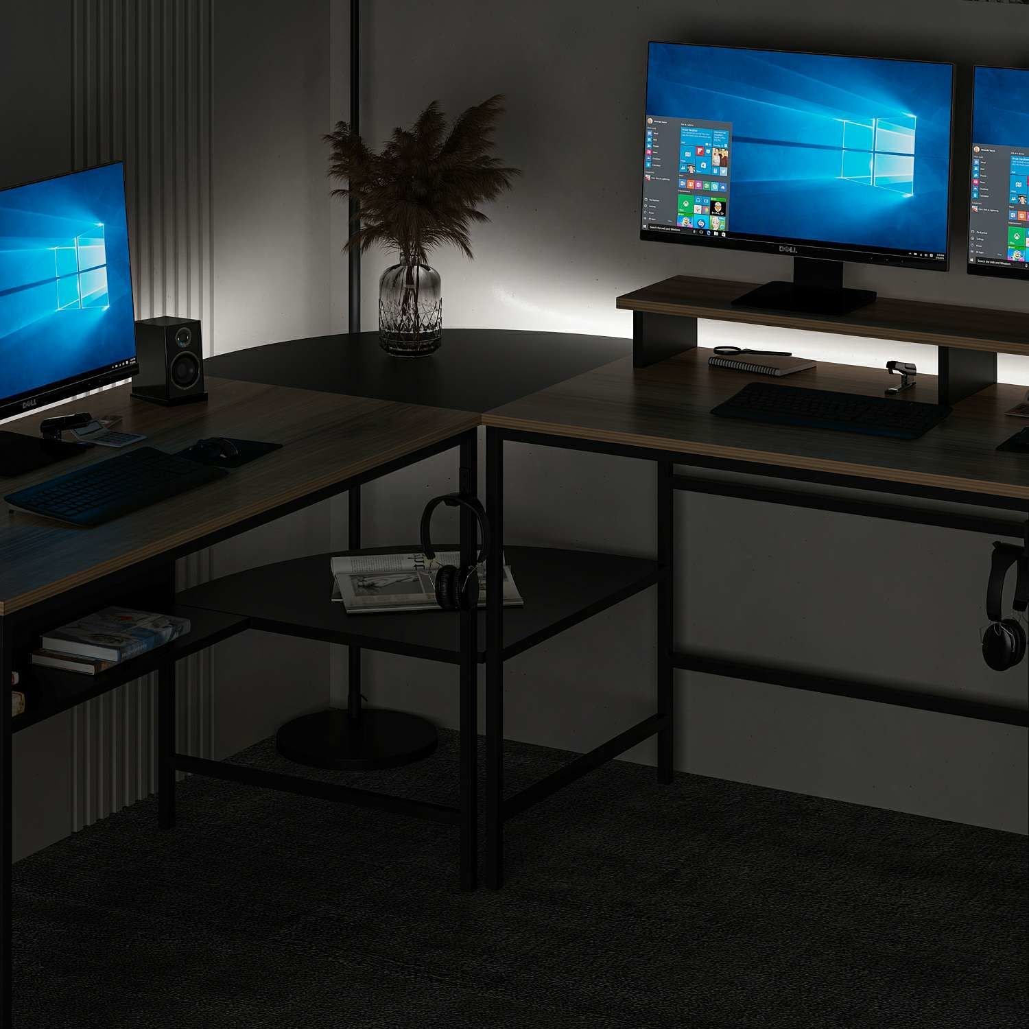 , modern tasarımını RGB LED aydınlatma ile buluşturarak çalışma ortamınıza hem şıklık hem de teknoloji katıyor. L köşe formu sayesinde alanı verimli kullanmanıza olanak tanırken; raflı bölümü, monitör rafı ve geniş masa yüzeyi ile işlevselliği maksimum seviyeye çıkarır.