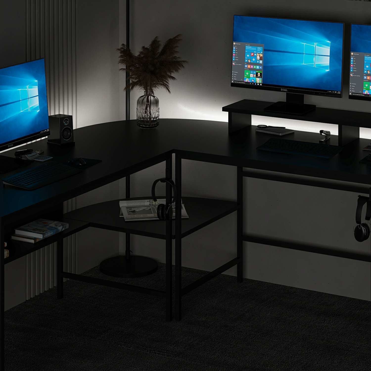 Minar Greta RGB Led Işıklı L Köşe Çalışma Masası – Siyah, sade ve modern tasarımını RGB LED aydınlatma ile birleştirerek çalışma ortamınıza hem şıklık hem de dinamik bir atmosfer katar. L köşe formu sayesinde alanı verimli kullanmanıza imkân tanırken; raflı bölümü, monitör rafı ve geniş masa yüzeyiyle işlevselliği artırır.
