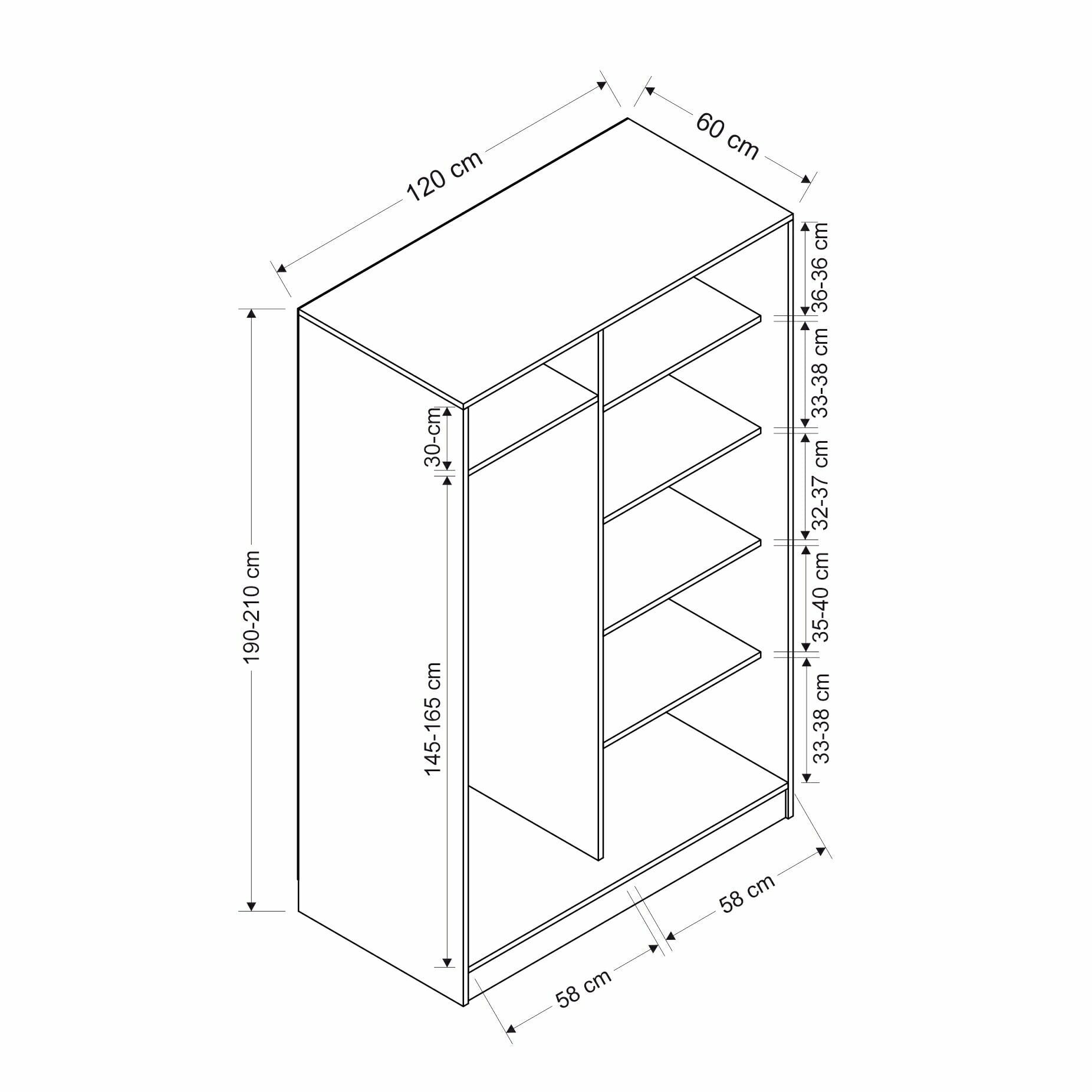 120 cm genişlik, 60 cm derinlik ve 190–210 cm yükseklik ölçüleriyle, kompakt alanlarda kullanım için ideal bir dolaptır.