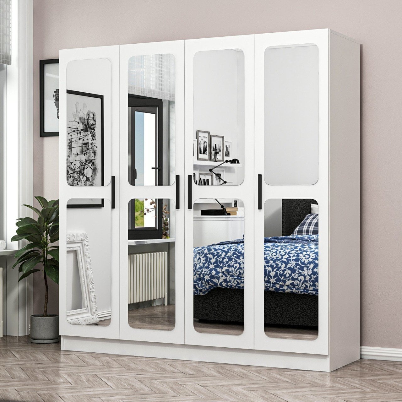 Minar Kale 4 Kapak Aynalı 2 Çekmece Zincir Dolap - Beyaz