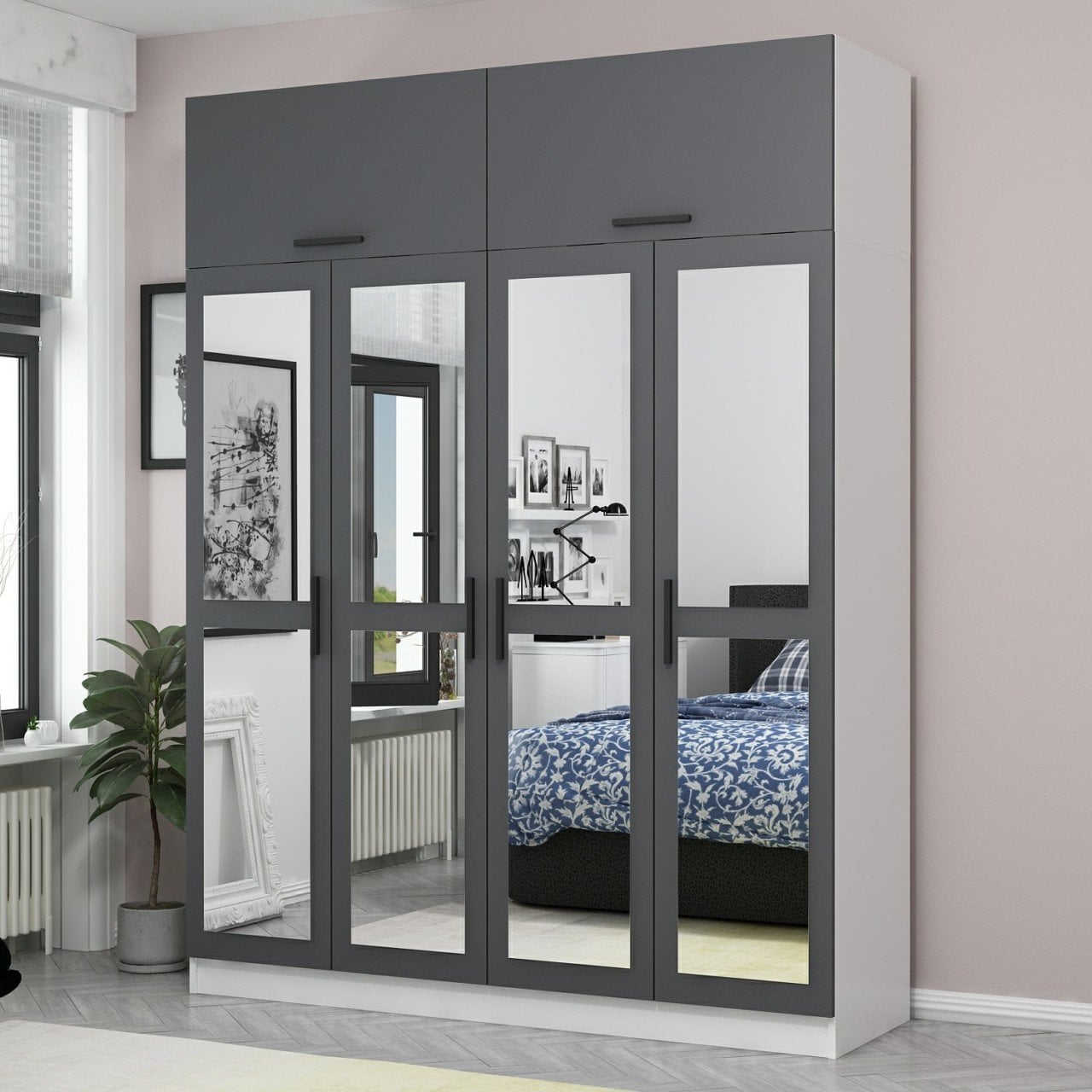 Minar Kale 4 Kapaklı 4 Aynalı 2 Ç Dolap ve Yüklük Beyaz Antrasit