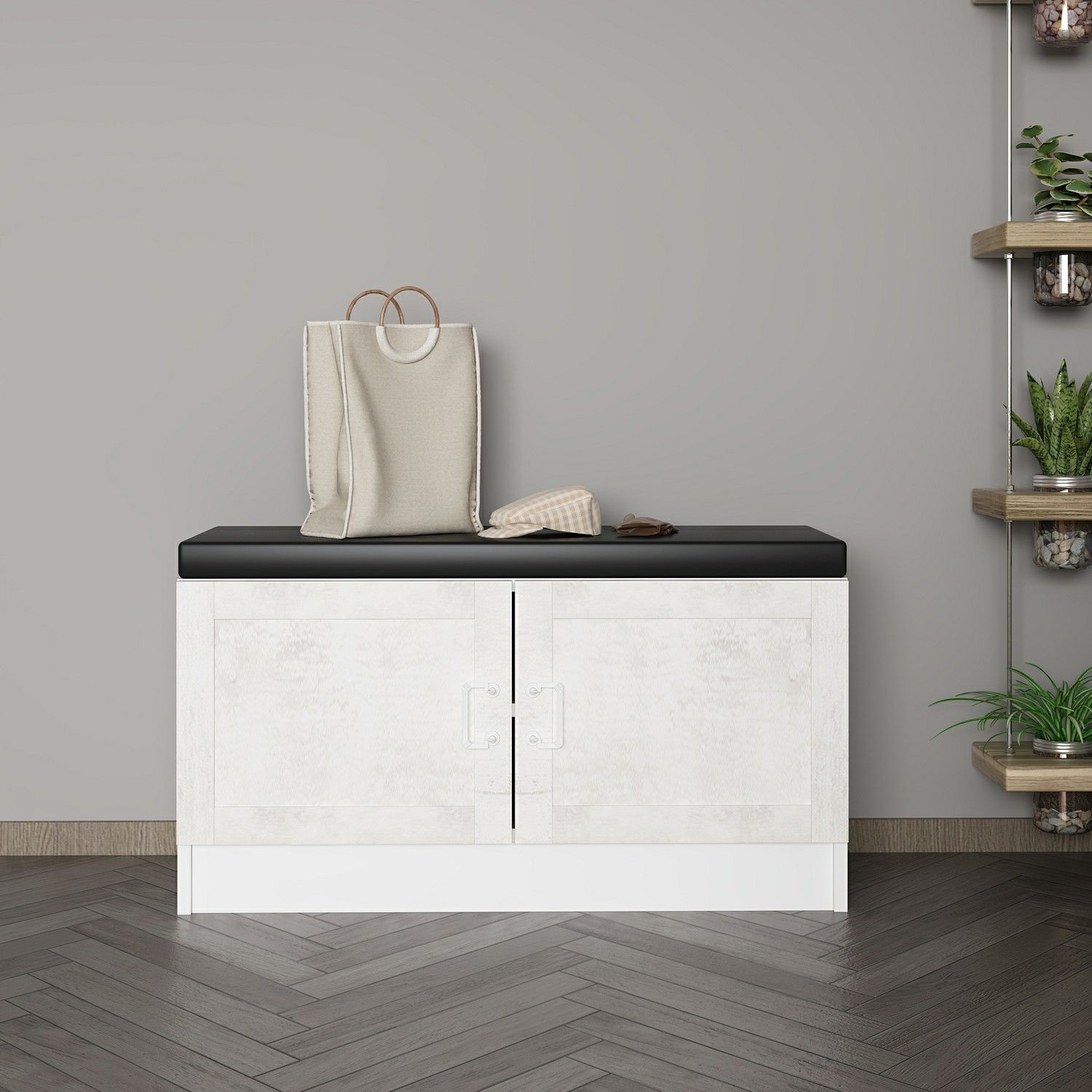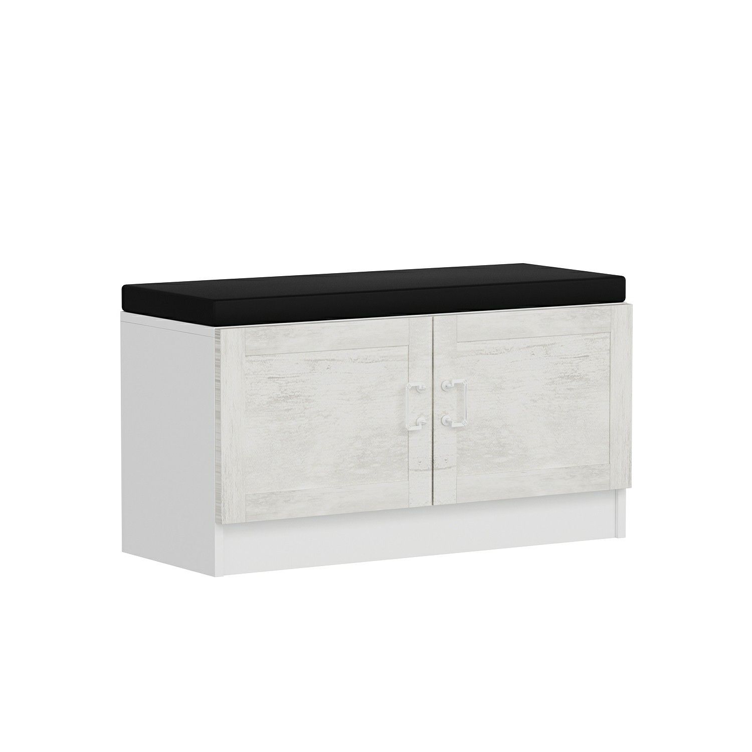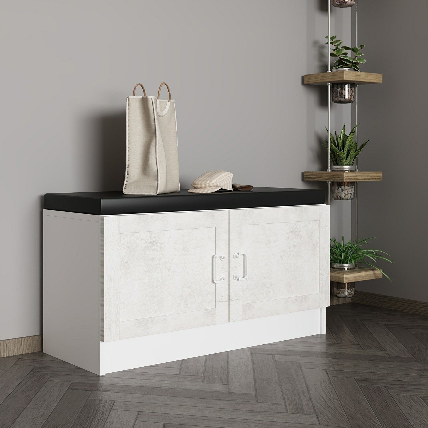 Beyaz gövde ve eskitme beyaz düz kapaklar, mekâna sıcak ve zarif bir görünüm kazandırırken, minderli oturma alanı ayakkabılarınızı giyip çıkarırken ekstra konfor sağlar. 90 cm genişlik, 35 cm derinlik ve 50 cm yükseklik ölçüleriyle dar alanlarda bile rahat kullanım imkânı sunar.