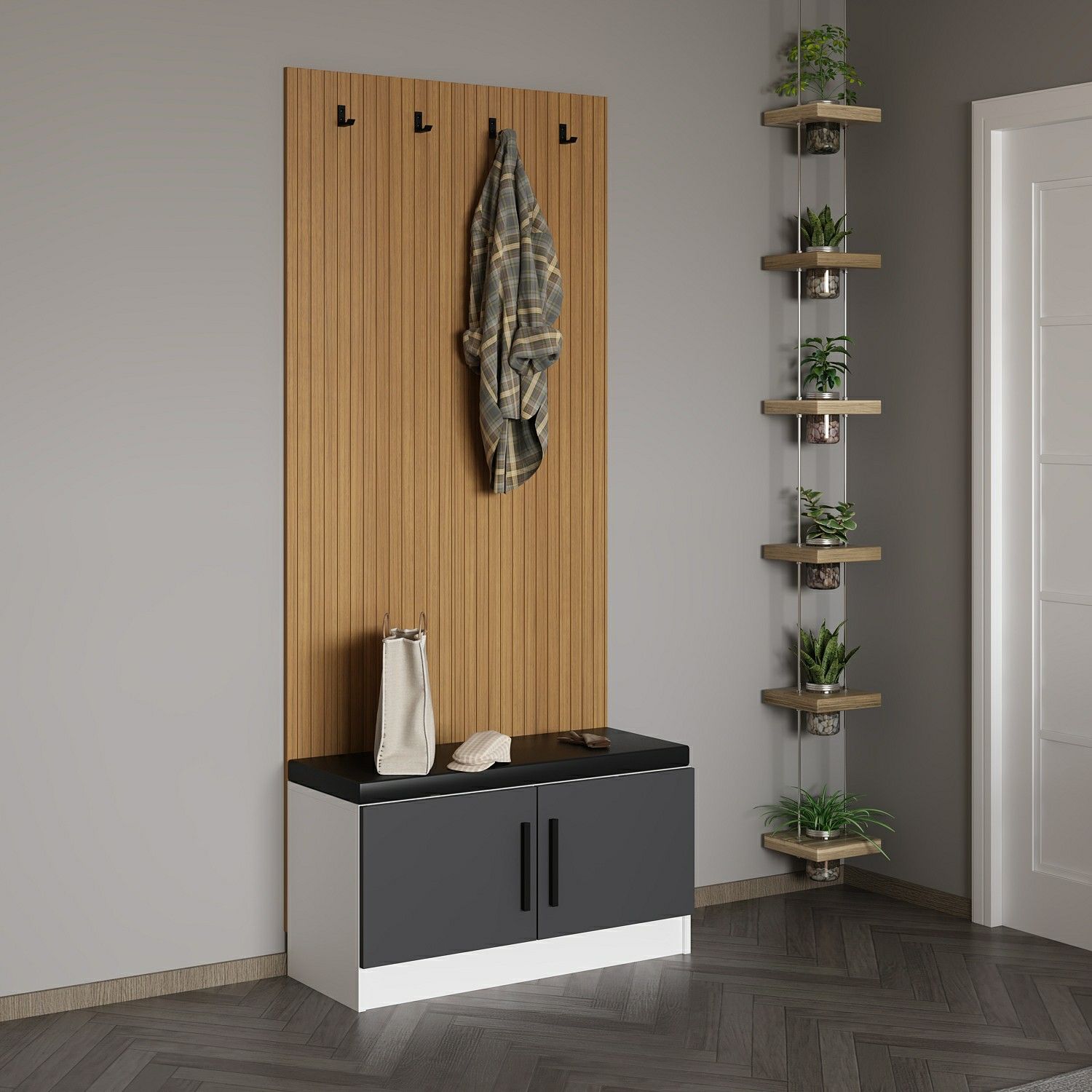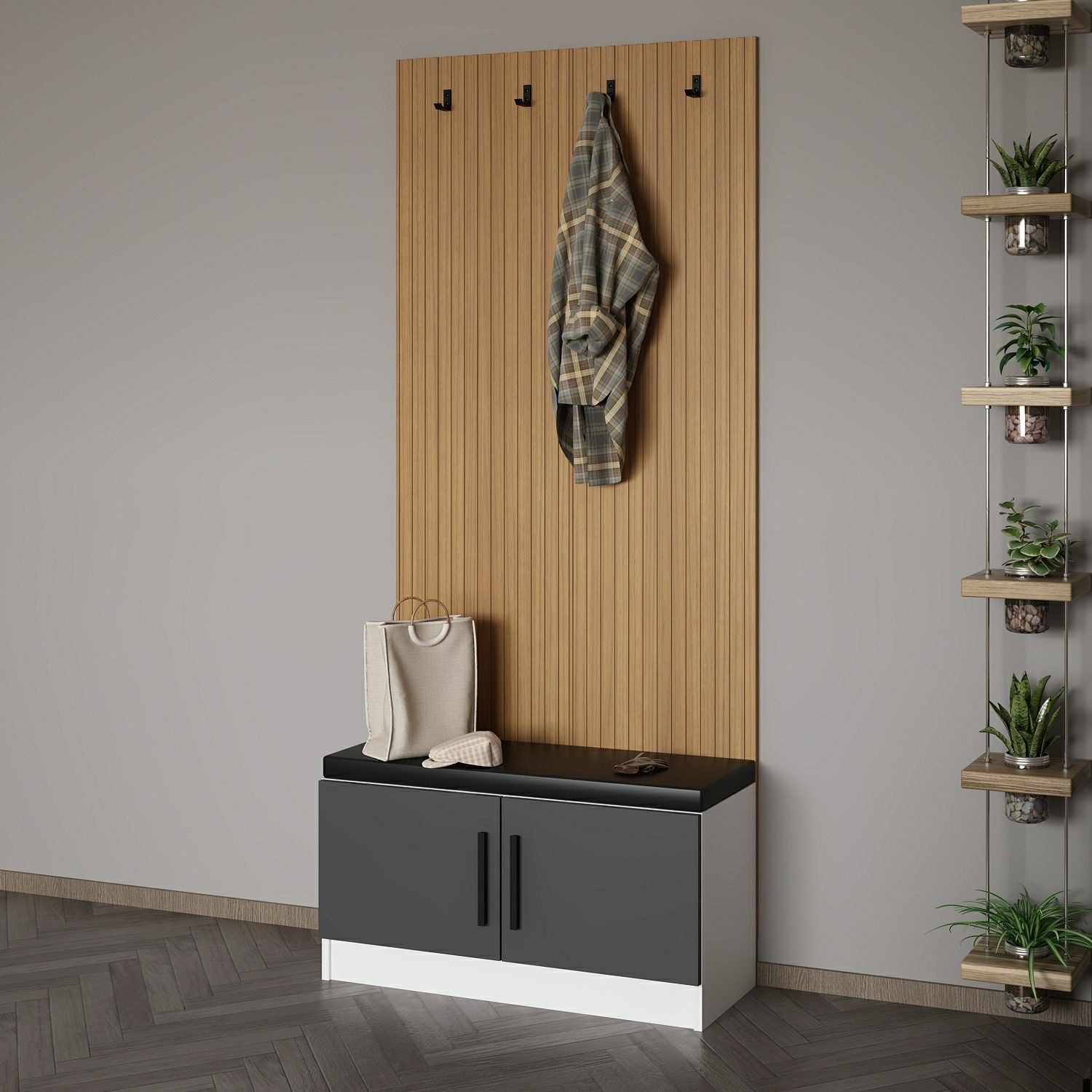 Beyaz gövde ile antrasit düz kapakların mükemmel uyumu, ortama modern ve zarif bir hava katar. Arka kısımda yer alan askılıklı dekor panel, mont, çanta, şemsiye veya anahtarlık gibi eşyalarınızı asabilmeniz için pratik bir alan sunar.