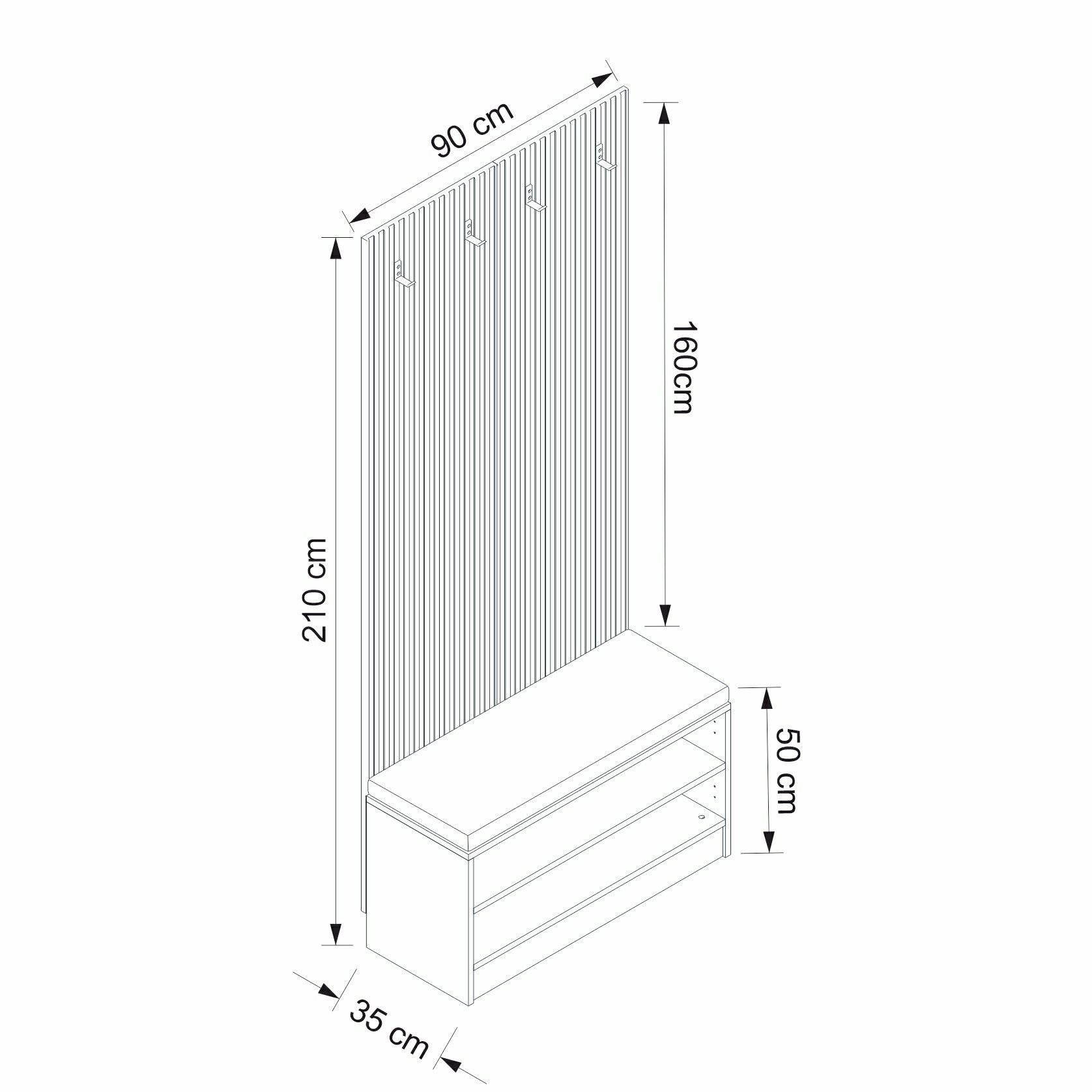 Üst kısmındaki minderli oturma alanı, ayakkabılarınızı giyip çıkarırken rahatlık sağlar. 90 cm genişlik, 35 cm derinlik ve 210 cm yükseklik ölçüleriyle hem dar alanlara uyum sağlar hem de geniş depolama hacmiyle öne çıkar.