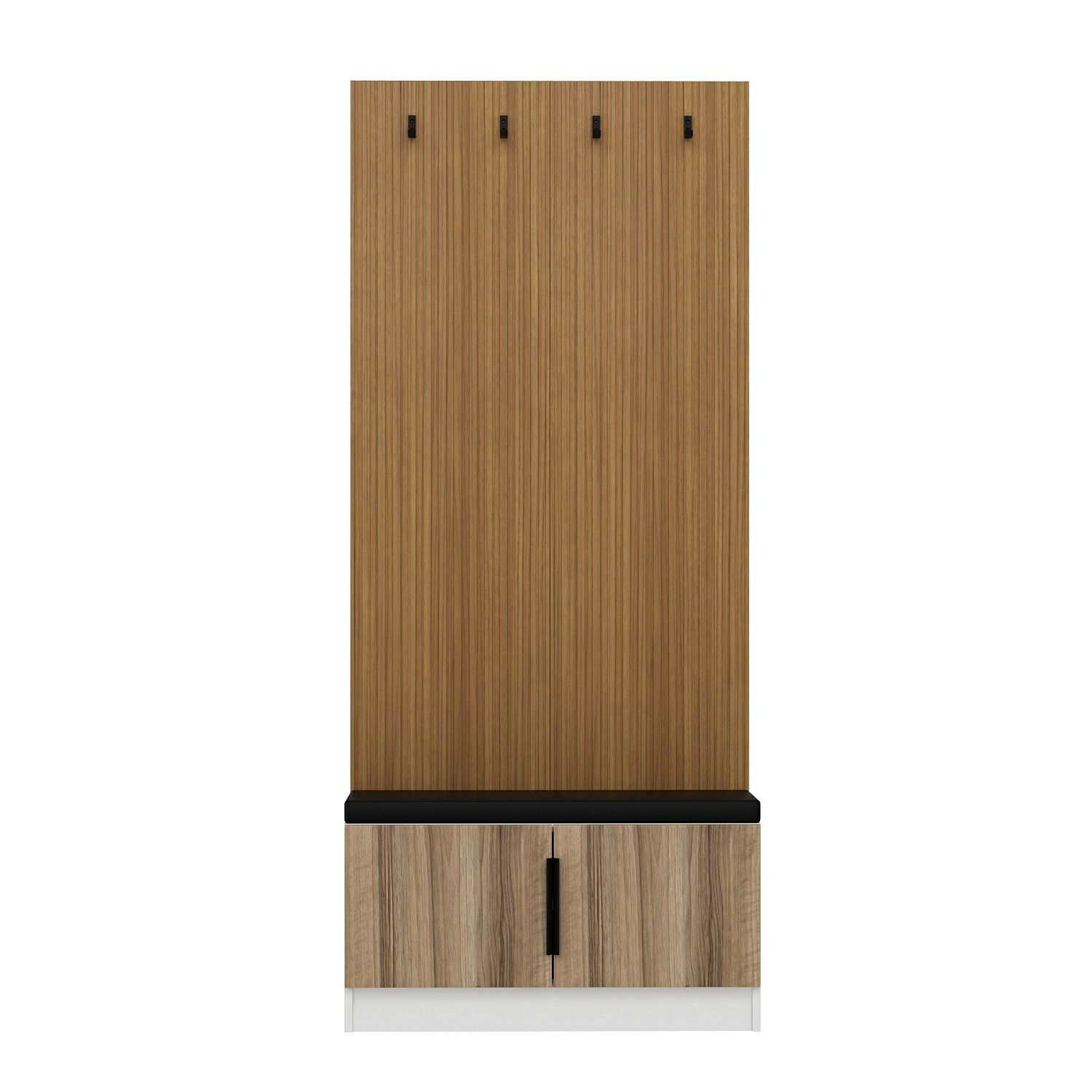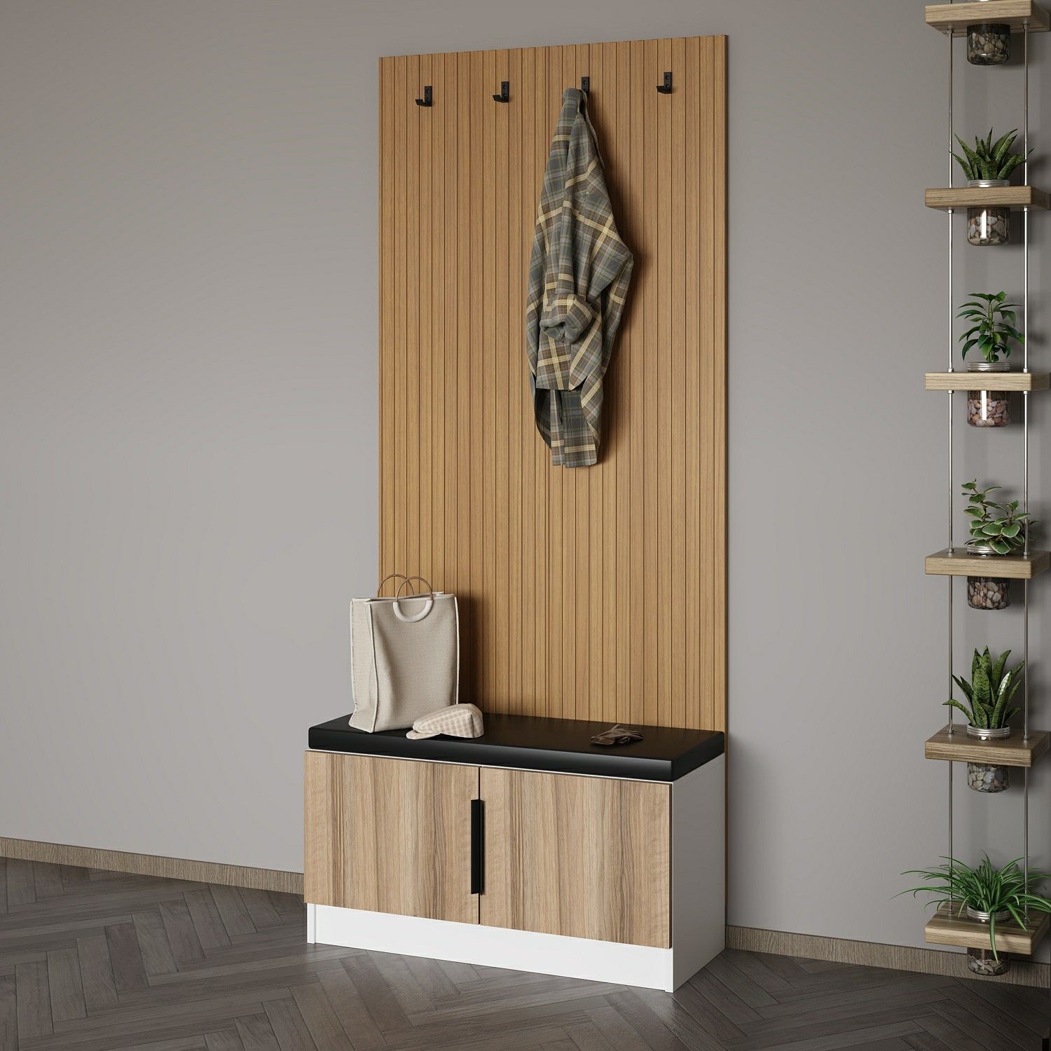 Beyaz gövde ile dore kapakların uyumu, ortama sıcak ve modern bir hava katarken, düz kapak tasarımı sade ama şık bir görünüm oluşturur. Arka kısımda yer alan askılıklı dekor panel, mont, çanta, anahtarlık gibi eşyalarınızı asmanıza imkân tanıyarak kullanım kolaylığı sağlar.