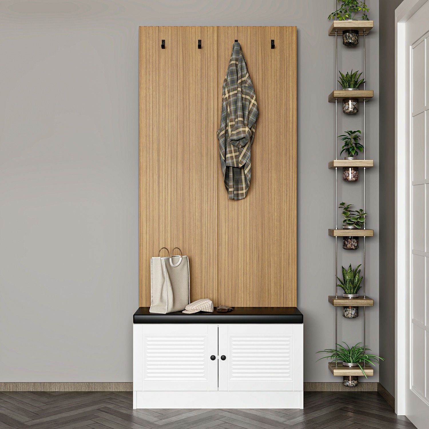 Beyaz gövde ve mebran panjur kapaklar, sade ve modern bir görünüm oluştururken; arka kısımda bulunan askılıklı dekor panel, mont, çanta, anahtarlık gibi eşyalarınızı düzenli bir şekilde asabilmenizi sağlar. Bu sayede giriş alanınız hem düzenli hem kullanışlı olur.