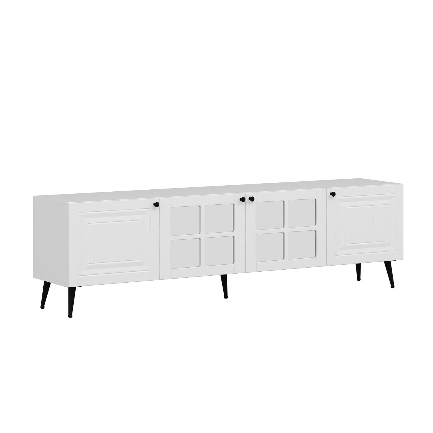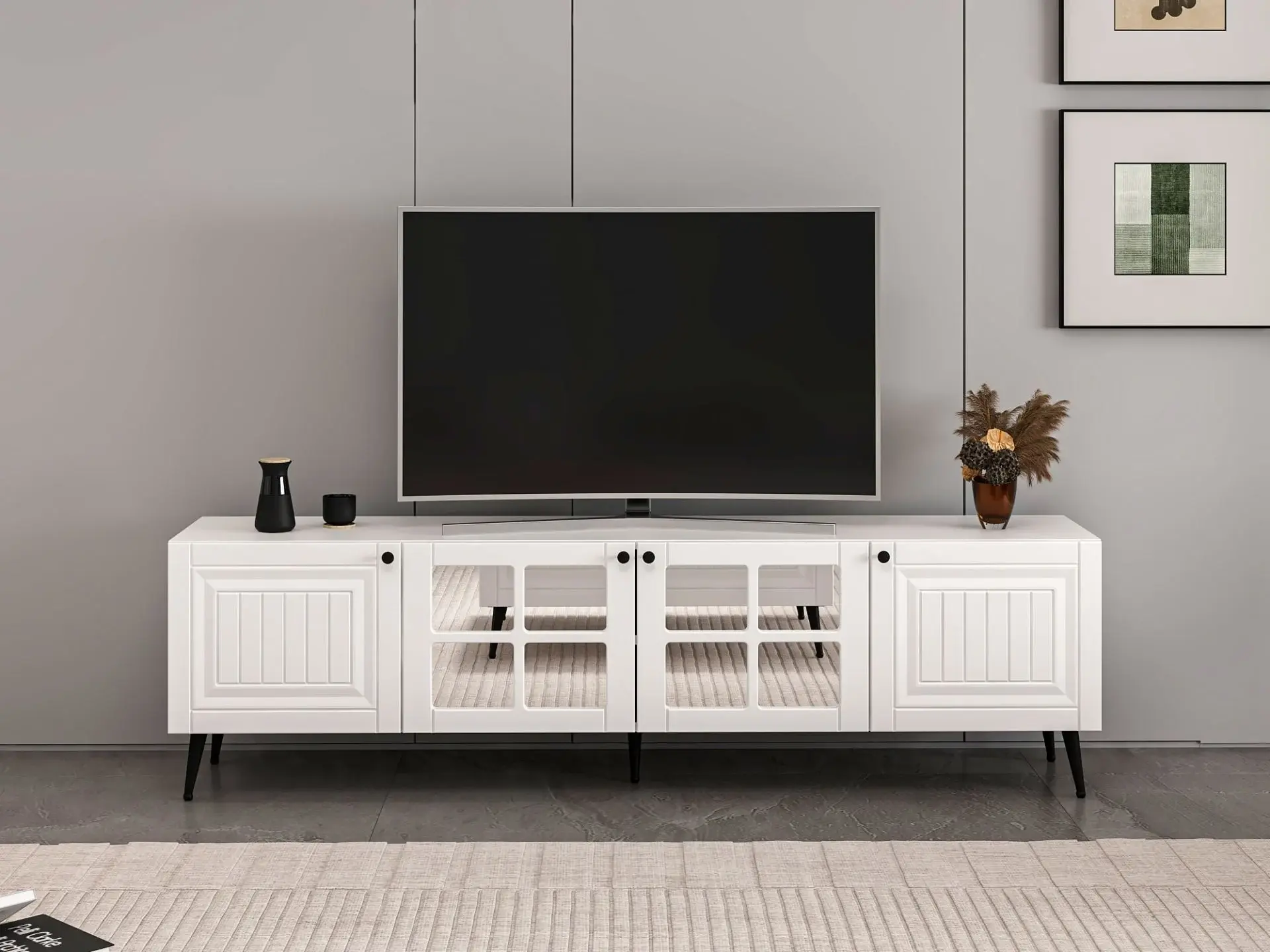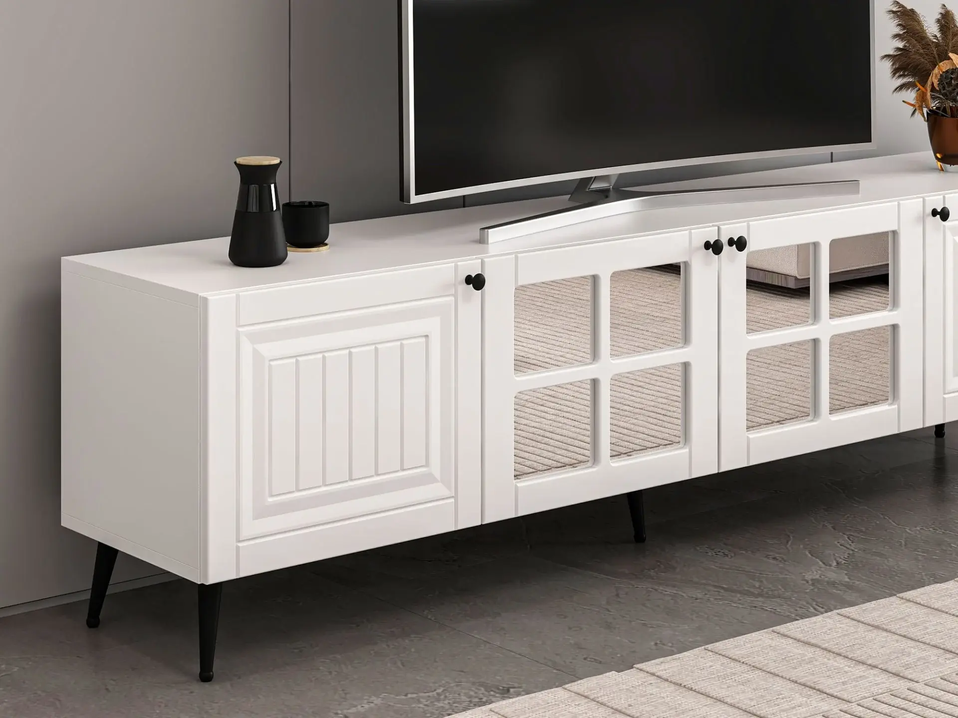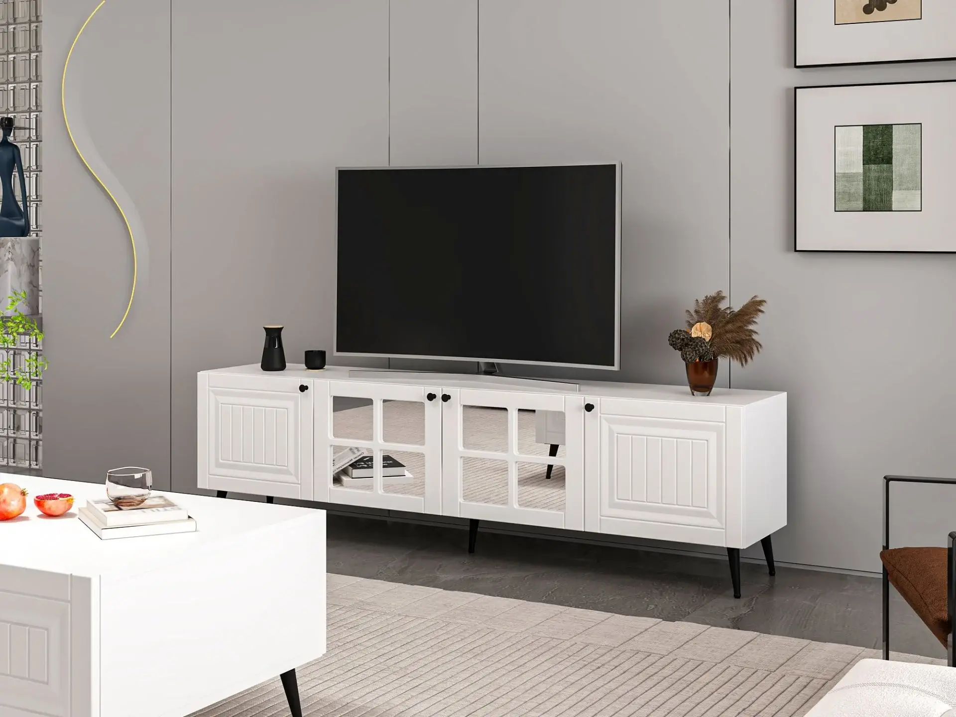 Aynalı kapaklar sadece görsel zenginlik sağlamakla kalmaz, aynı zamanda ışığı yansıtarak ortamın daha geniş ve aydınlık görünmesine yardımcı olur. Kapaklı raflar, televizyon ekipmanları ve dekoratif ürünleriniz için düzenli bir depolama alanı sunar. Yerden yüksek ayaklı tasarımı sayesinde temizlik kolaylığı sağlar ve robot süpürgelerle uyumludur.