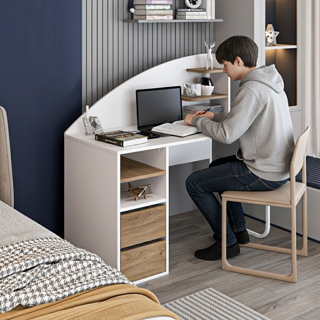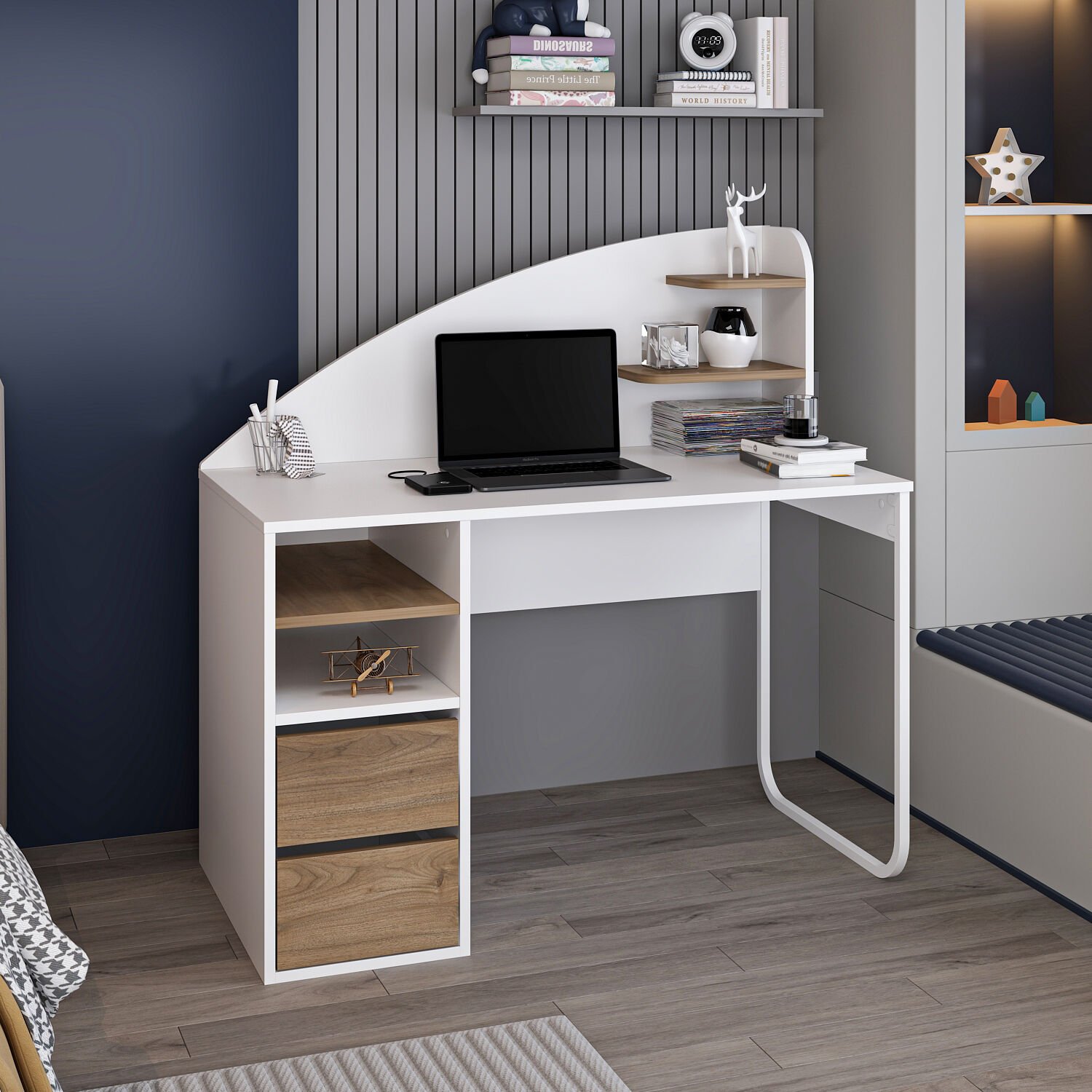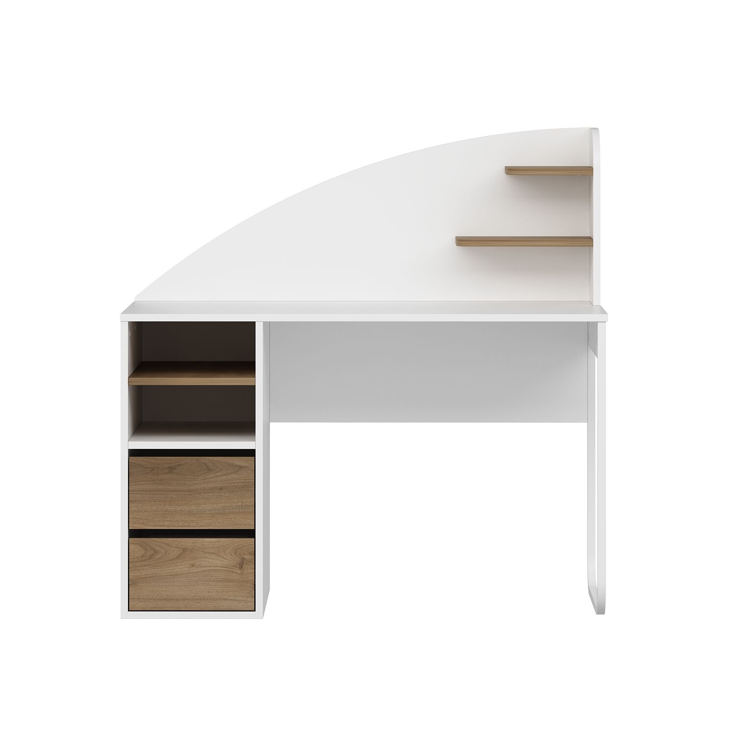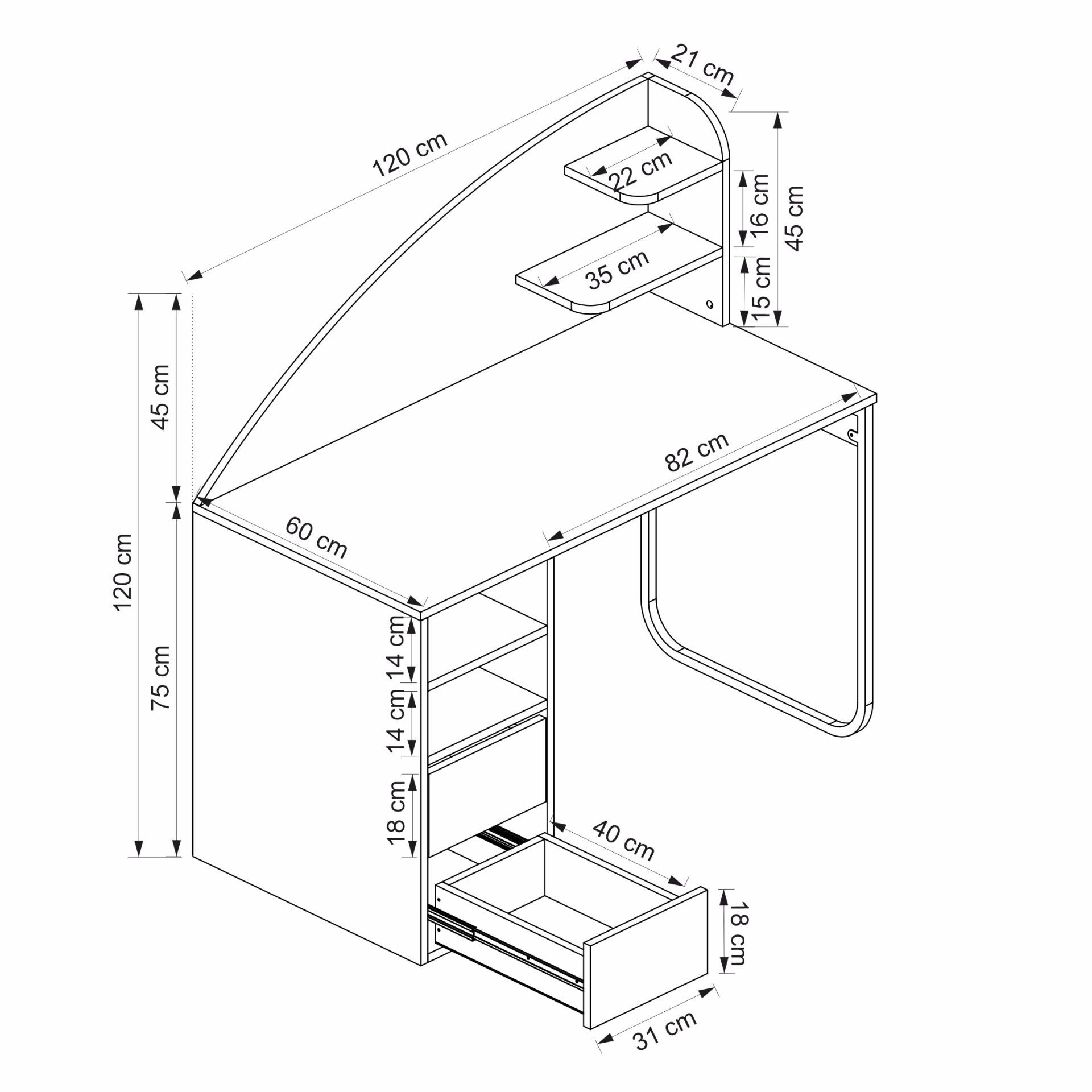 • Çekmecelerin üstünde 2 bölme + 1 raf, masanın üstünde 2 küçük raf: Düzenli depolama imkânı.