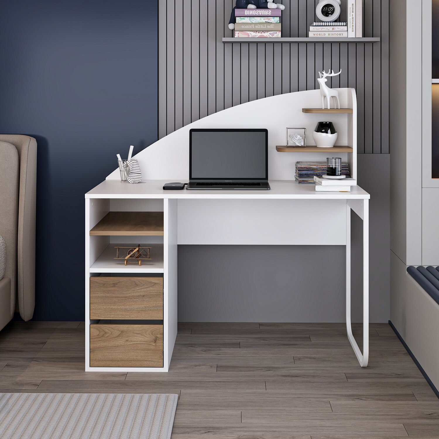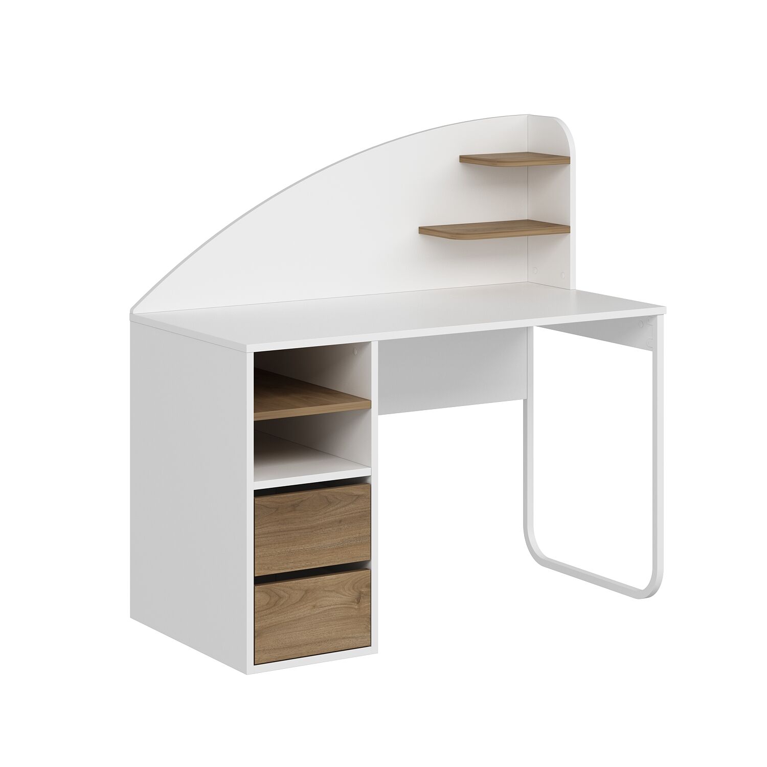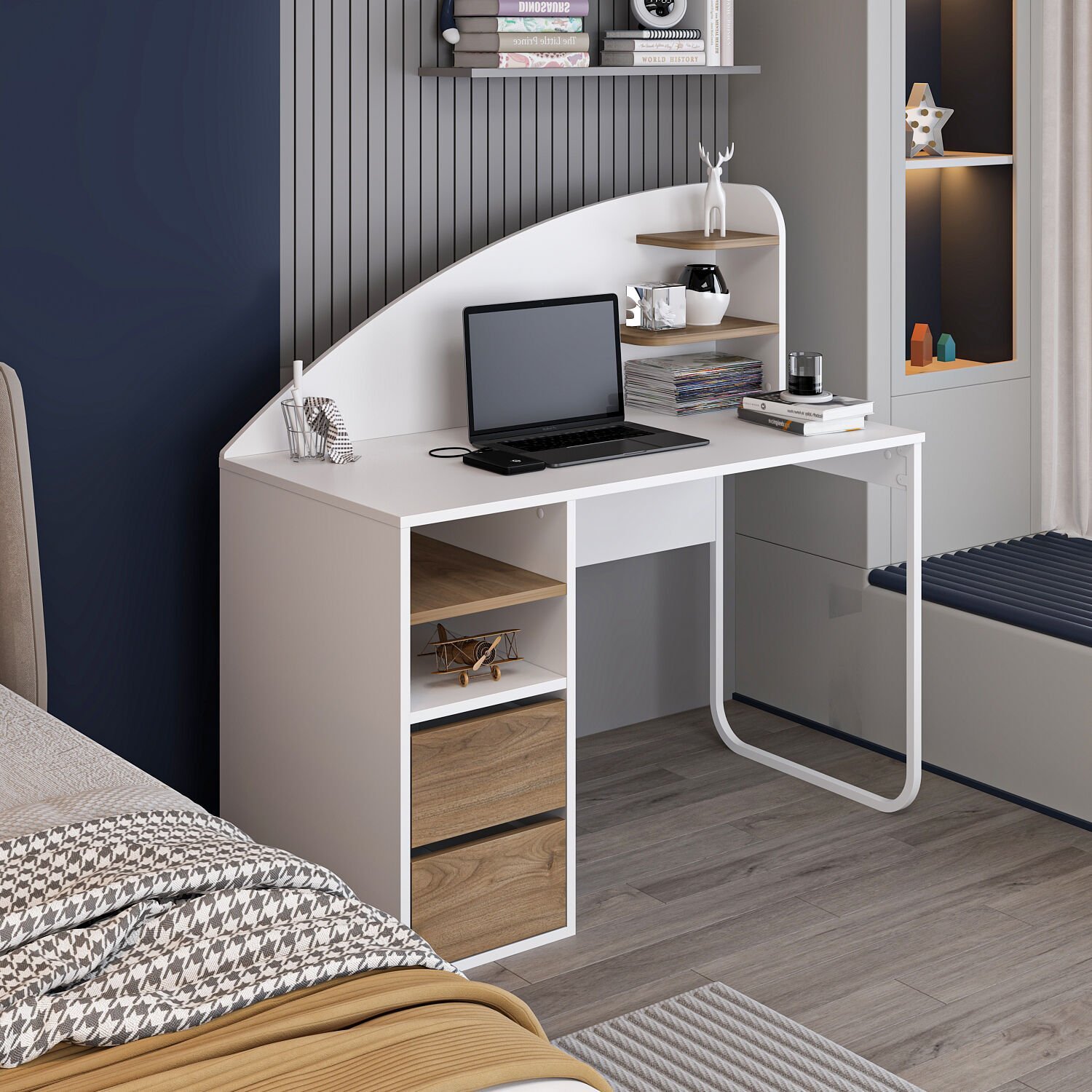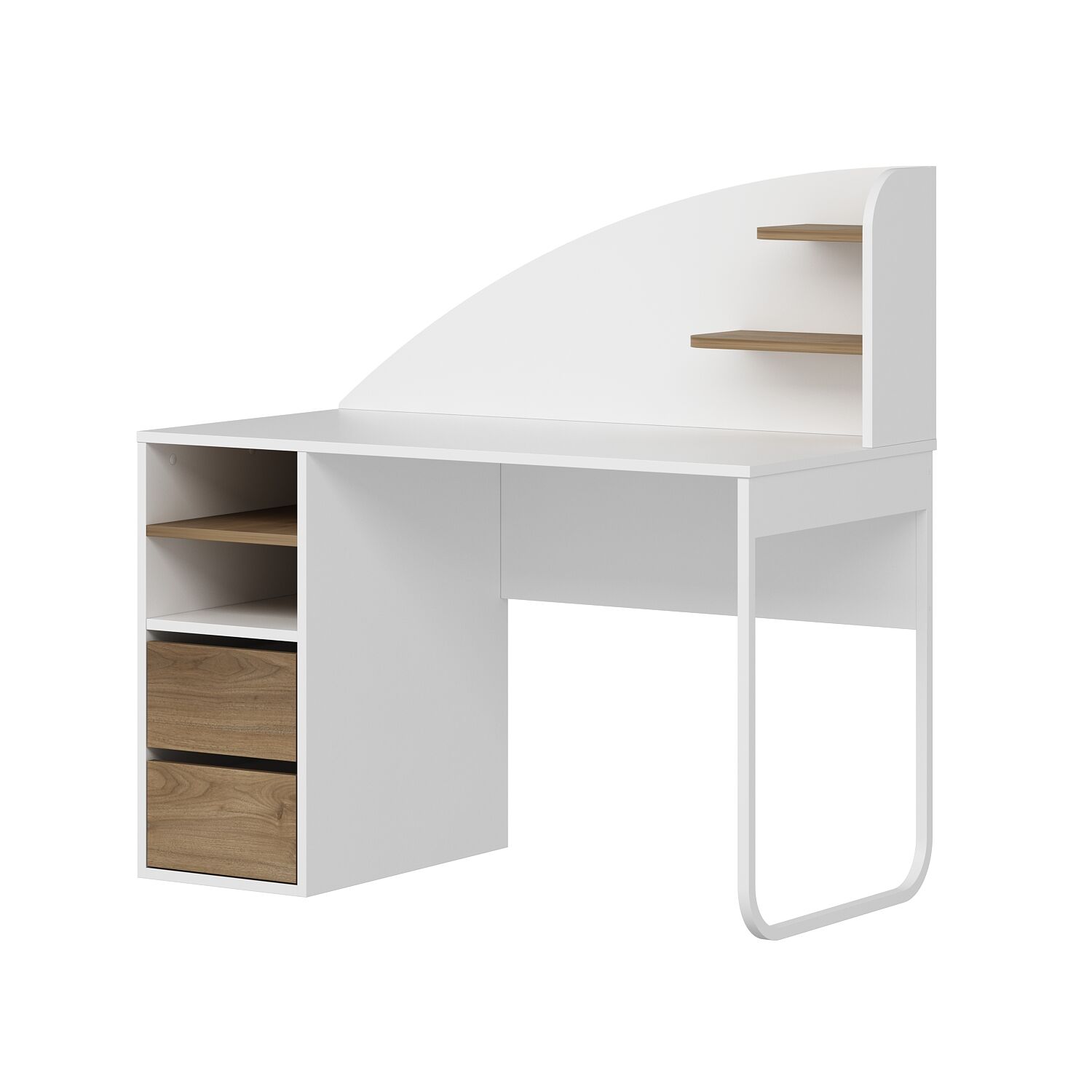 • Çekmecelerin üstünde 2 bölme + 1 raf, masanın üstünde 2 küçük raf: Düzenli depolama imkânı.