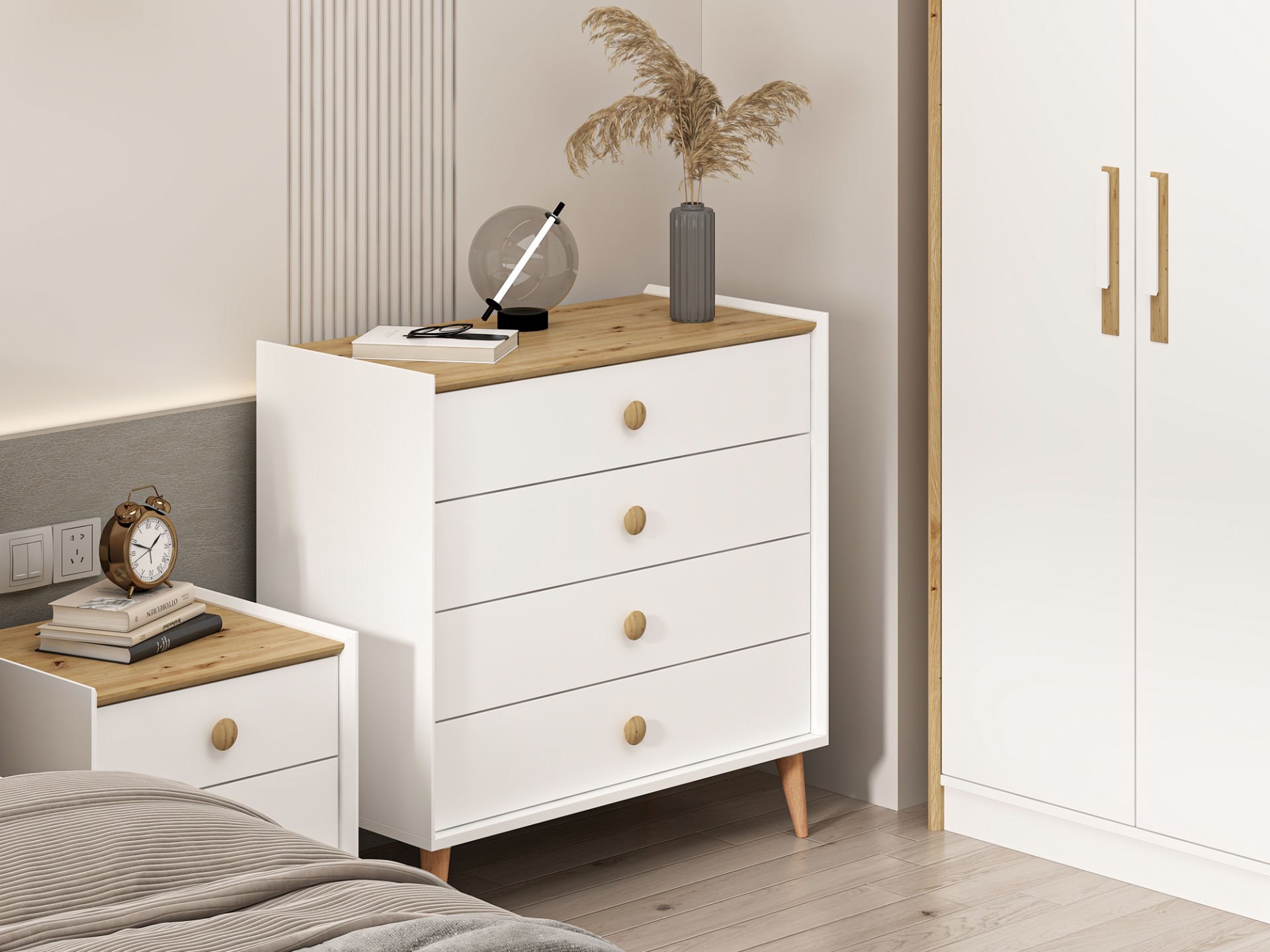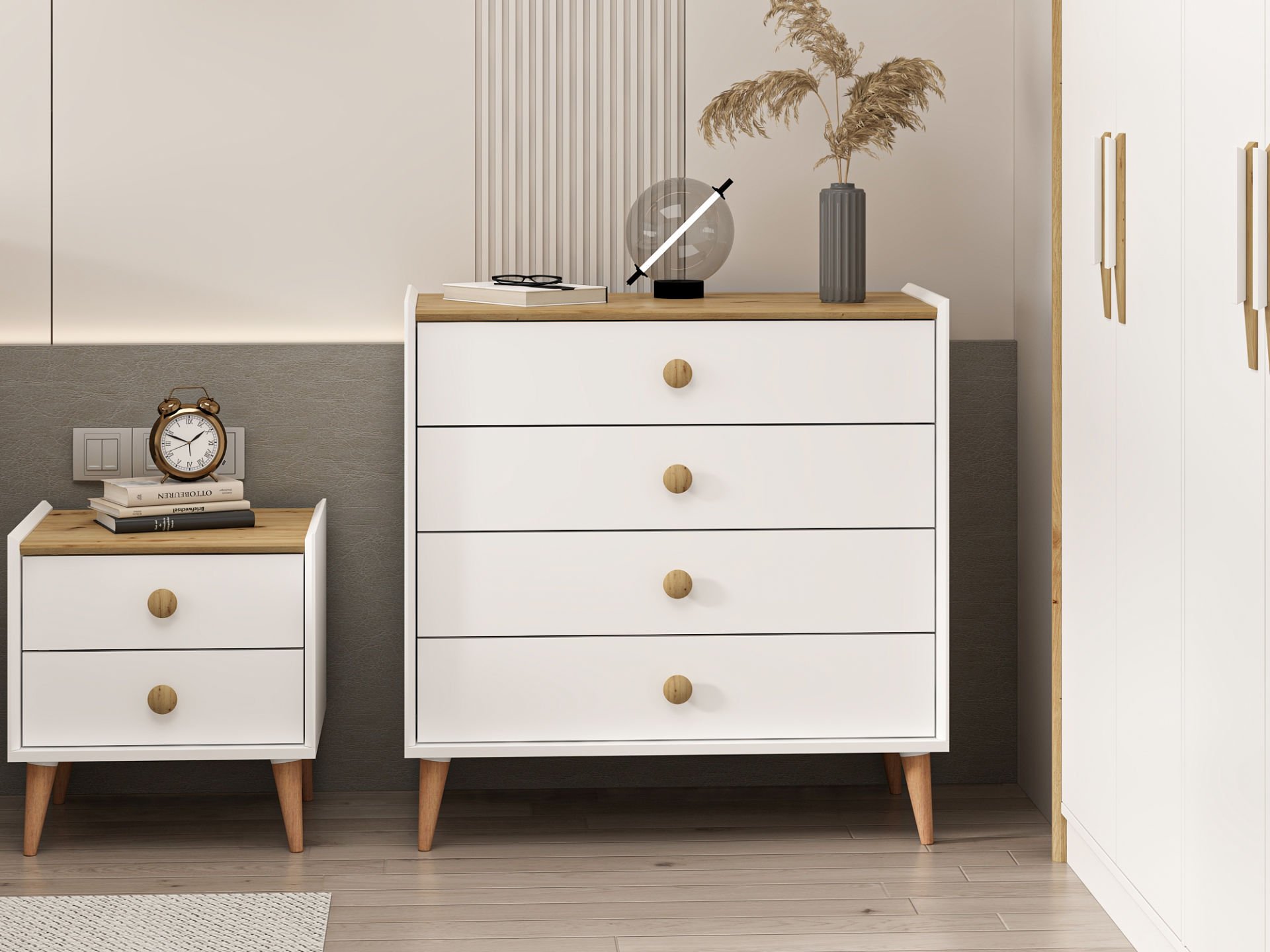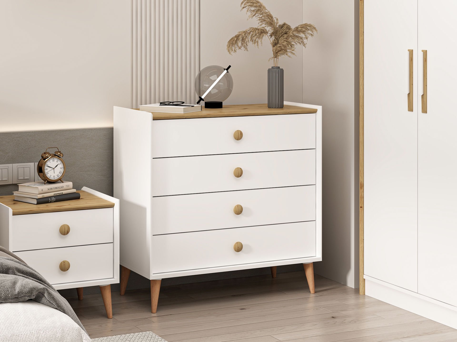 Mitra Şifonyer - Beyaz / Artisan, modern tasarımı ve fonksiyonel yapısı ile odalarınıza şıklık ve düzen katar. Beyaz ve Artisan renk kombinasyonu, hem ferah hem de doğal bir görünüm sunarak her dekorasyon tarzıyla uyum sağlar.