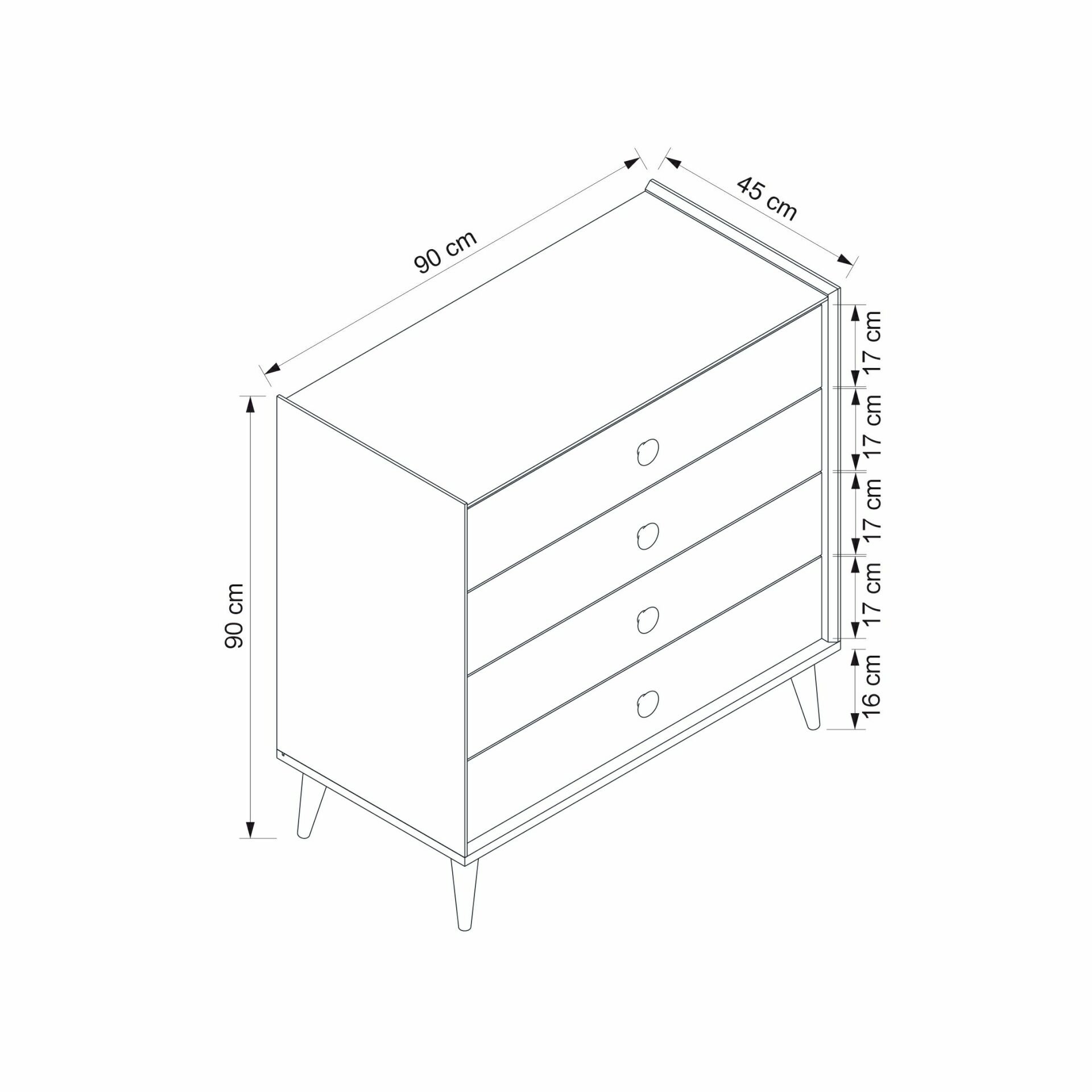 4 çekmecesi, giysi, aksesuar veya kişisel eşyalarınızı düzenli ve pratik bir şekilde saklamanıza olanak tanır. 90 cm genişlik, 45 cm derinlik ve 90 cm yükseklik ölçüleri ile kompakt ama kullanışlı bir depolama alanı sunar. 16 cm yüksekliğe sahip ayakları sayesinde zeminden yüksekte durarak temizlik kolaylığı sağlar ve şifonyere modern bir duruş kazandırır.
