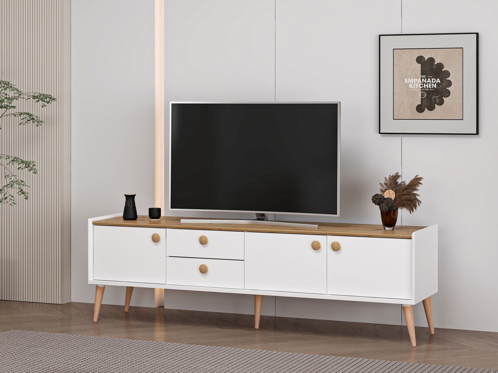 Mitra TV Ünitesi, beyazın aydınlık etkisi ve artisan ceviz tonlarının sıcaklığıyla yaşam alanlarınıza sade ve modern bir dokunuş katar. 180 cm genişliği ile farklı boyutlardaki televizyonlar için ideal alan sunarken, kapaklı bölmeleri sayesinde şık bir görünümle düzen sağlar.