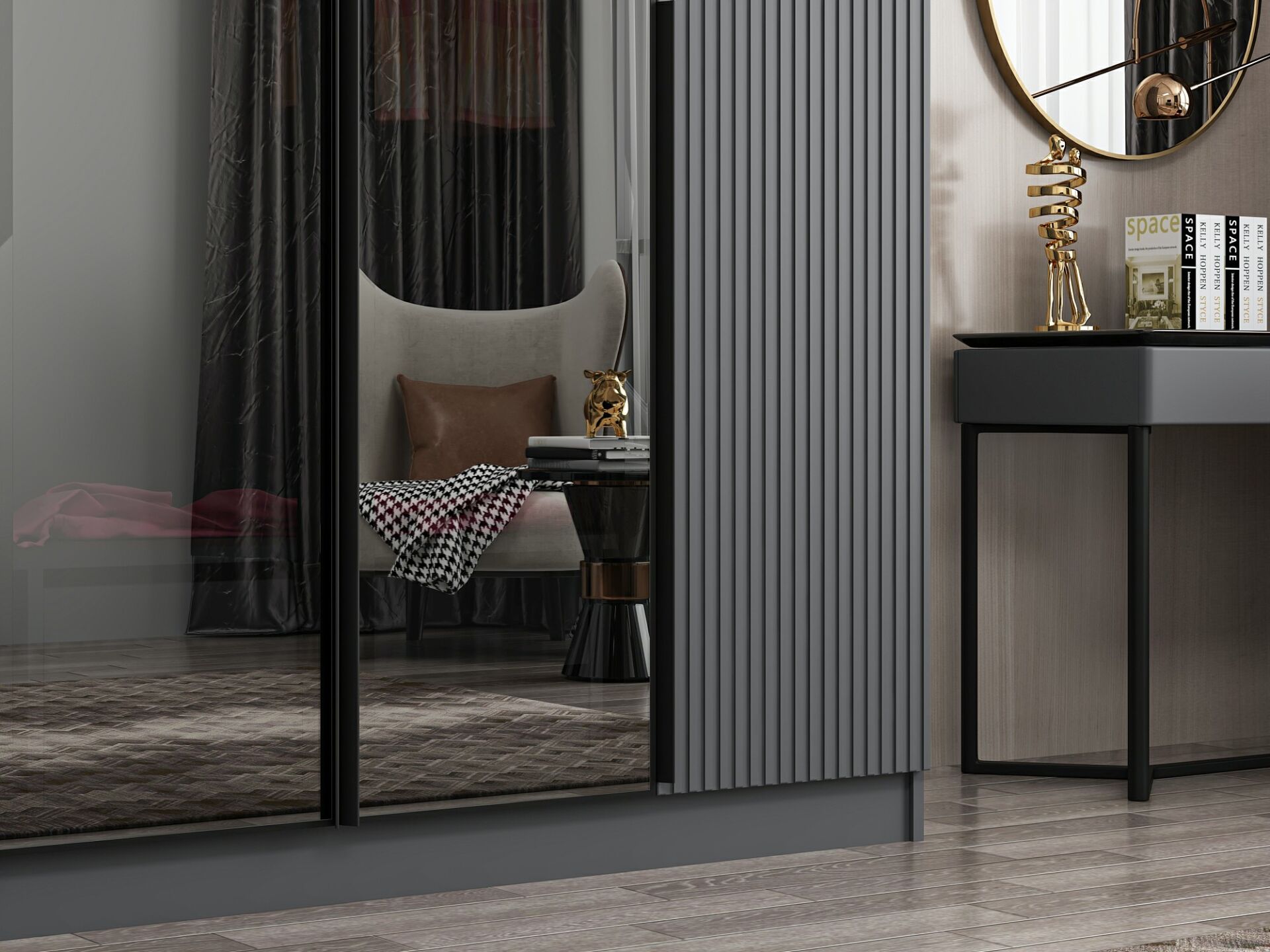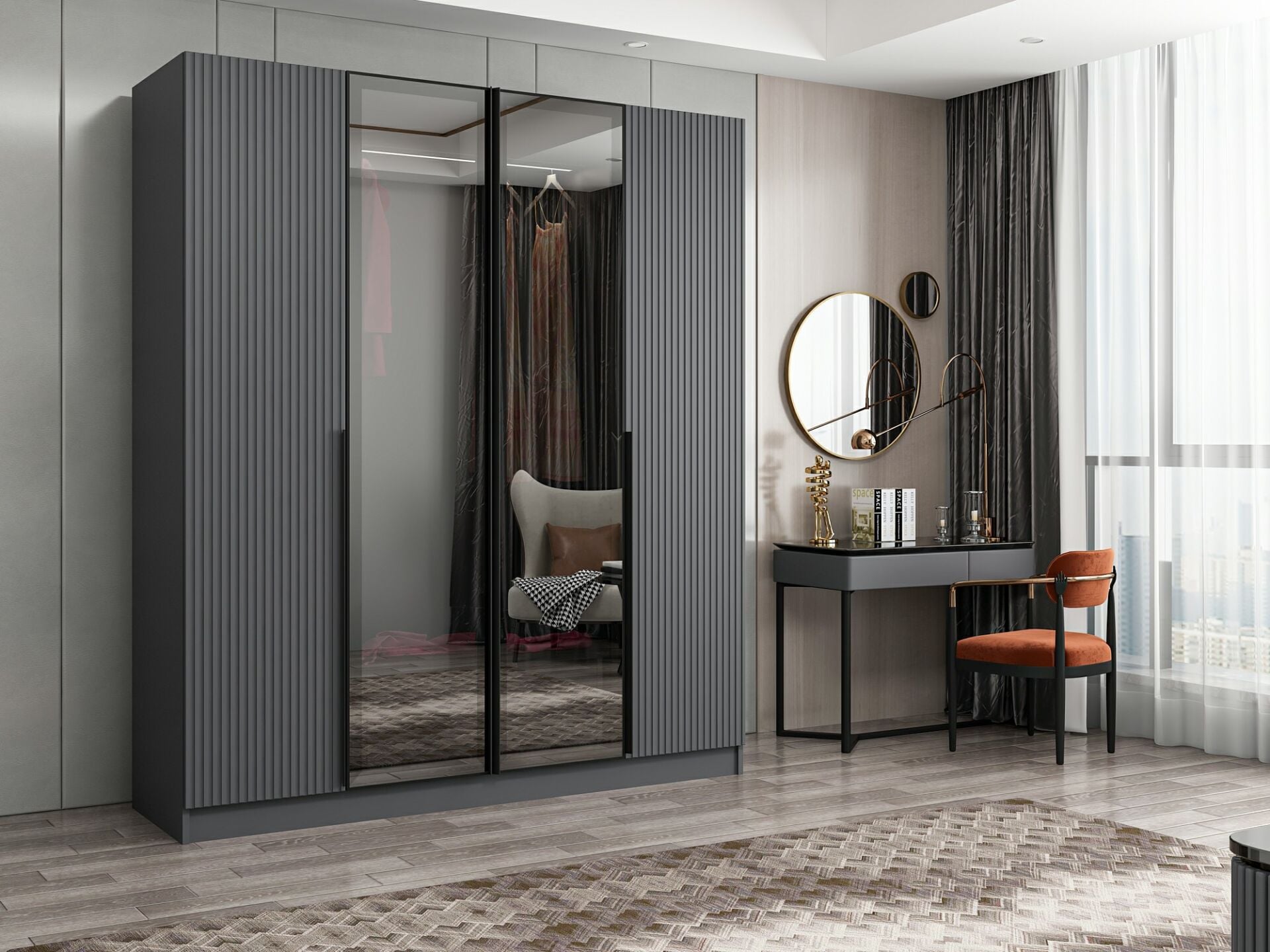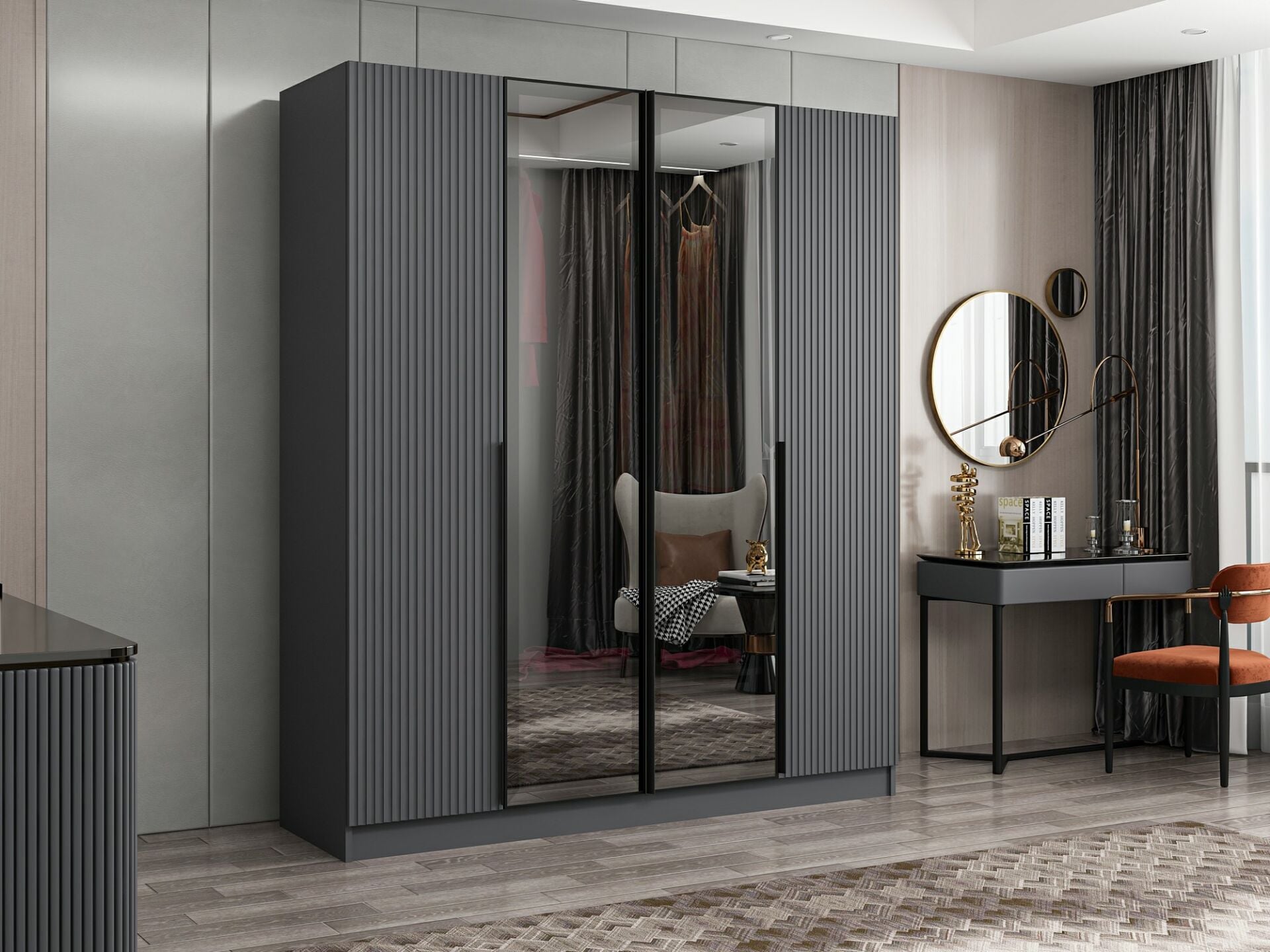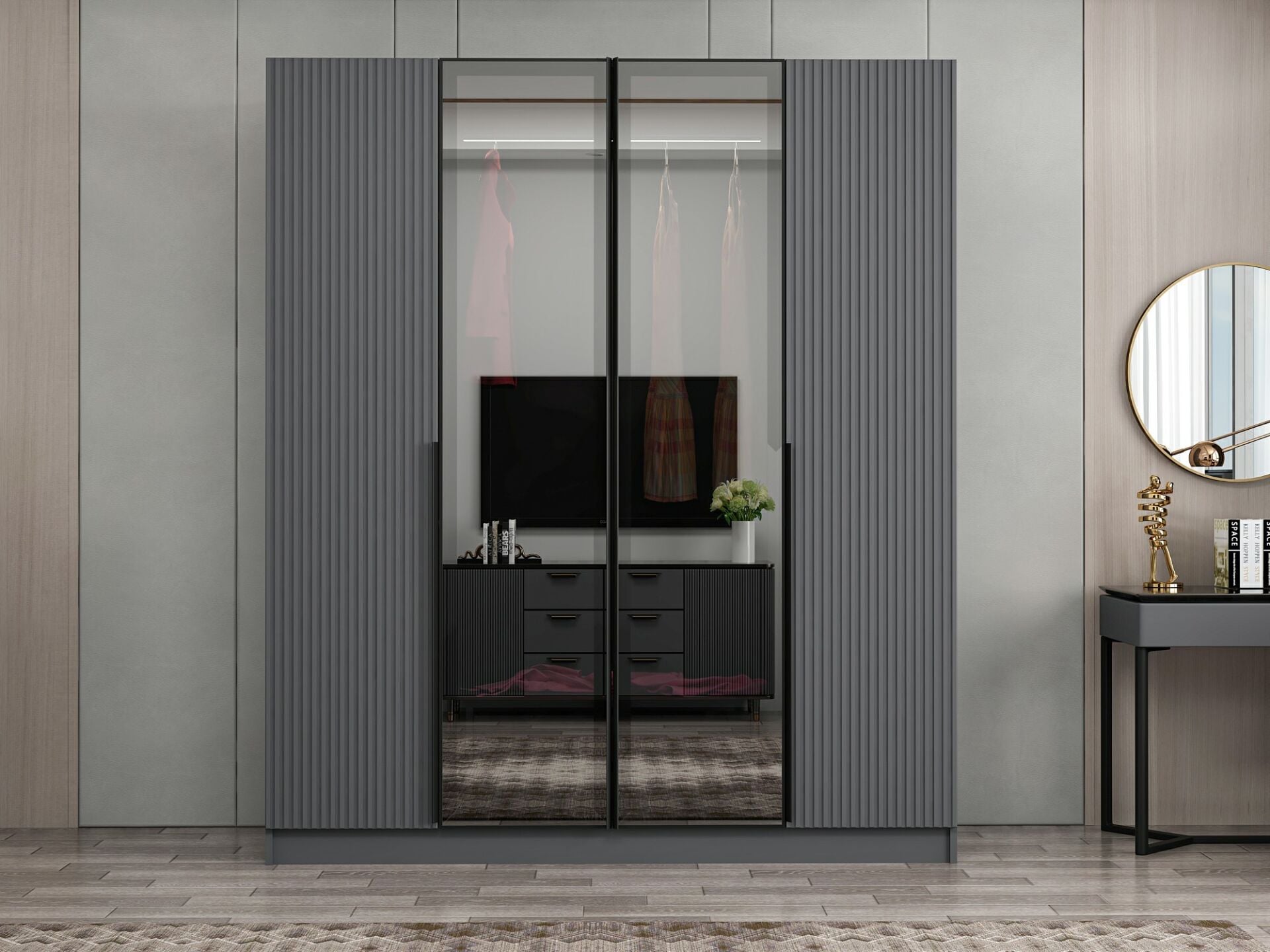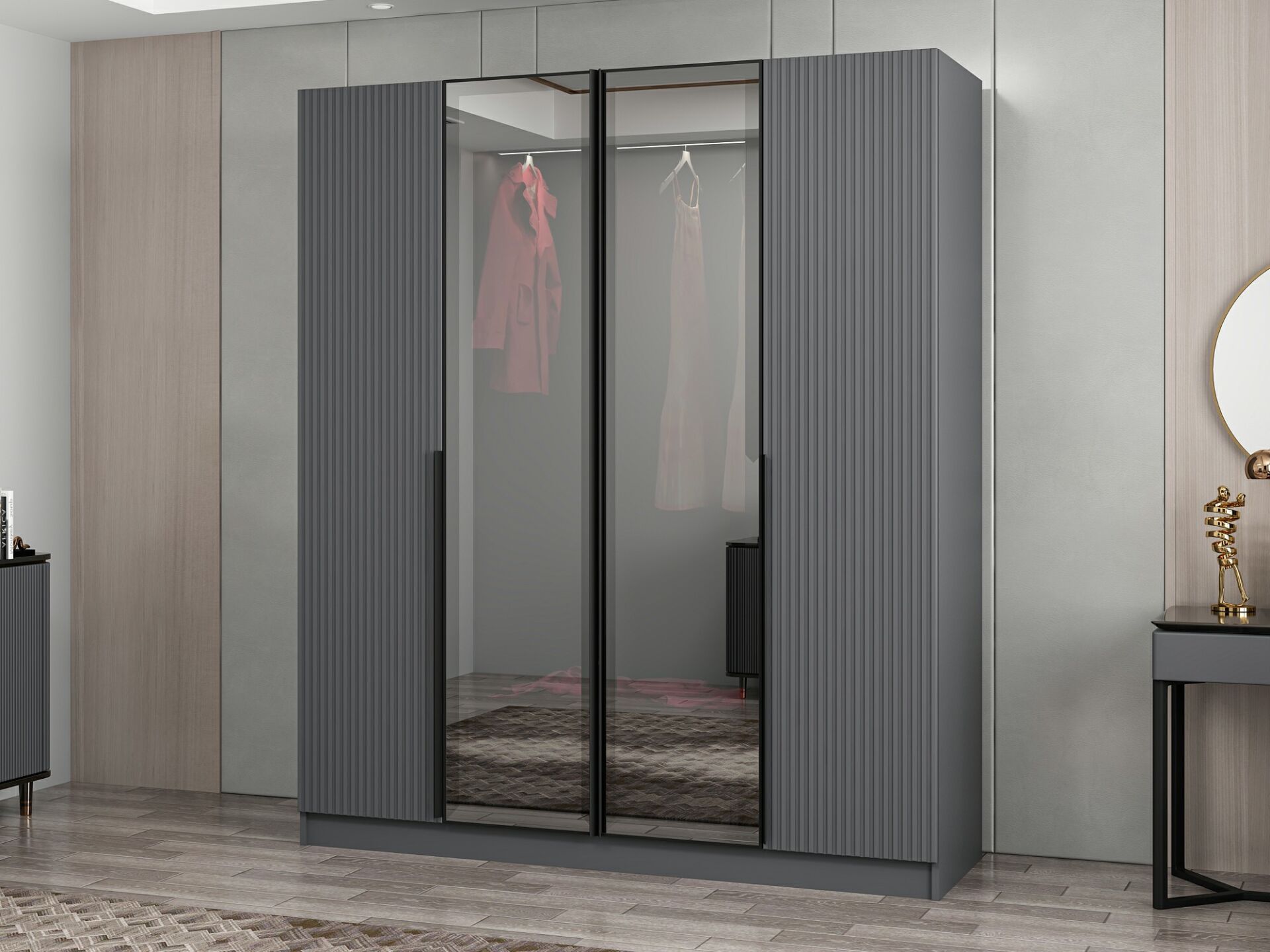 Nisa Plus 4 Kapaklı 2 Çekmece Dolap Antrasit Mebran Reflekte Cam