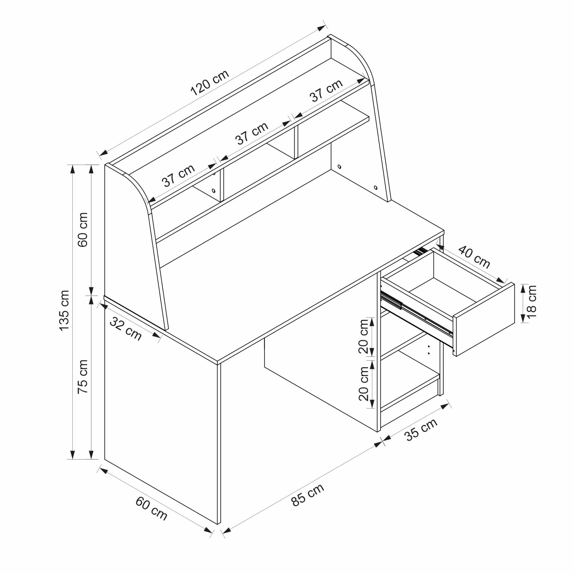 Genişlik 120 cm, derinlik 60 cm ve yükseklik 135 cm ölçüleriyle bilgisayar ve yazı çalışmaları için ideal kullanım alanı sunar. Sağlam yapısı uzun ömürlü kullanım imkânı sağlar.