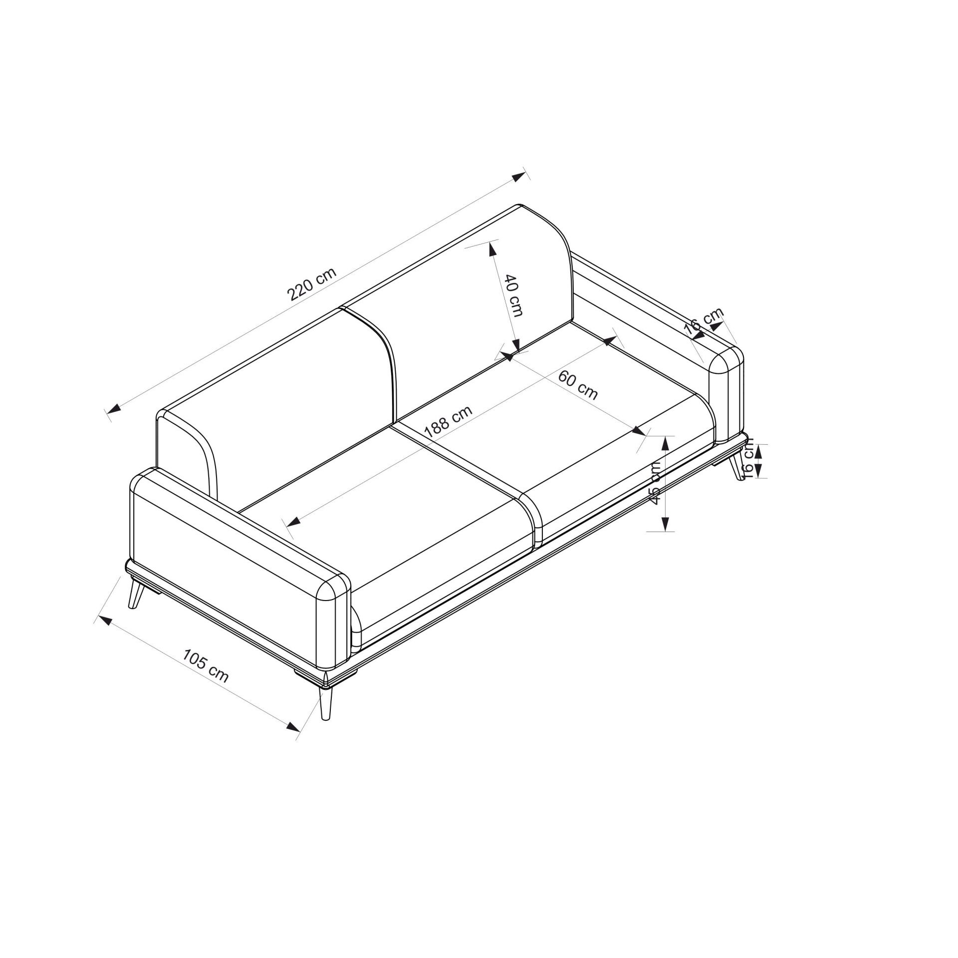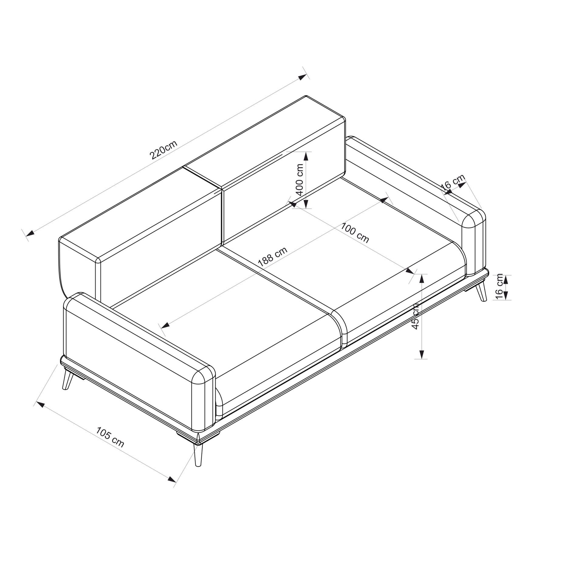 - Geniş ölçüler: 220 cm genişlik, 105 cm derinlik, 85 cm yükseklik.