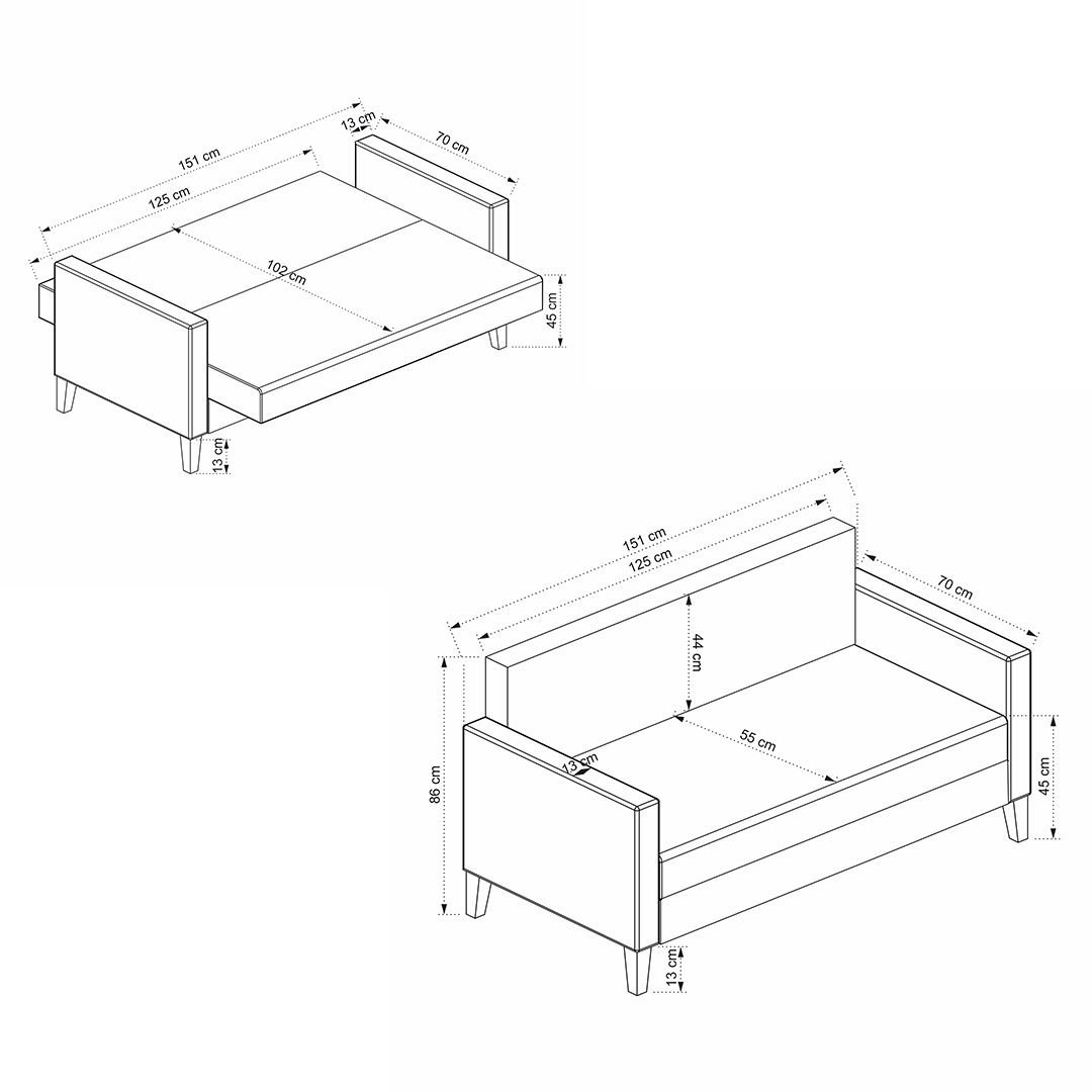 - Geniş ölçüler: 151 cm genişlik, 70 cm derinlik, 86 cm yükseklik.