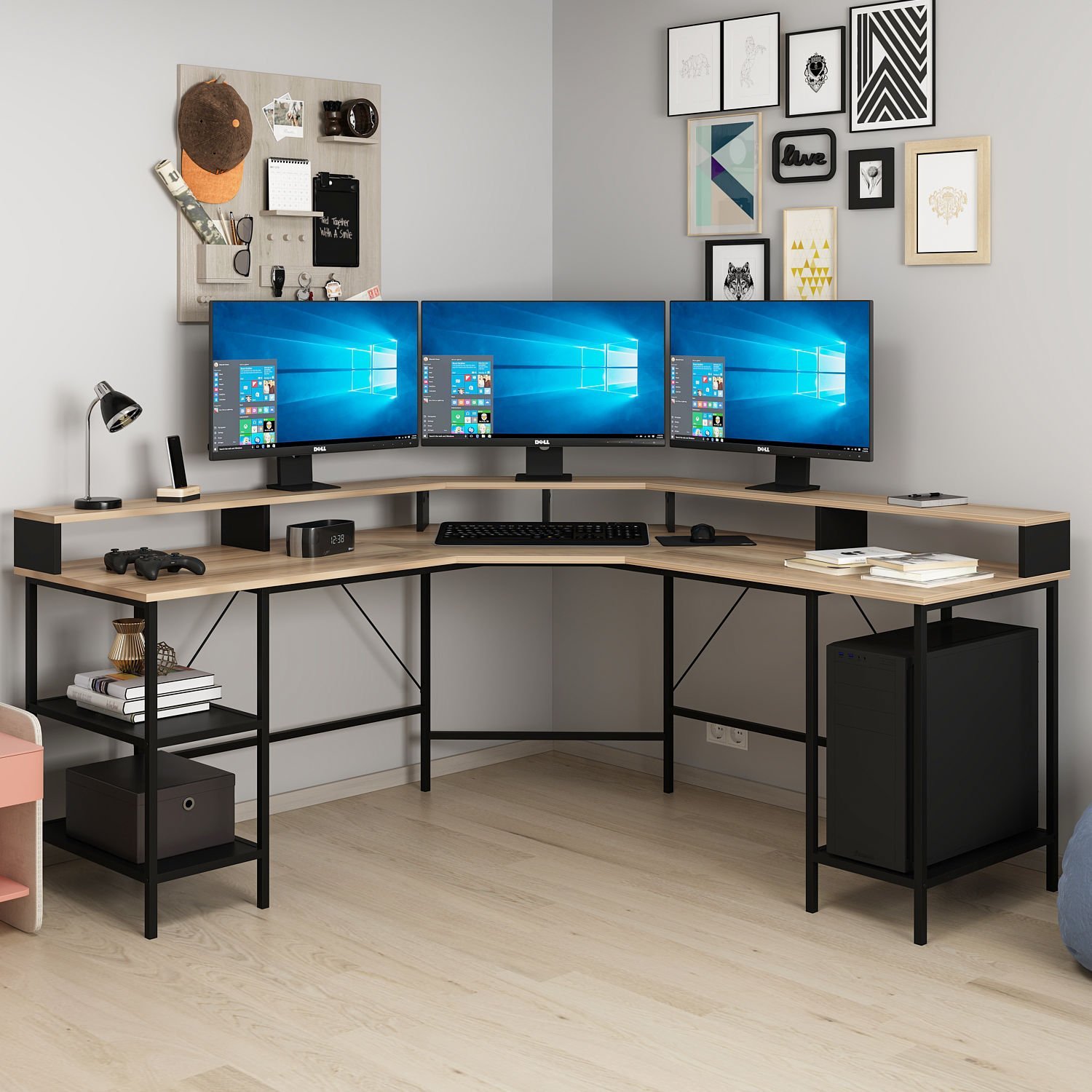 Power Monitör Raflı L Köşe Çalışma Masası - Dore