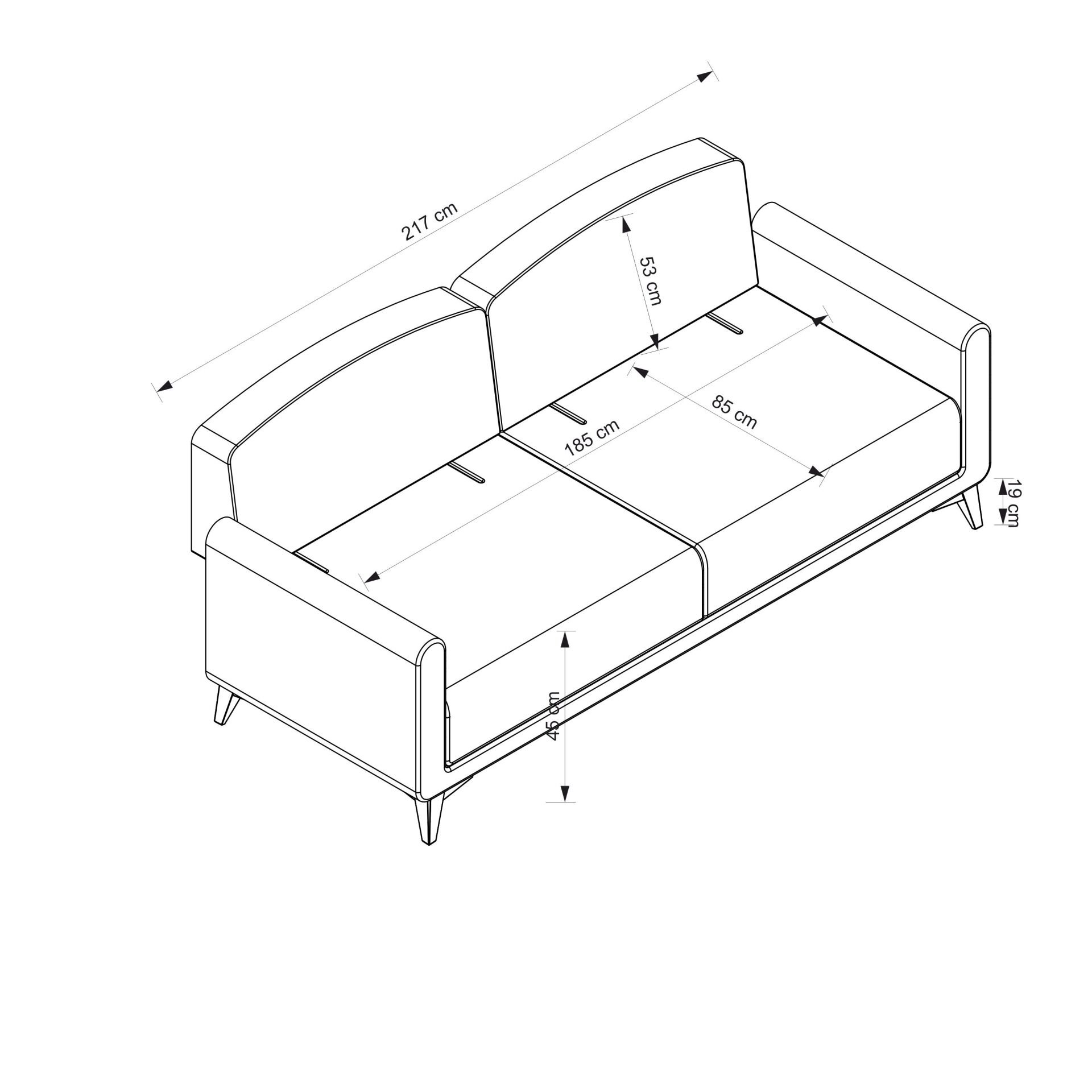 - Geniş ölçüler: 217 cm genişlik, 100 cm derinlik, 98 cm yükseklik.