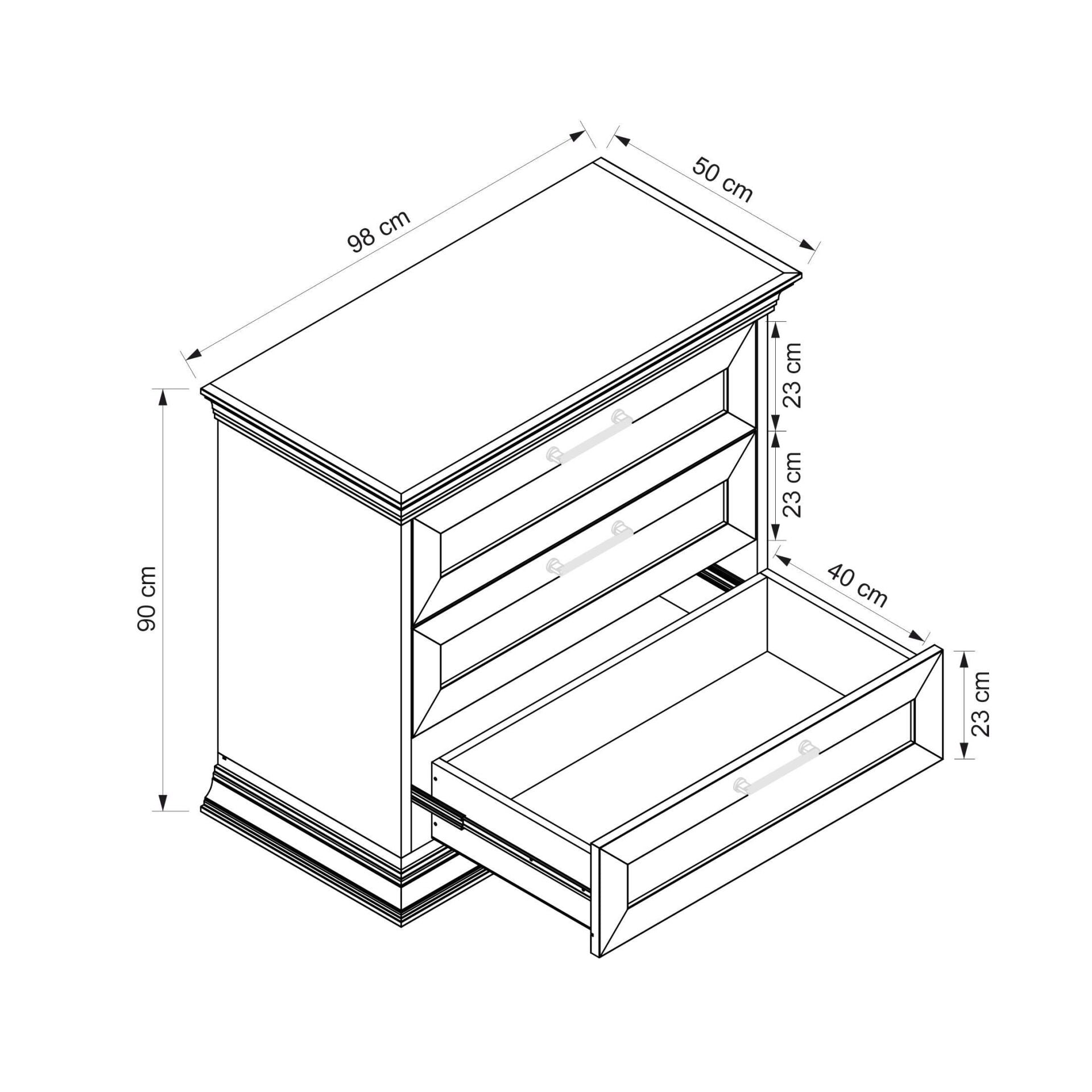 3 çekmecesi sayesinde giysi, aksesuar veya günlük kullanım eşyalarınızı düzenli ve pratik bir şekilde saklamanıza olanak tanır. 98 cm genişlik, 50 cm derinlik ve 90 cm yükseklik ölçüleri ile kompakt ama kullanışlı bir depolama alanı sunar.