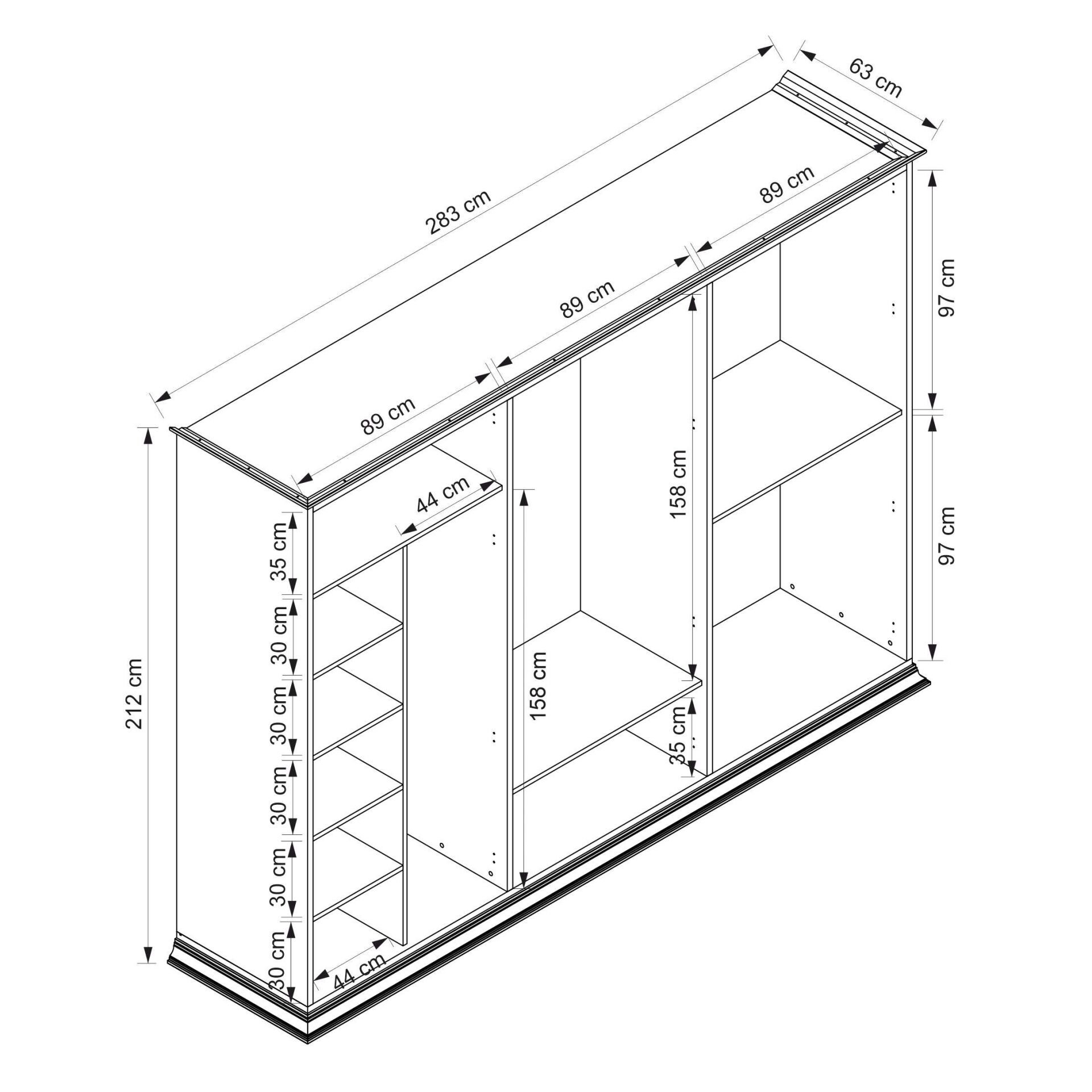 283 cm genişlik, 212 cm yükseklik ve 63 cm derinliği ile büyük bir depolama alanı sunan bu dolap, hem ev hem de ofis kullanımı için ideal bir çözümdür.
