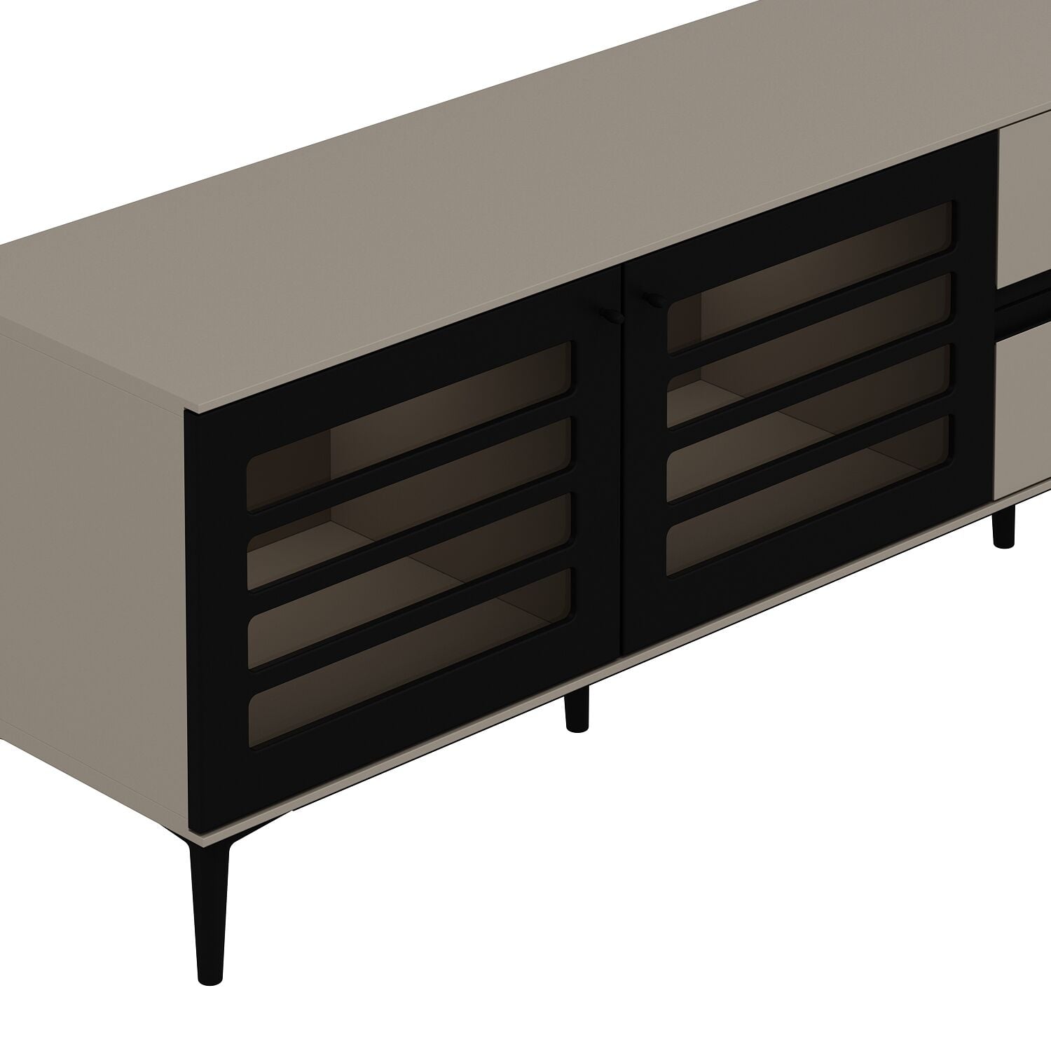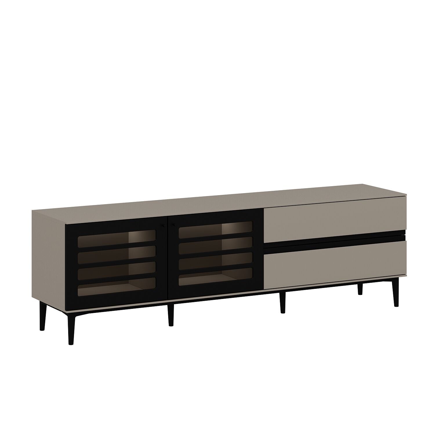 Mebran kapak teknolojisi ile üretilen cam detaylar, tasarıma modern bir hava katarken, kapaklı bölmeleriyle medya ekipmanlarınızı ve dekoratif objelerinizi düzenli bir şekilde saklamanızı sağlar. Ayaklı yapısı sayesinde temizlik kolaylığı sunar ve robot süpürgeyle uyumludur. Kumtaşı siyah tonu, iç mekanlara sofistike bir dokunuş eklerken diğer mobilyalarla kolayca uyum sağlar.